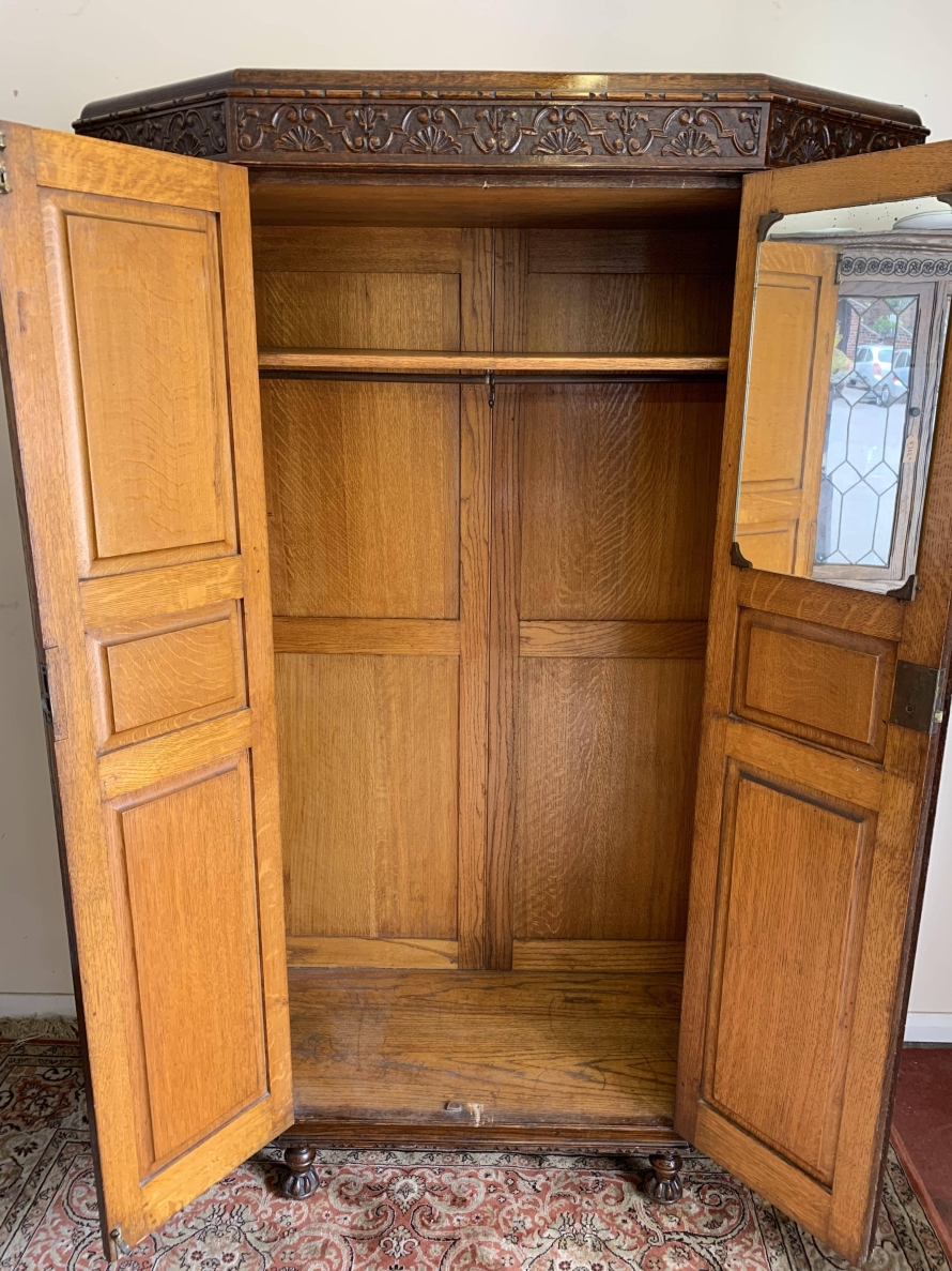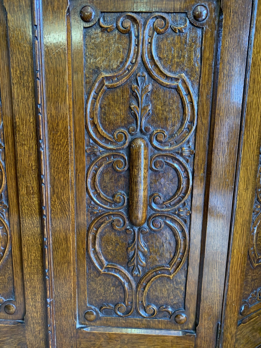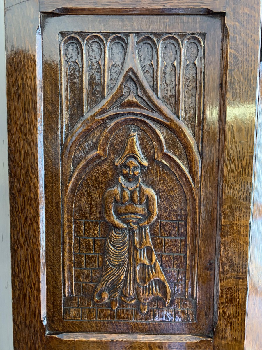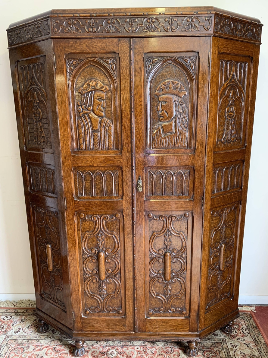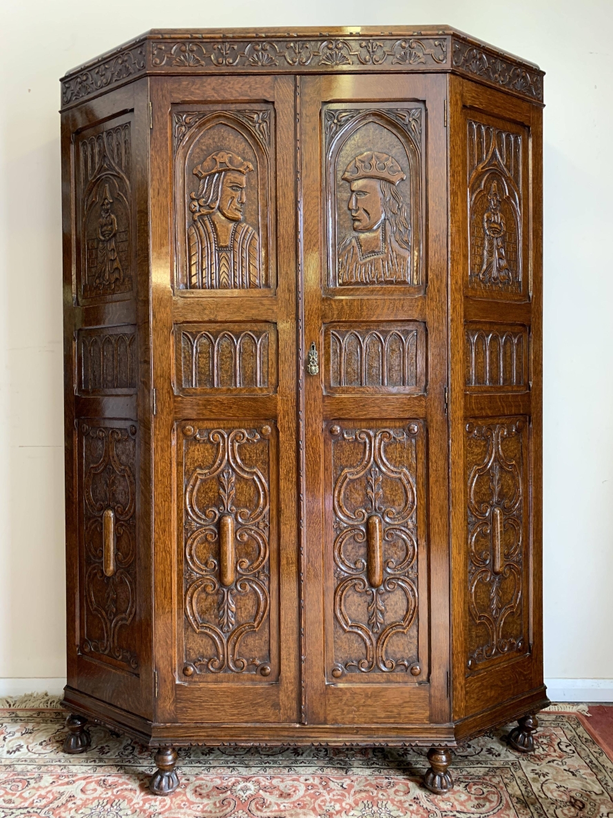 we are delighted to offer this exceptional quality solid oak item of English furniture. The cabinet has a removable heavily carved canted cornice, below are a central pair of doors flanked by a pair of panels. Both the doors and the panels have carved figures to the top, central Gothic arch window carvings with finely carved floral carvings below. The doors open to reveal a brass hanging rail below a wooden shelf, behind the right-hand door is a dressing mirror. This stunning item of furniture star stands on four carved turned feet to the front. Please note this item is made entirely of solid oak.