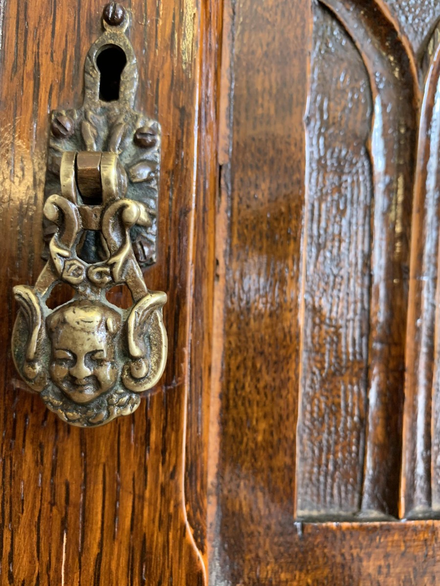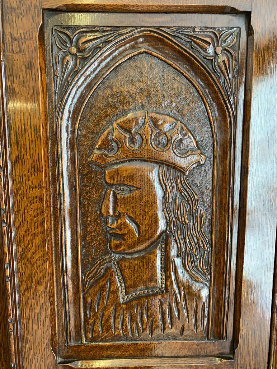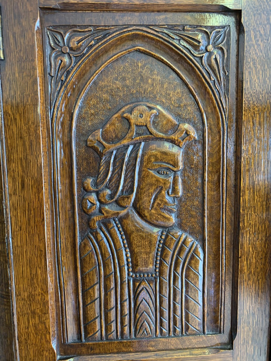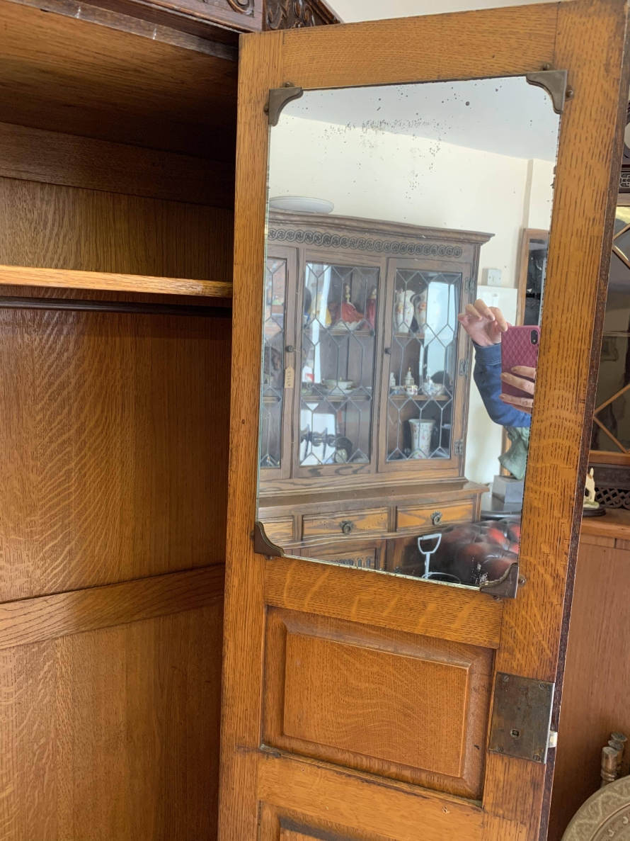 we are delighted to offer this exceptional quality solid oak item of English furniture. The cabinet has a removable heavily carved canted cornice, below are a central pair of doors flanked by a pair of panels. Both the doors and the panels have carved figures to the top, central Gothic arch window carvings with finely carved floral carvings below. The doors open to reveal a brass hanging rail below a wooden shelf, behind the right-hand door is a dressing mirror. This stunning item of furniture star stands on four carved turned feet to the front. Please note this item is made entirely of solid oak.