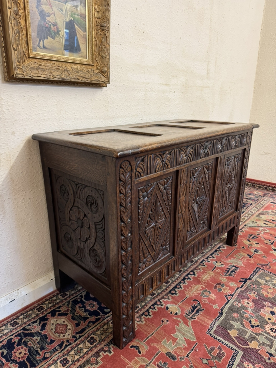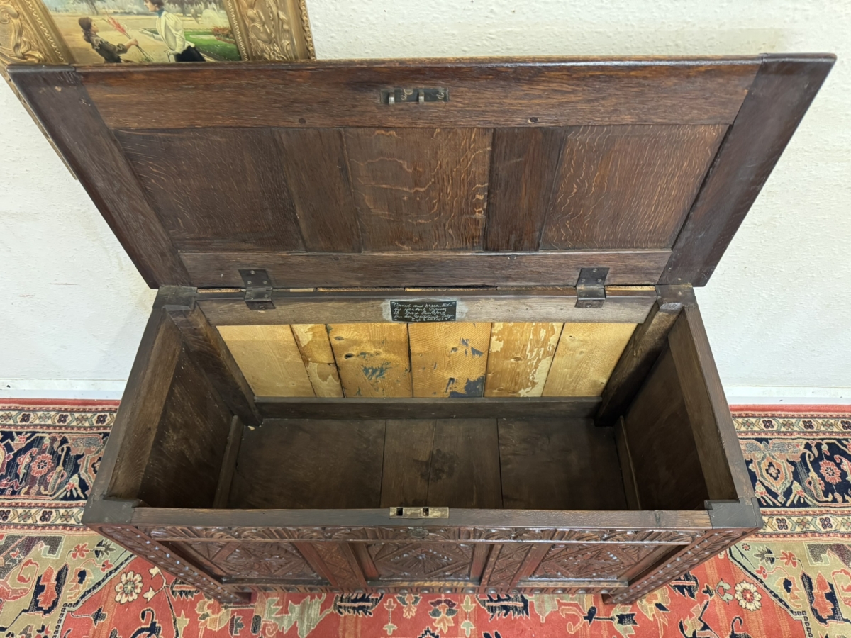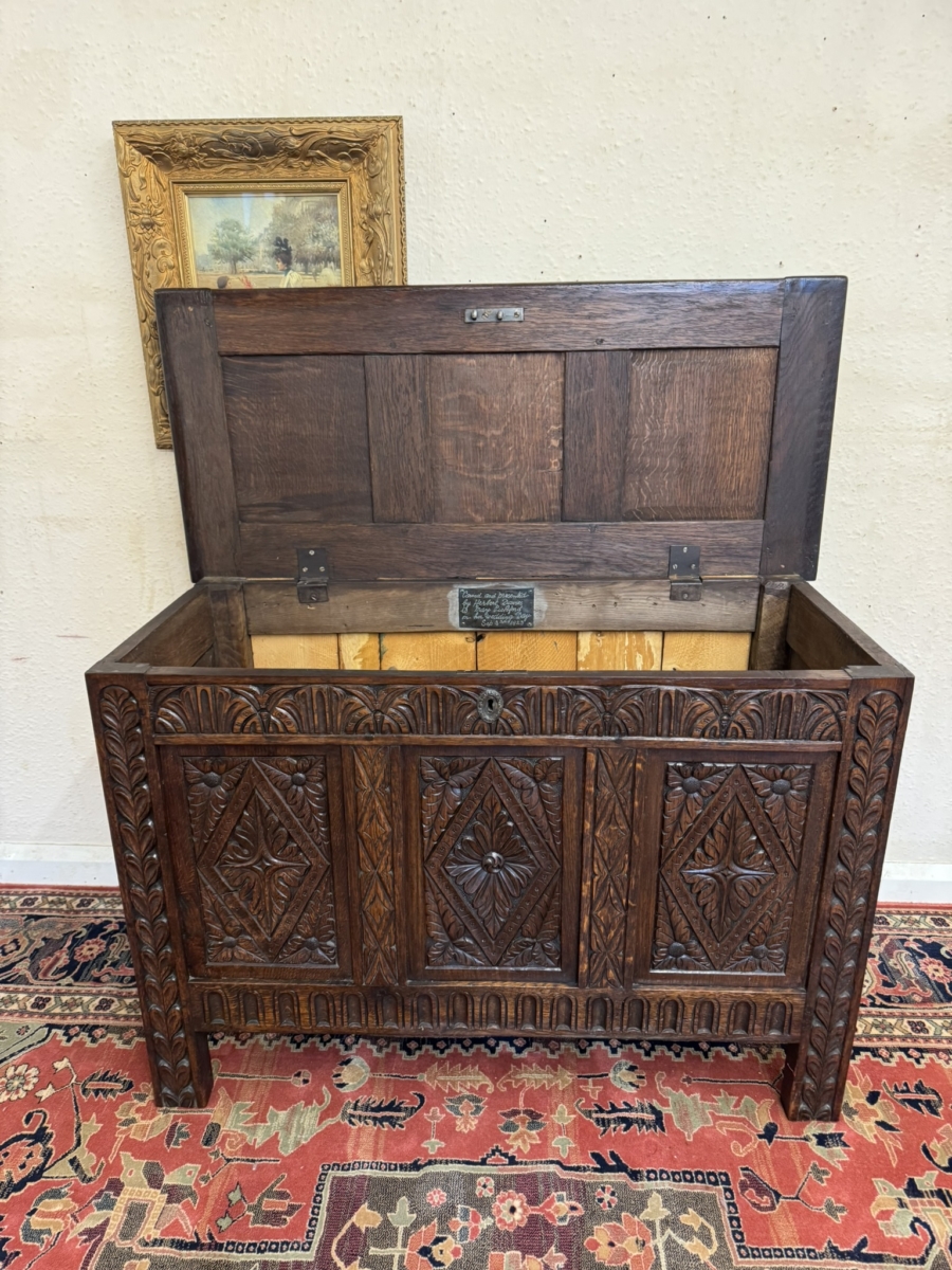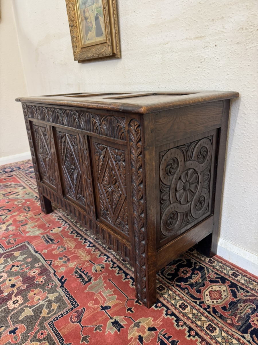 This fabulous storage chest dates circa 1880 and is in excellent condition. The three panelled lift up lid opens to reveal ample storage. The front and sides are elaborately carved. The chest stands on traditional block feet.