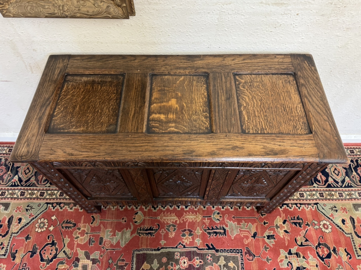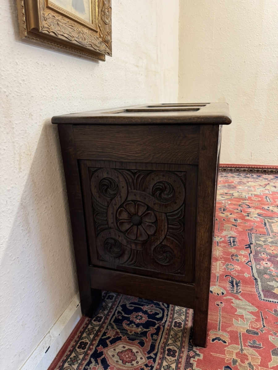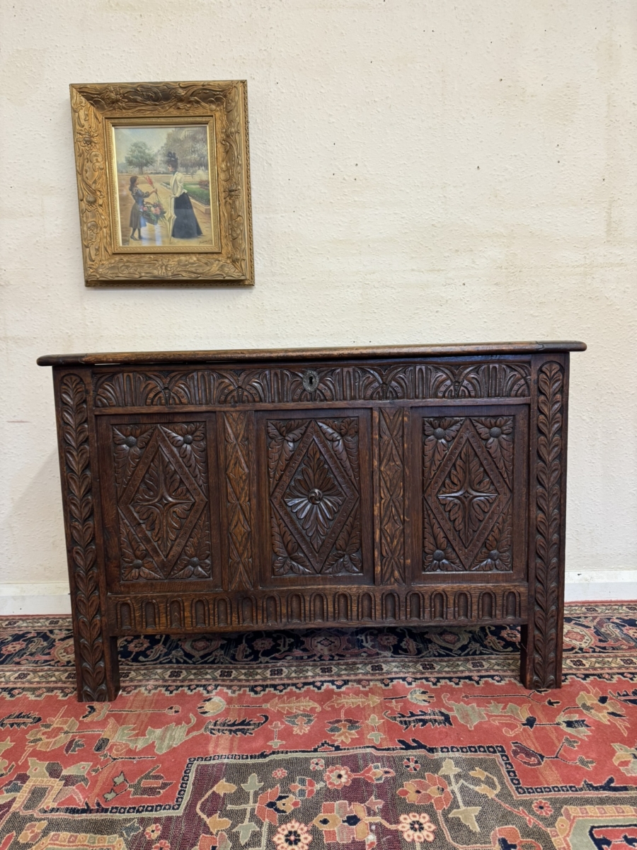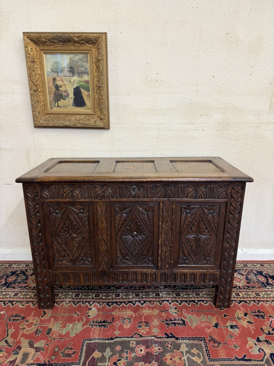 This fabulous storage chest dates circa 1880 and is in excellent condition. The three panelled lift up lid opens to reveal ample storage. The front and sides are elaborately carved. The chest stands on traditional block feet.