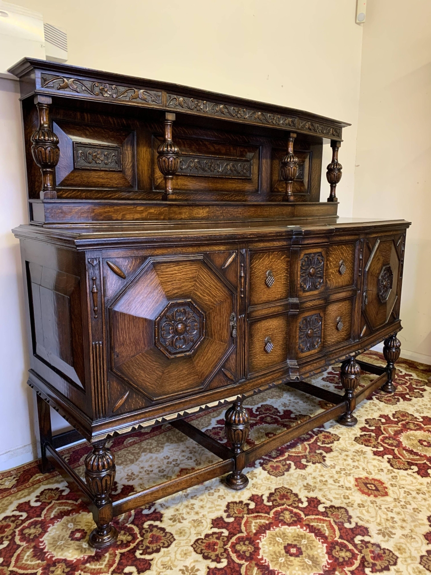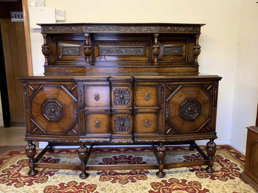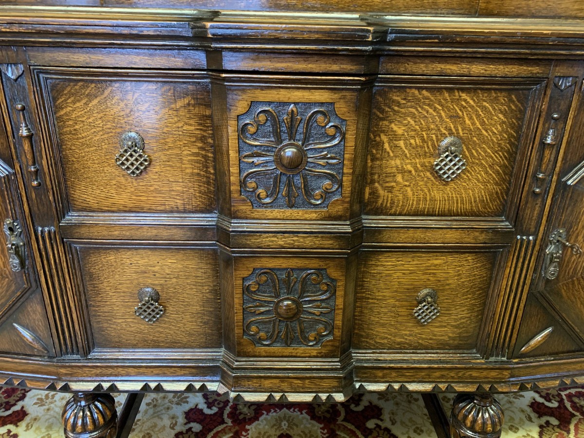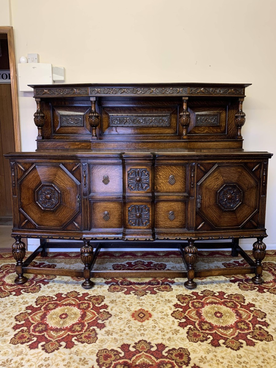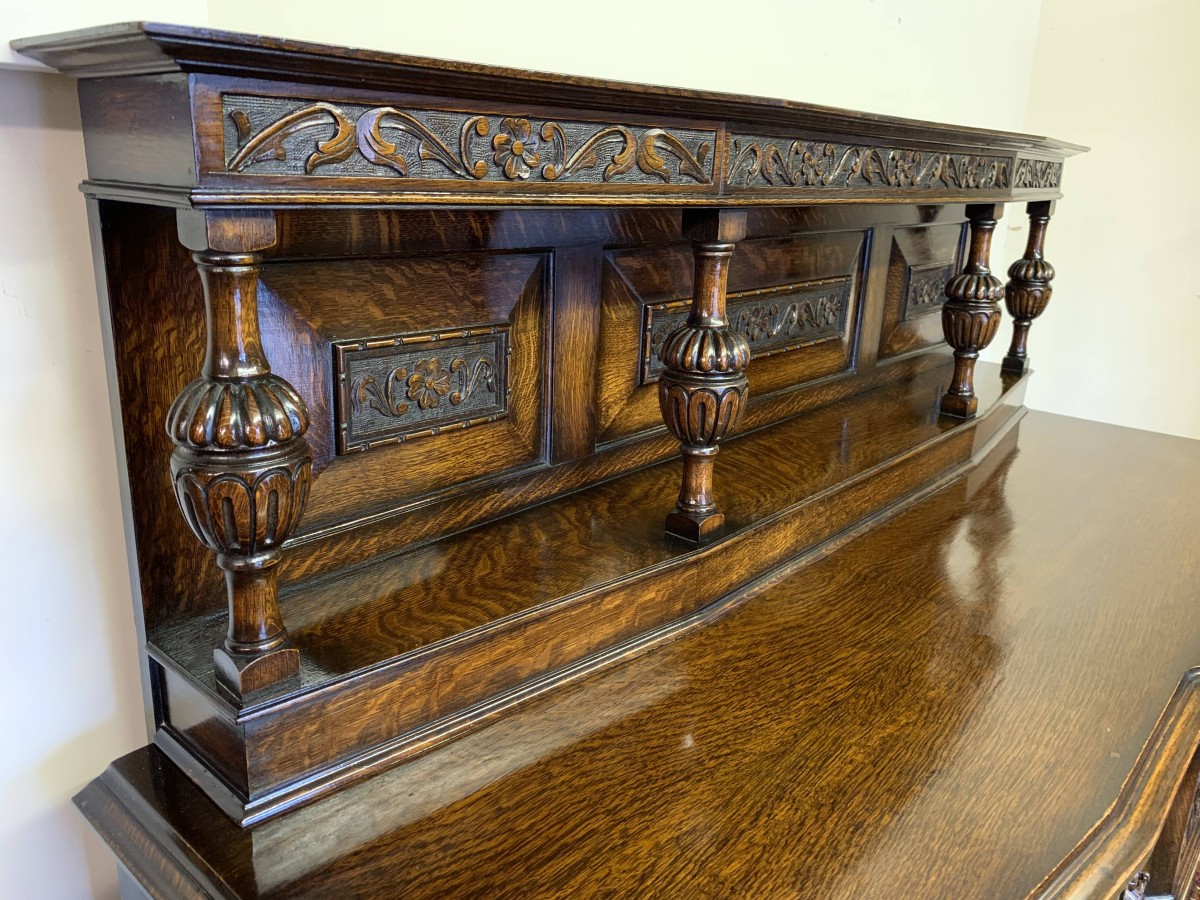 The sideboard dates circa 1920 and is made in fabulous quality carved oak. The back being carved throughout with four bulbous carved supports. The base has two deep central drawers, the drawers having decorative central carvings and two brass handles. The drawers are flanked by a pair of lockable panelled doors, the doors having decorative central carvings. Having four bulbous carved legs, stretcher supports and standing on four turned feet.