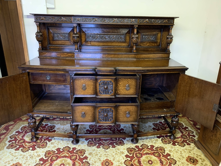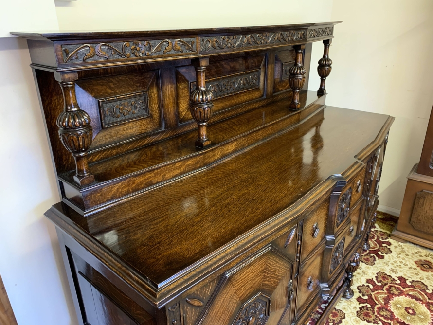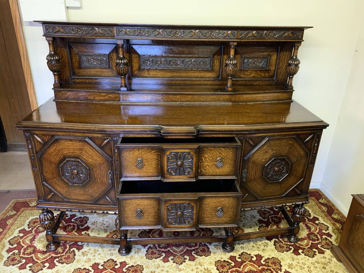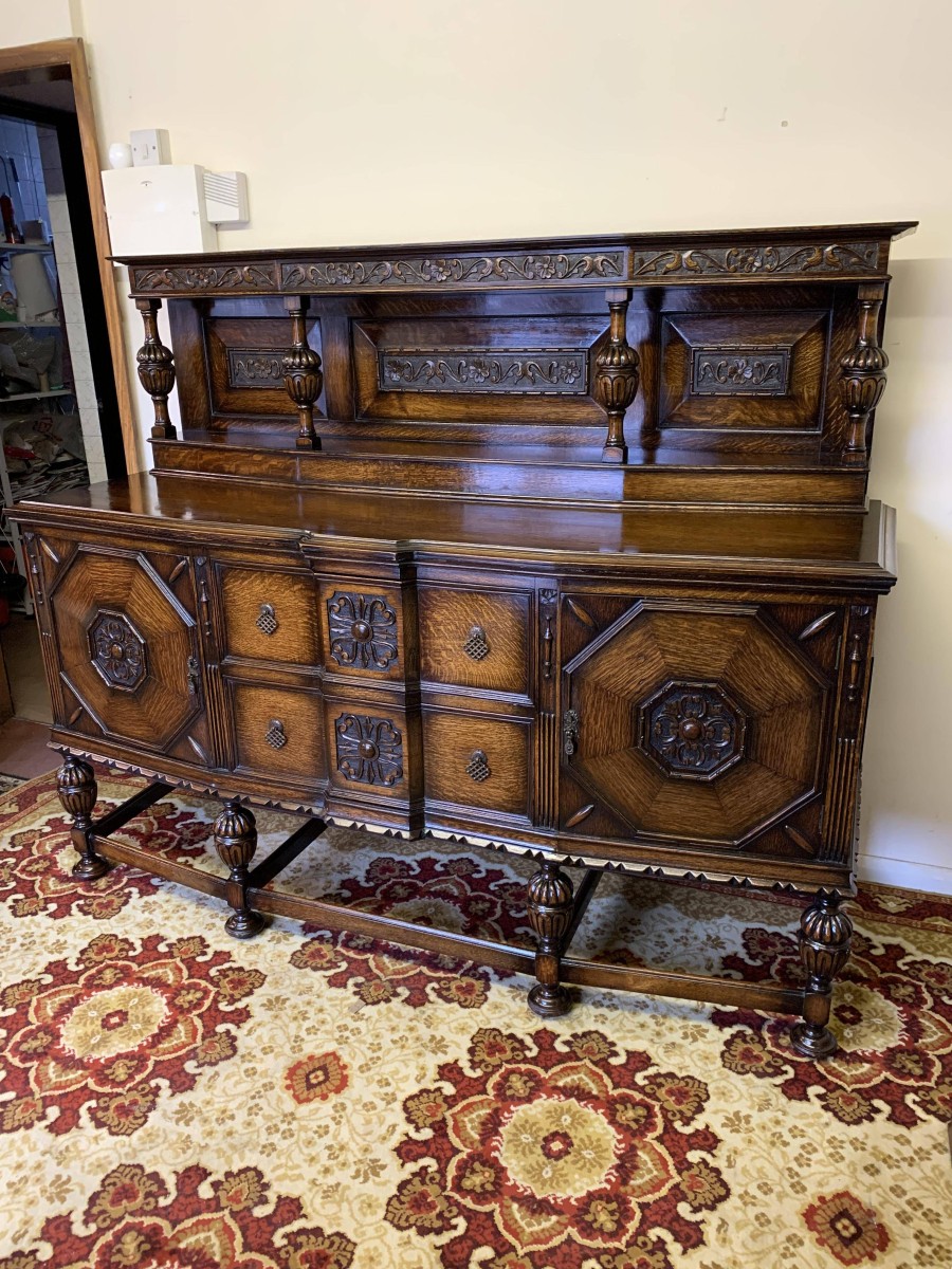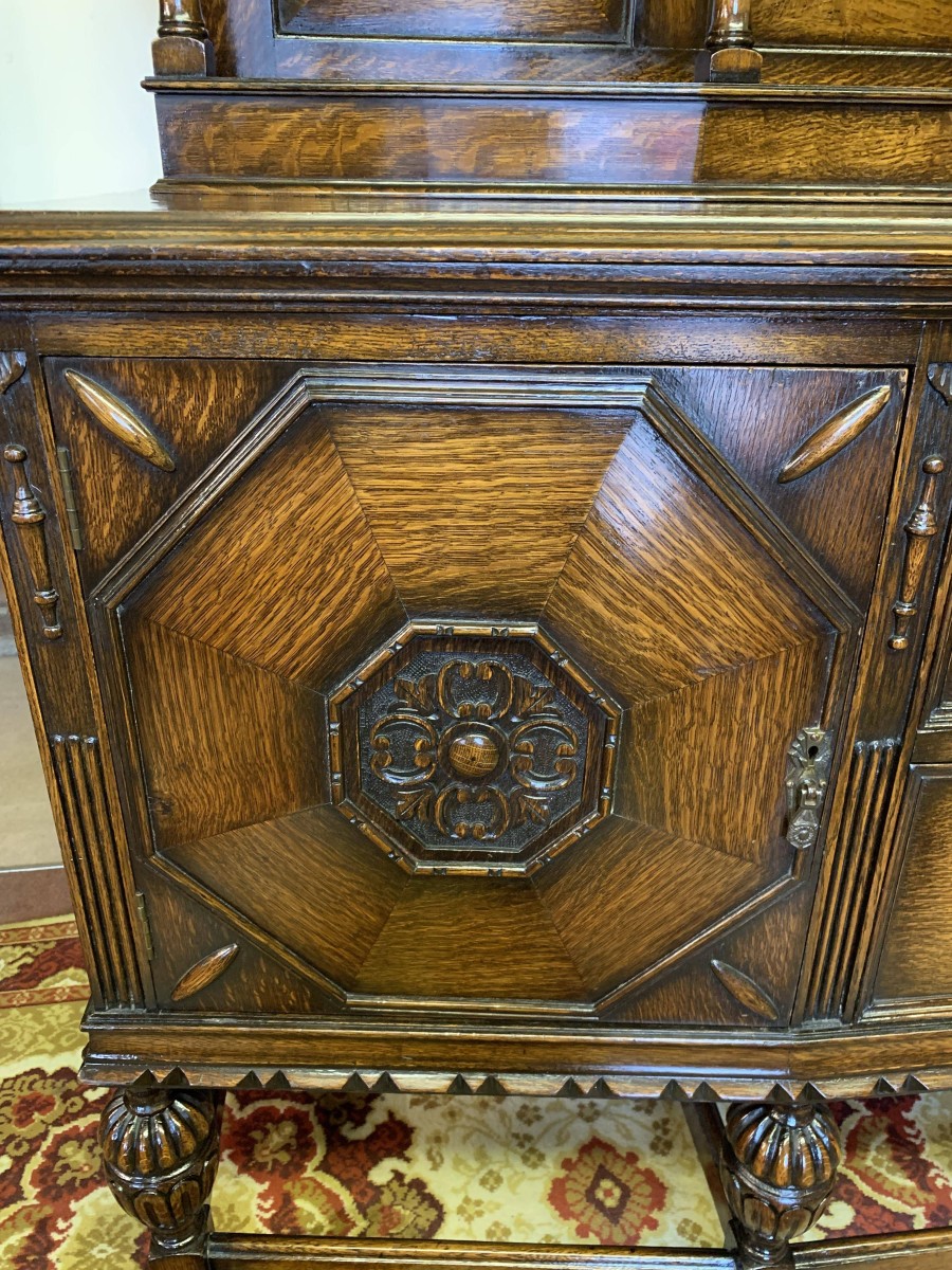 The sideboard dates circa 1920 and is made in fabulous quality carved oak. The back being carved throughout with four bulbous carved supports. The base has two deep central drawers, the drawers having decorative central carvings and two brass handles. The drawers are flanked by a pair of lockable panelled doors, the doors having decorative central carvings. Having four bulbous carved legs, stretcher supports and standing on four turned feet.