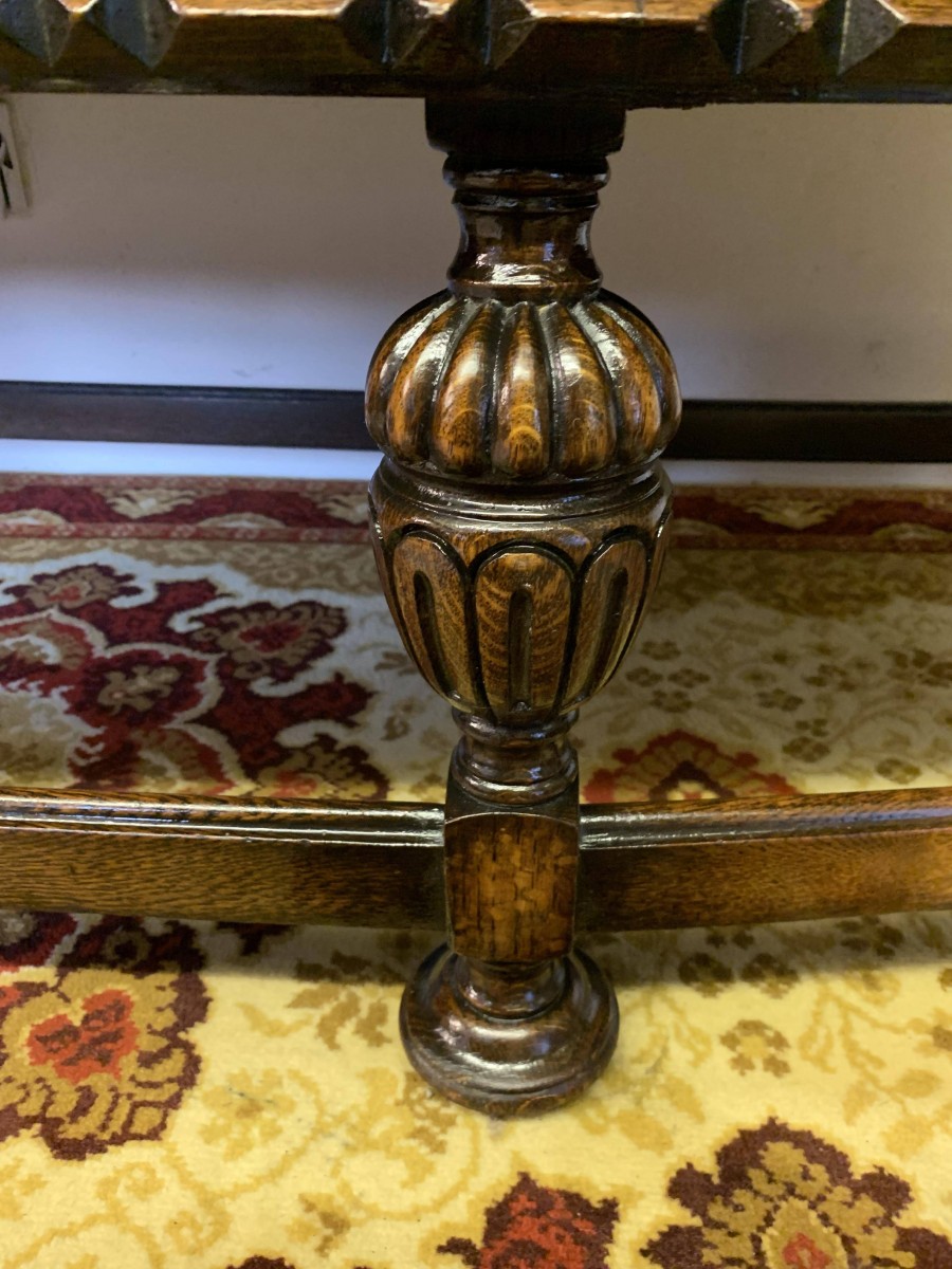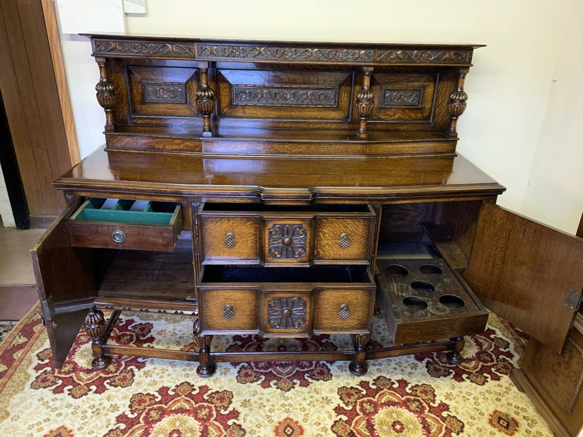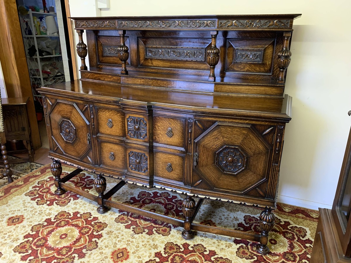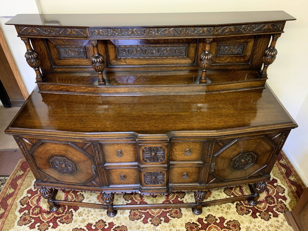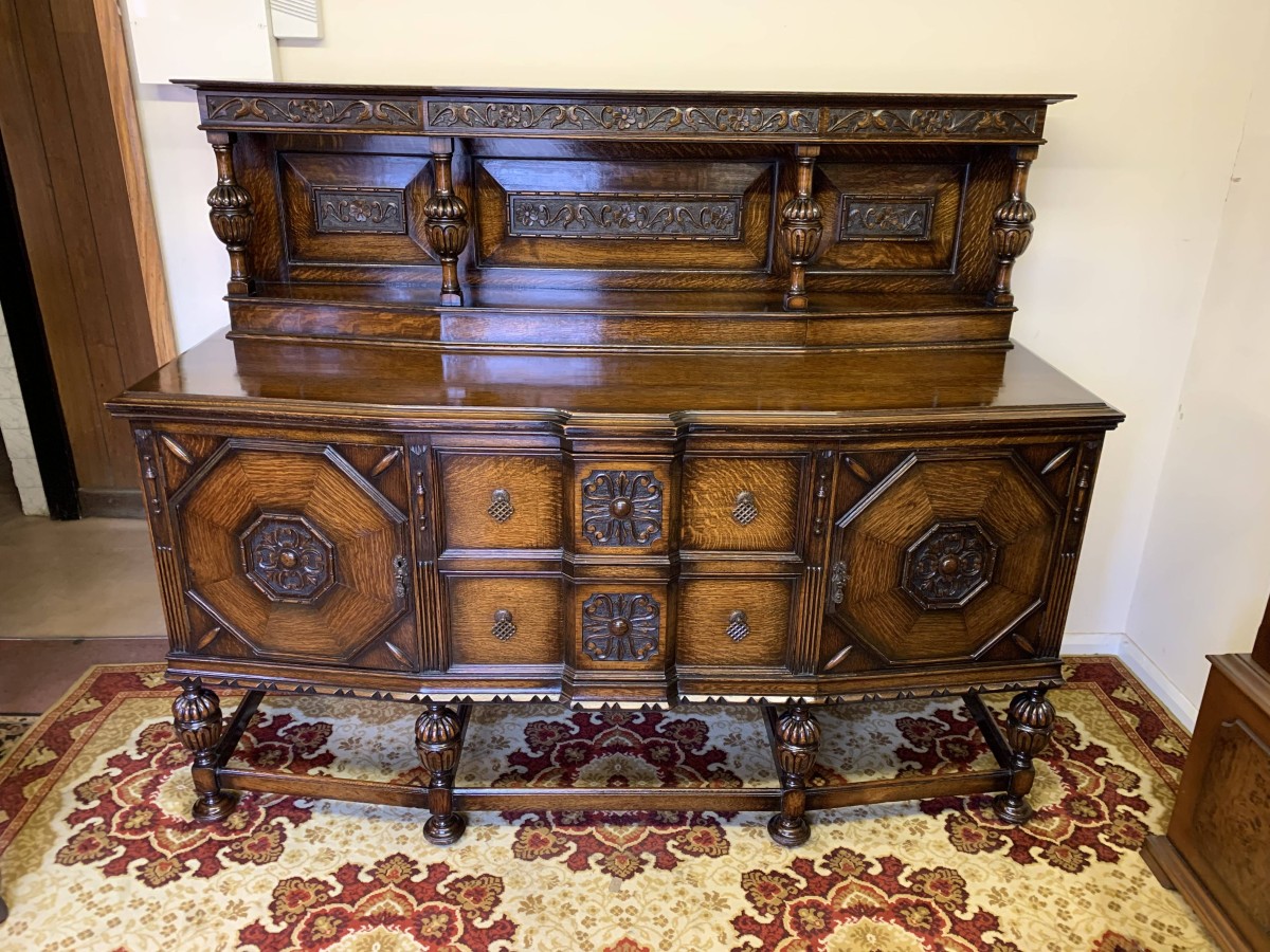 The sideboard dates circa 1920 and is made in fabulous quality carved oak. The back being carved throughout with four bulbous carved supports. The base has two deep central drawers, the drawers having decorative central carvings and two brass handles. The drawers are flanked by a pair of lockable panelled doors, the doors having decorative central carvings. Having four bulbous carved legs, stretcher supports and standing on four turned feet.