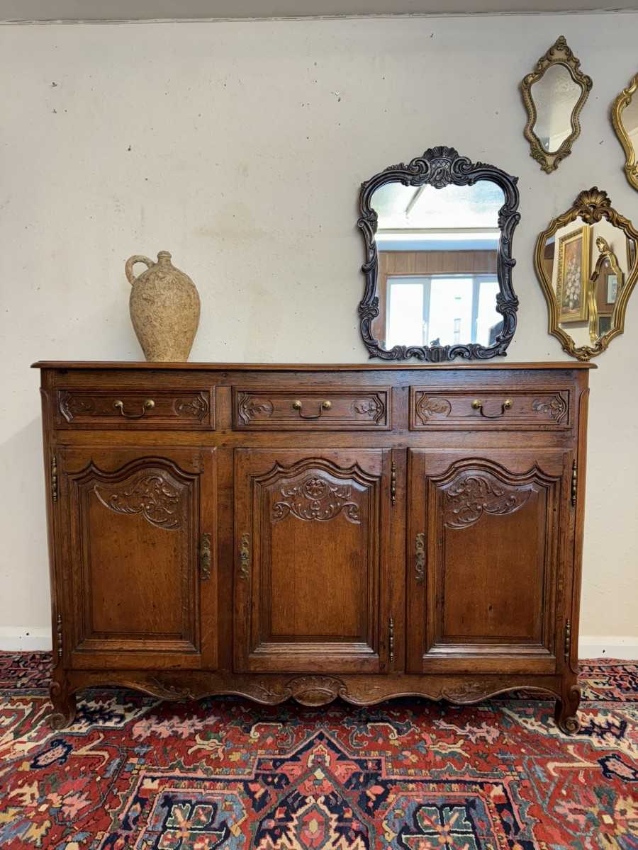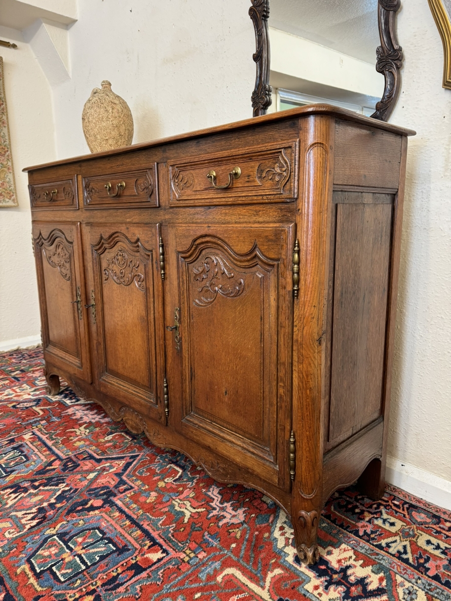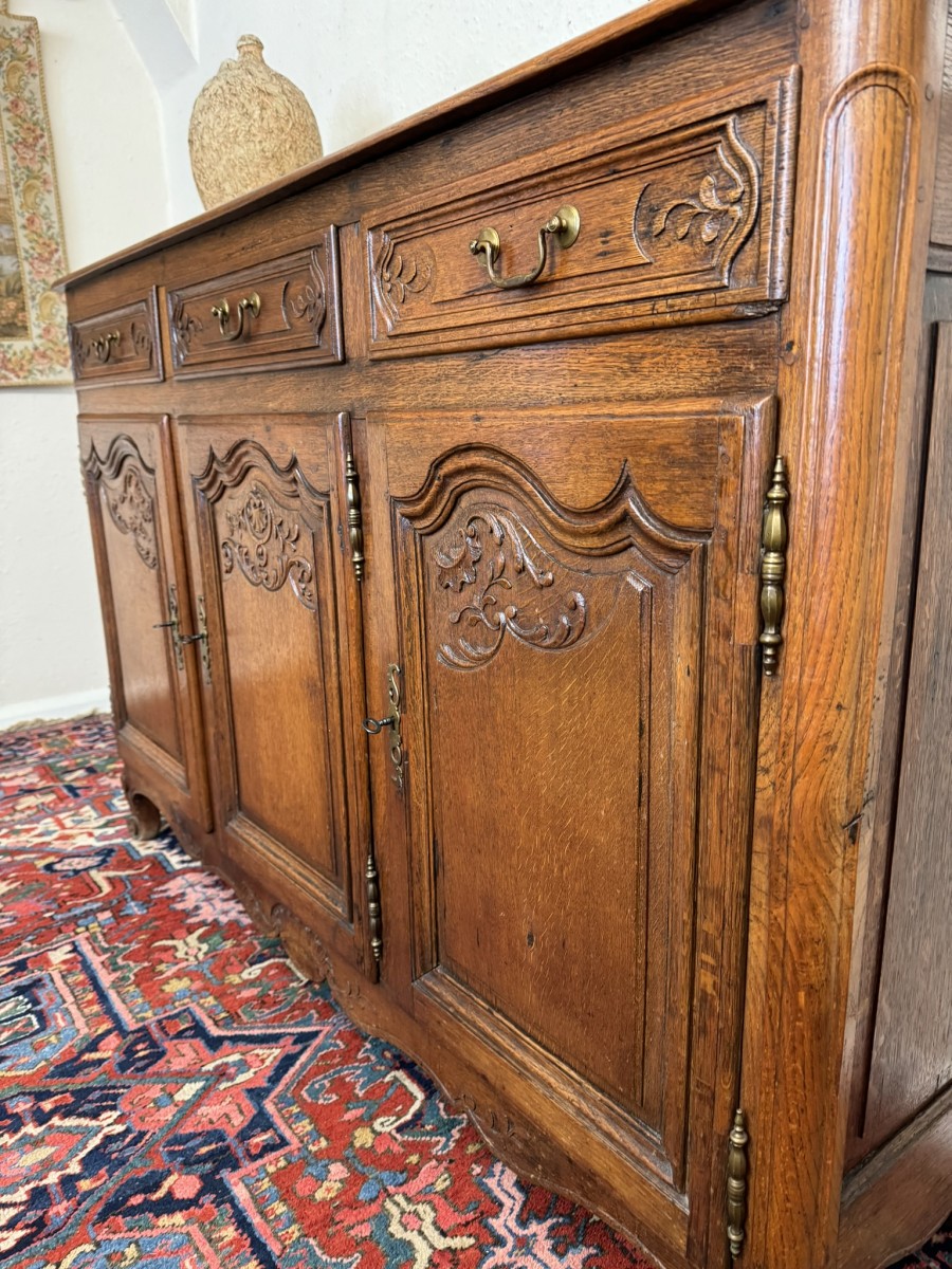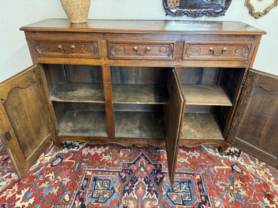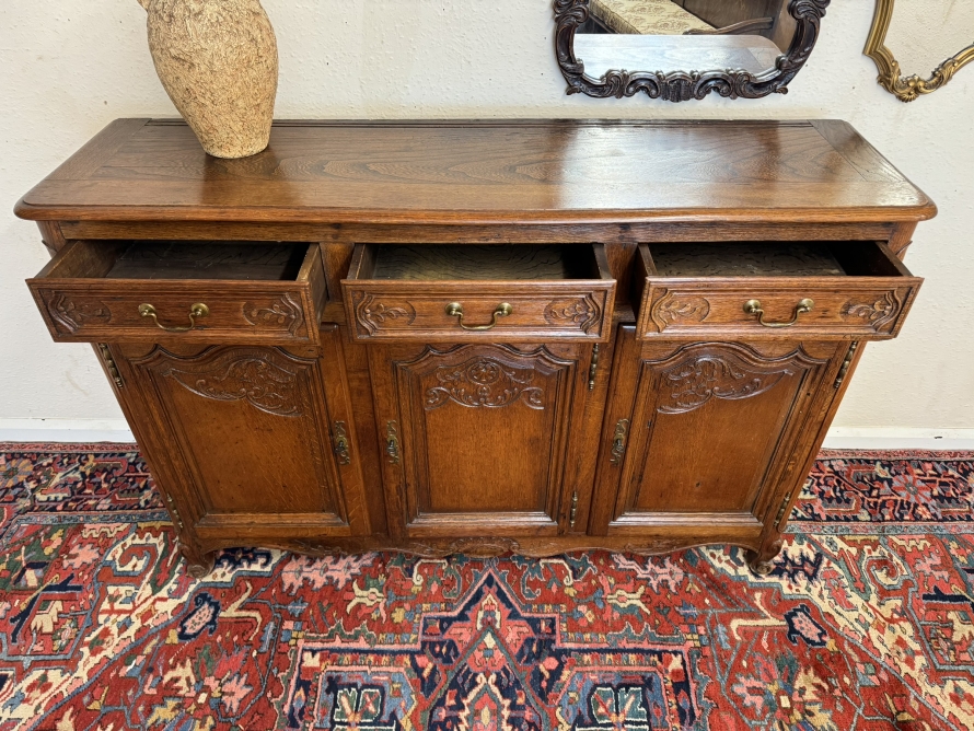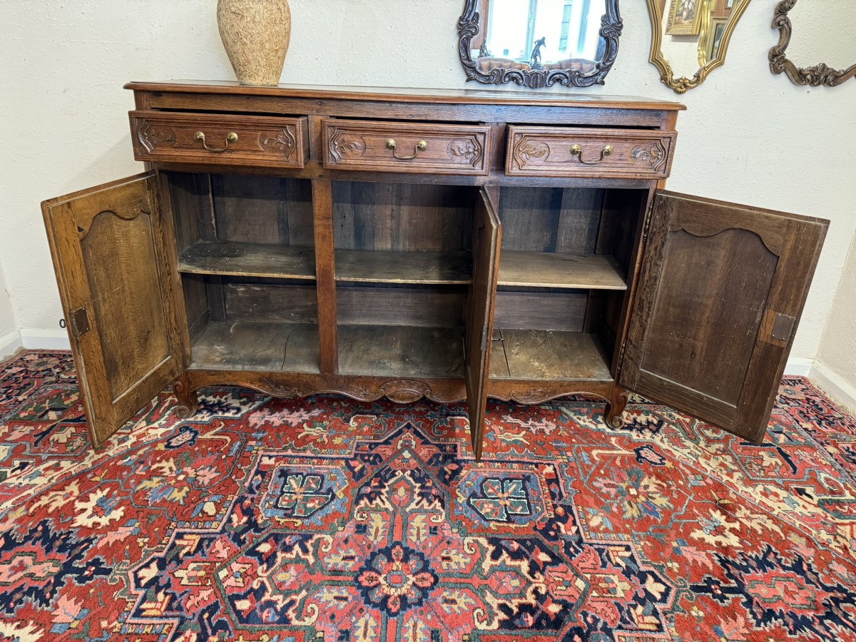 This fabulous French country oak dresser dates circa 1870. Produced in striking oak the oversailing top sits above three carved drawers, each drawer having a brass handle, below are three lockable carved recessed panelled cupboard doors, each drawer opens to reveal a removable shelf with a boarded back and base. Recessed panelled sides, shaped skirt with fabulous carving. This French dresser stands on carved cabriole shaped legs to the front.