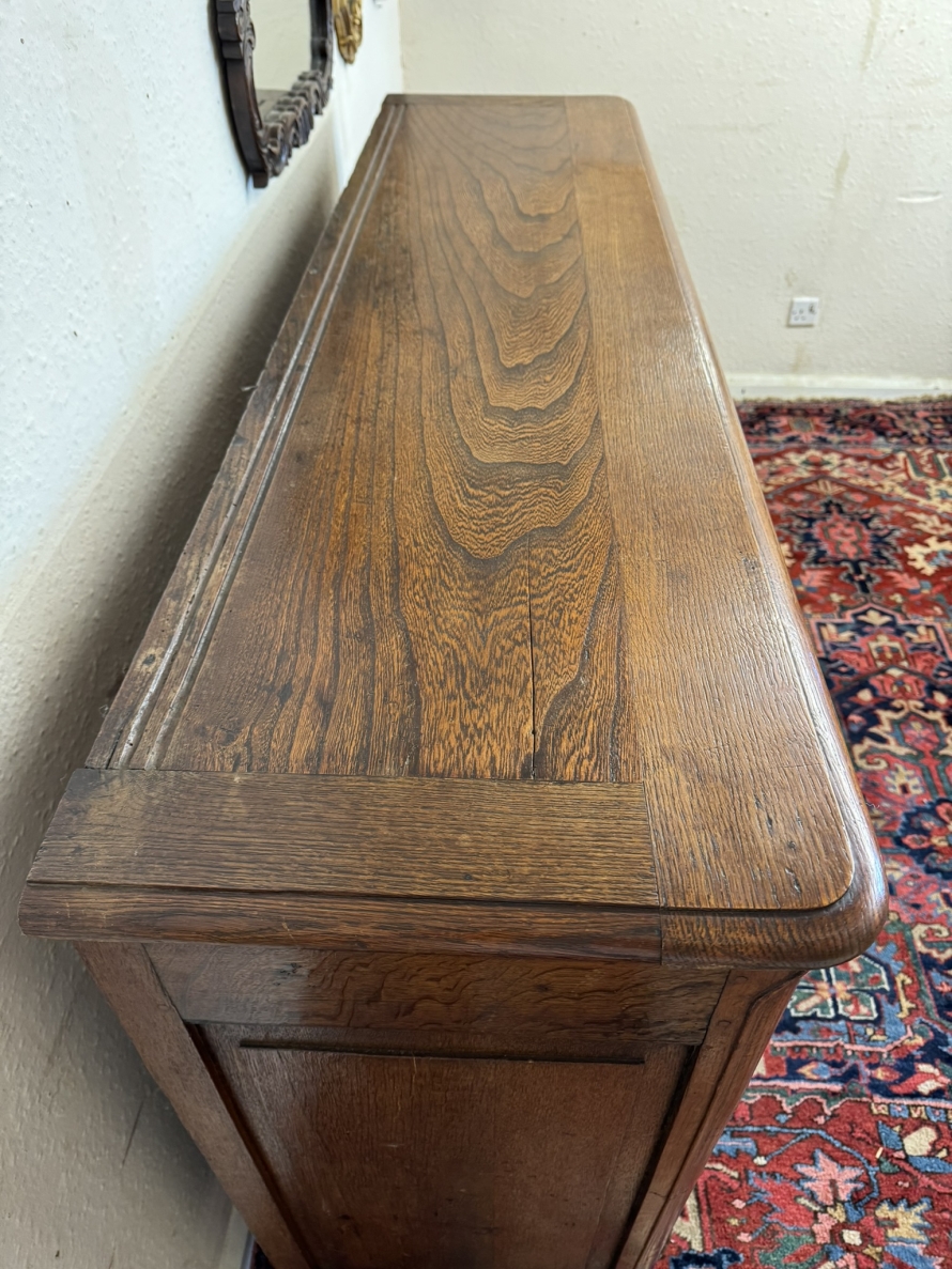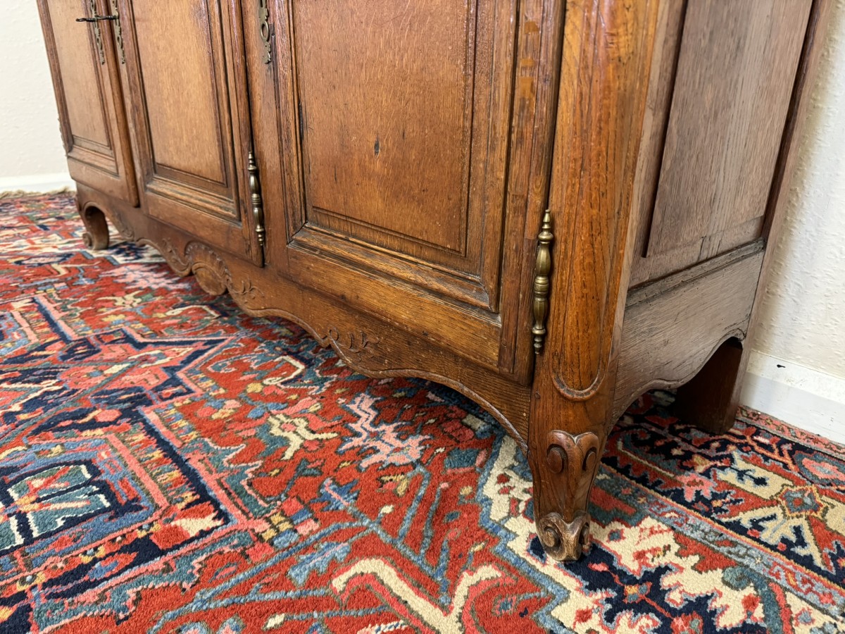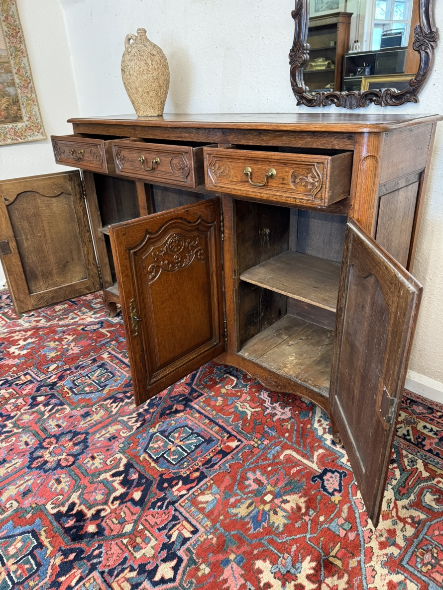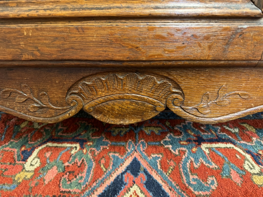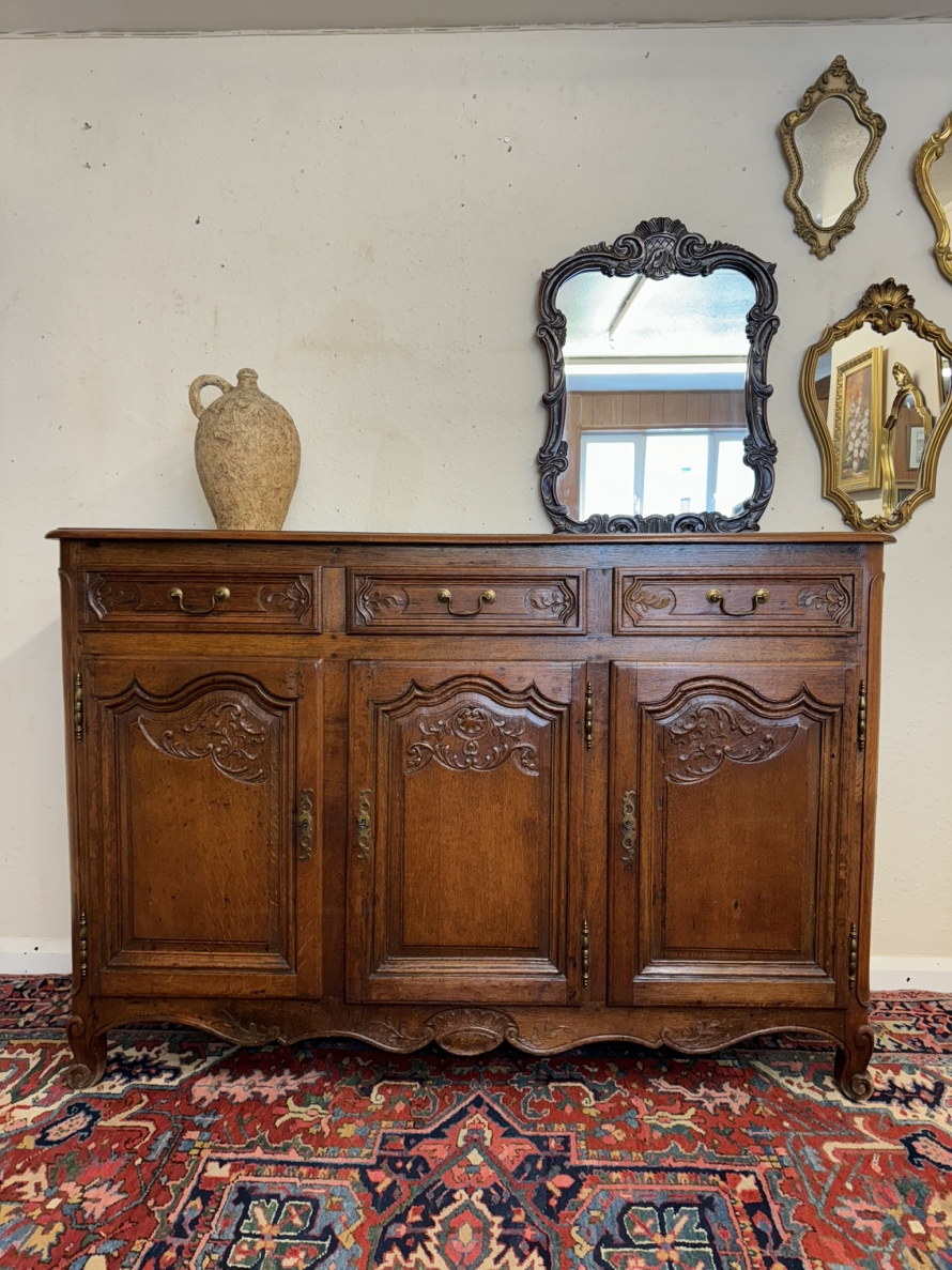 This fabulous French country oak dresser dates circa 1870. Produced in striking oak the oversailing top sits above three carved drawers, each drawer having a brass handle, below are three lockable carved recessed panelled cupboard doors, each drawer opens to reveal a removable shelf with a boarded back and base. Recessed panelled sides, shaped skirt with fabulous carving. This French dresser stands on carved cabriole shaped legs to the front.