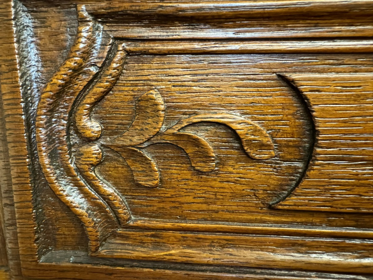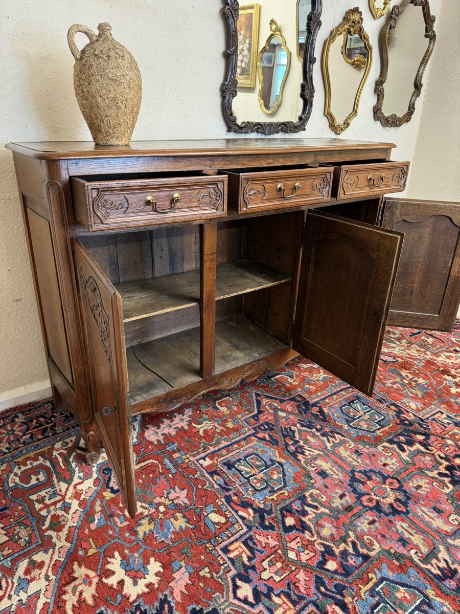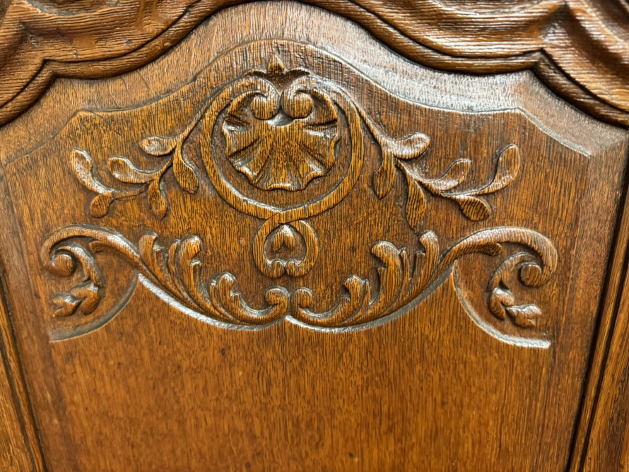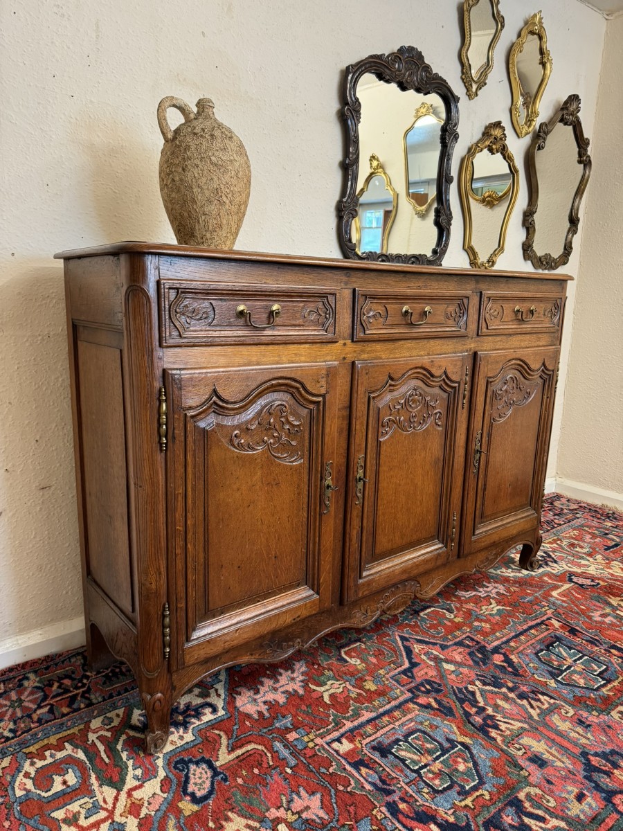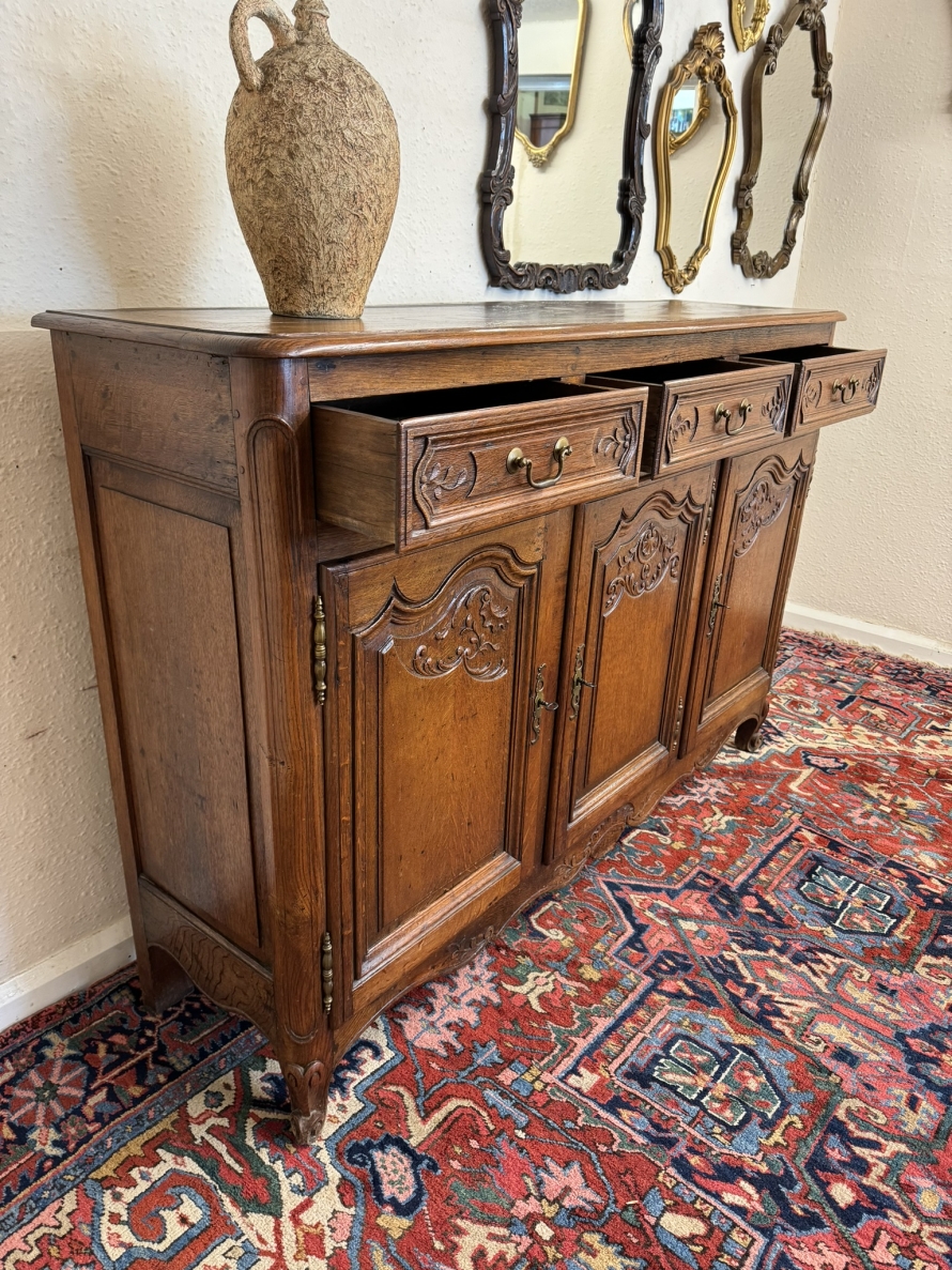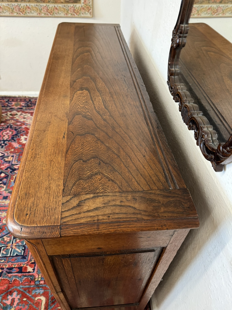 This fabulous French country oak dresser dates circa 1870. Produced in striking oak the oversailing top sits above three carved drawers, each drawer having a brass handle, below are three lockable carved recessed panelled cupboard doors, each drawer opens to reveal a removable shelf with a boarded back and base. Recessed panelled sides, shaped skirt with fabulous carving. This French dresser stands on carved cabriole shaped legs to the front.
