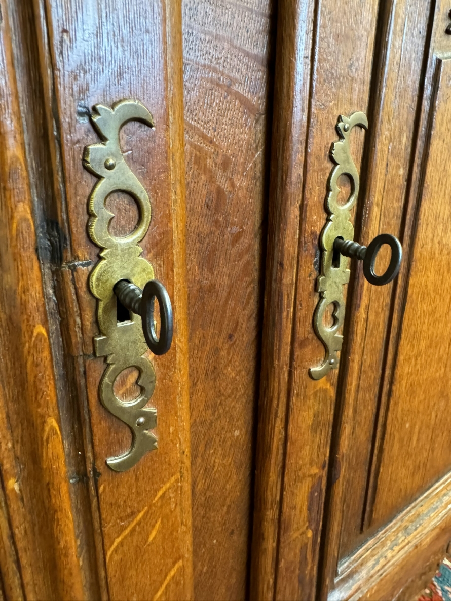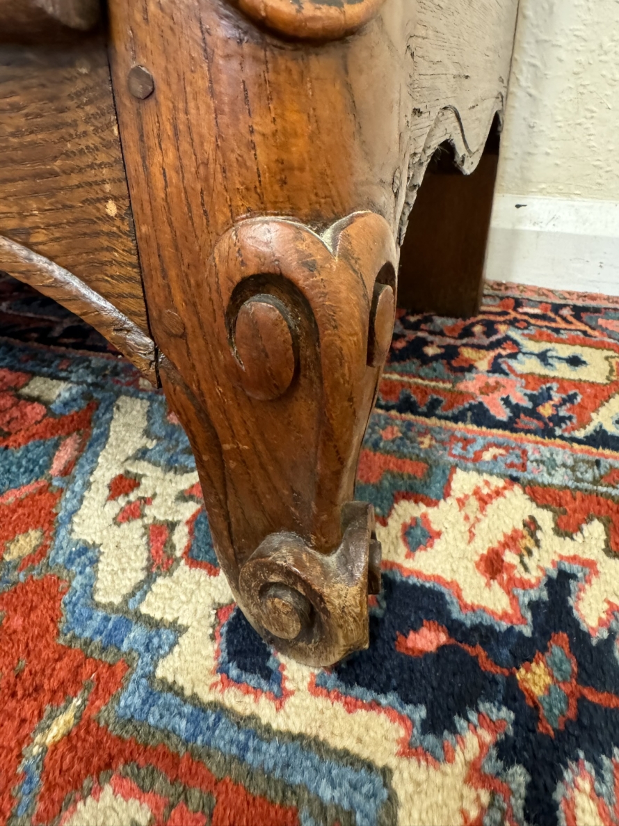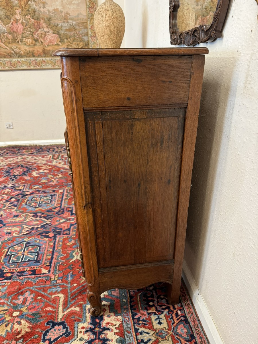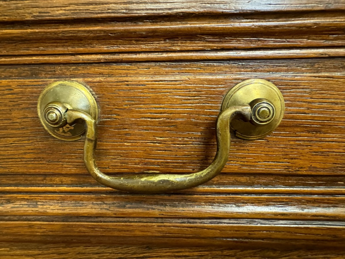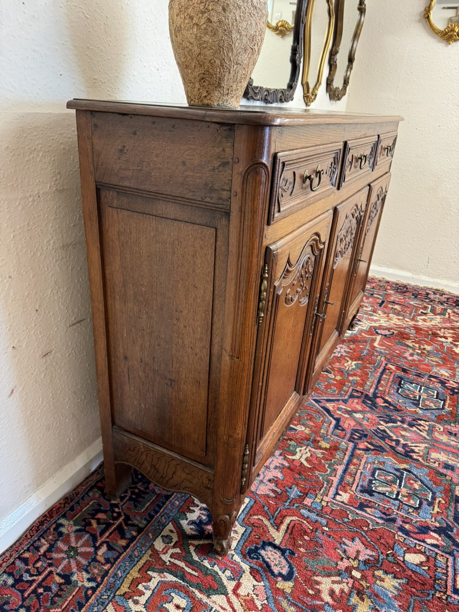 This fabulous French country oak dresser dates circa 1870. Produced in striking oak the oversailing top sits above three carved drawers, each drawer having a brass handle, below are three lockable carved recessed panelled cupboard doors, each drawer opens to reveal a removable shelf with a boarded back and base. Recessed panelled sides, shaped skirt with fabulous carving. This French dresser stands on carved cabriole shaped legs to the front.