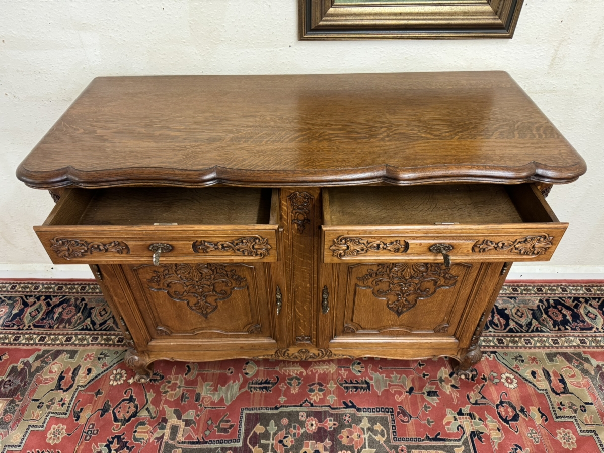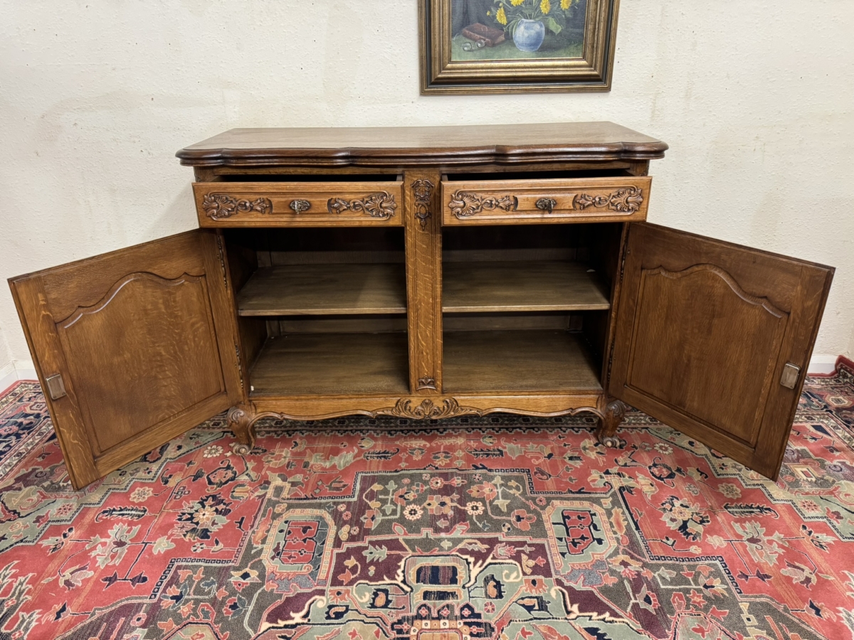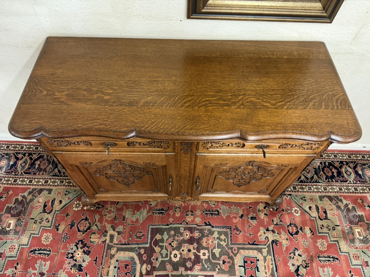 This dresser dates circa 1930 and is in excellent condition. The shaped over sailing top sits above a pair of lockable carved drawers, below are a pair of lockable carved recessed panelled doors, the doors open to reveal a removable shelf. Recessed panelled sides shaped skirt with central carving and standing on two carved cabriole shaped legs to the front.
