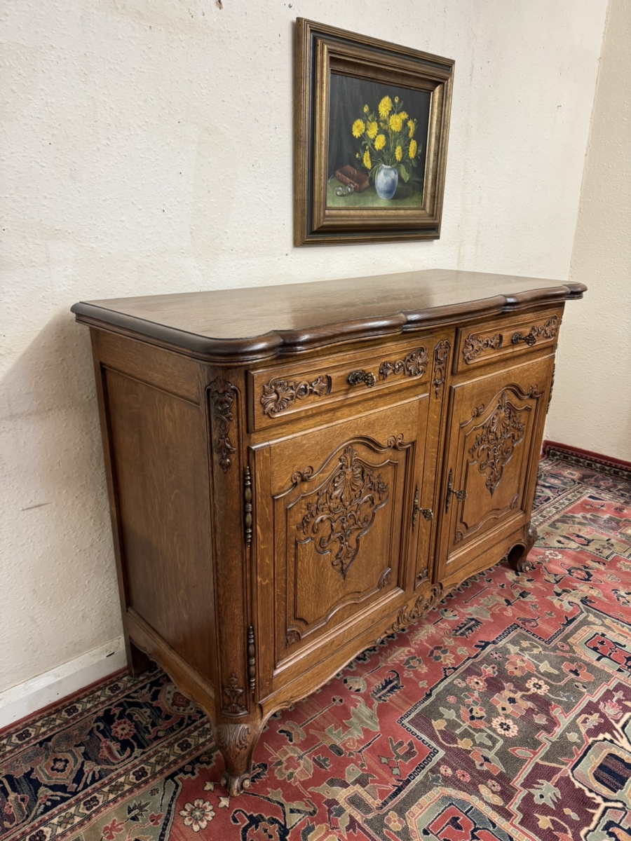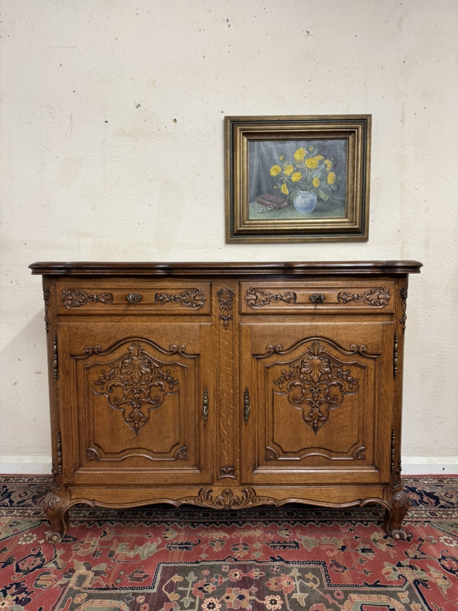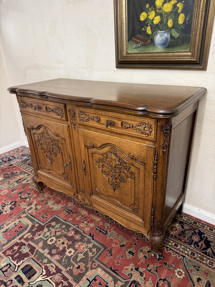 This dresser dates circa 1930 and is in excellent condition. The shaped over sailing top sits above a pair of lockable carved drawers, below are a pair of lockable carved recessed panelled doors, the doors open to reveal a removable shelf. Recessed panelled sides shaped skirt with central carving and standing on two carved cabriole shaped legs to the front.