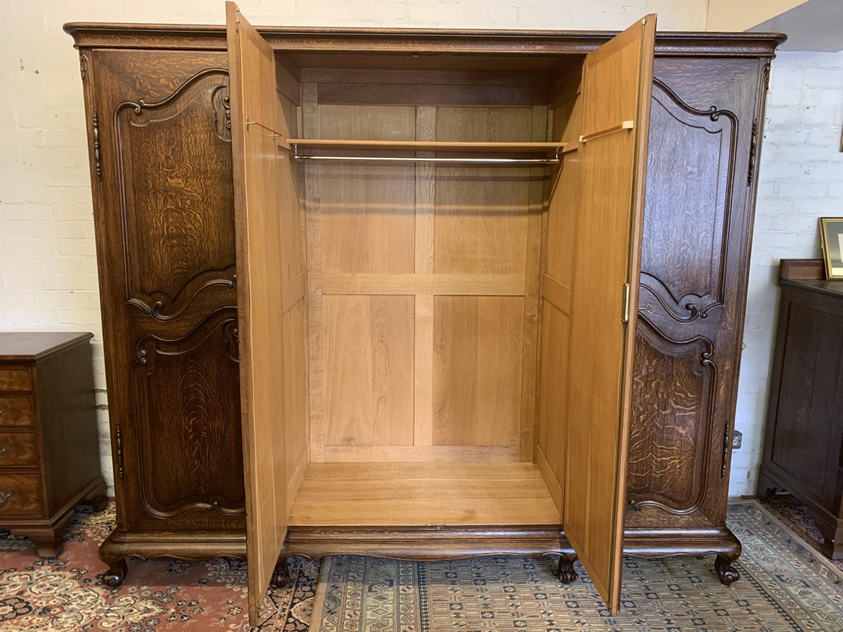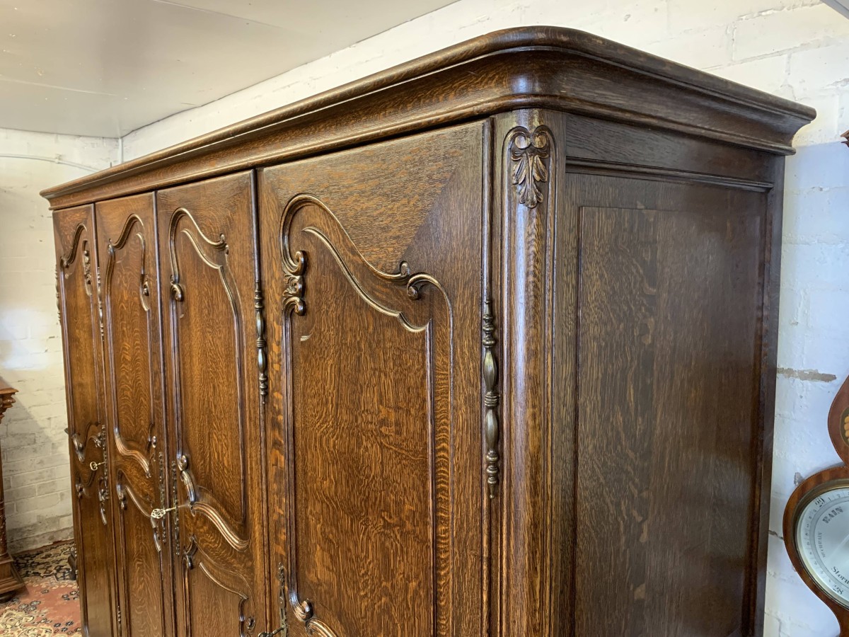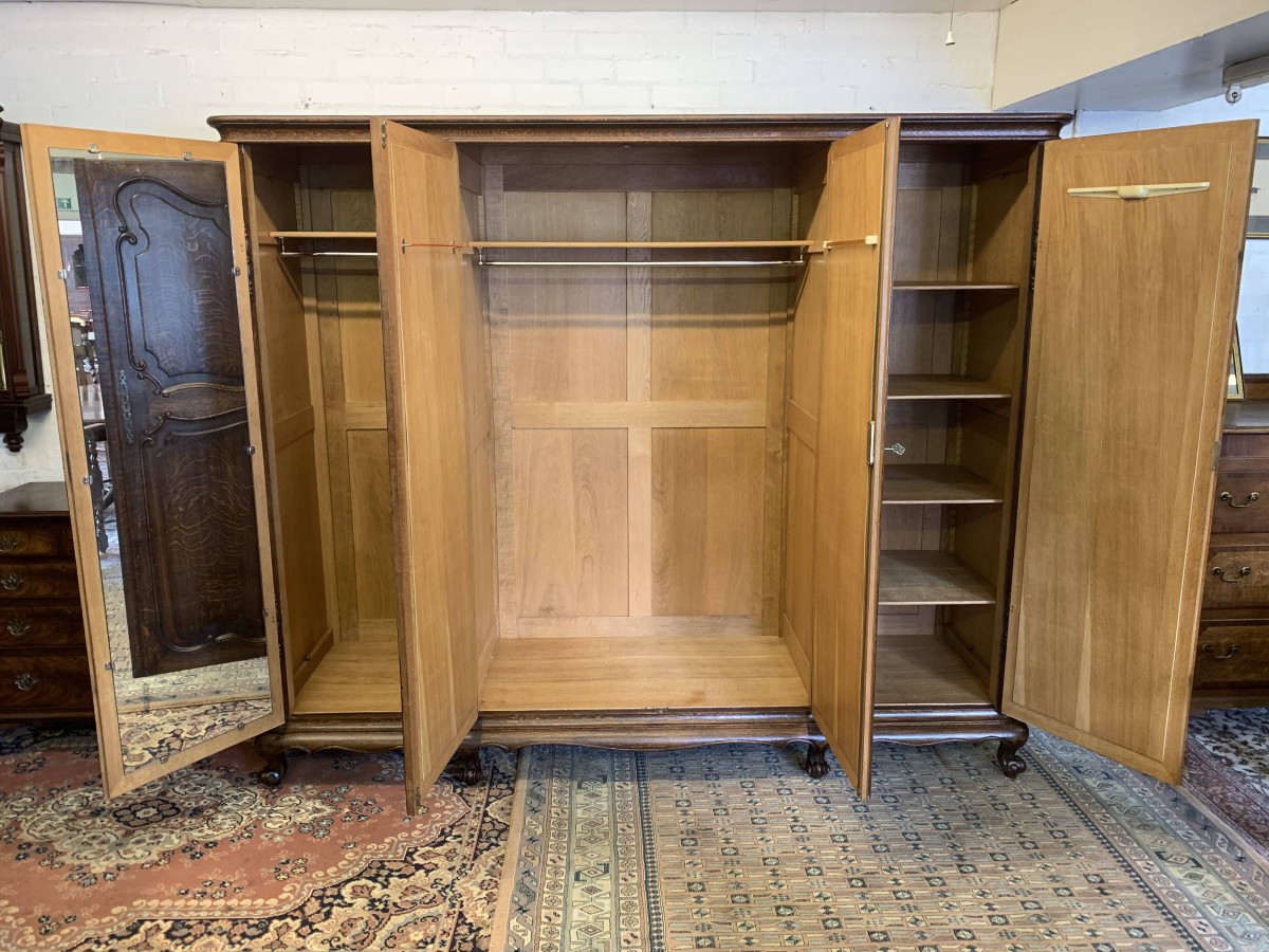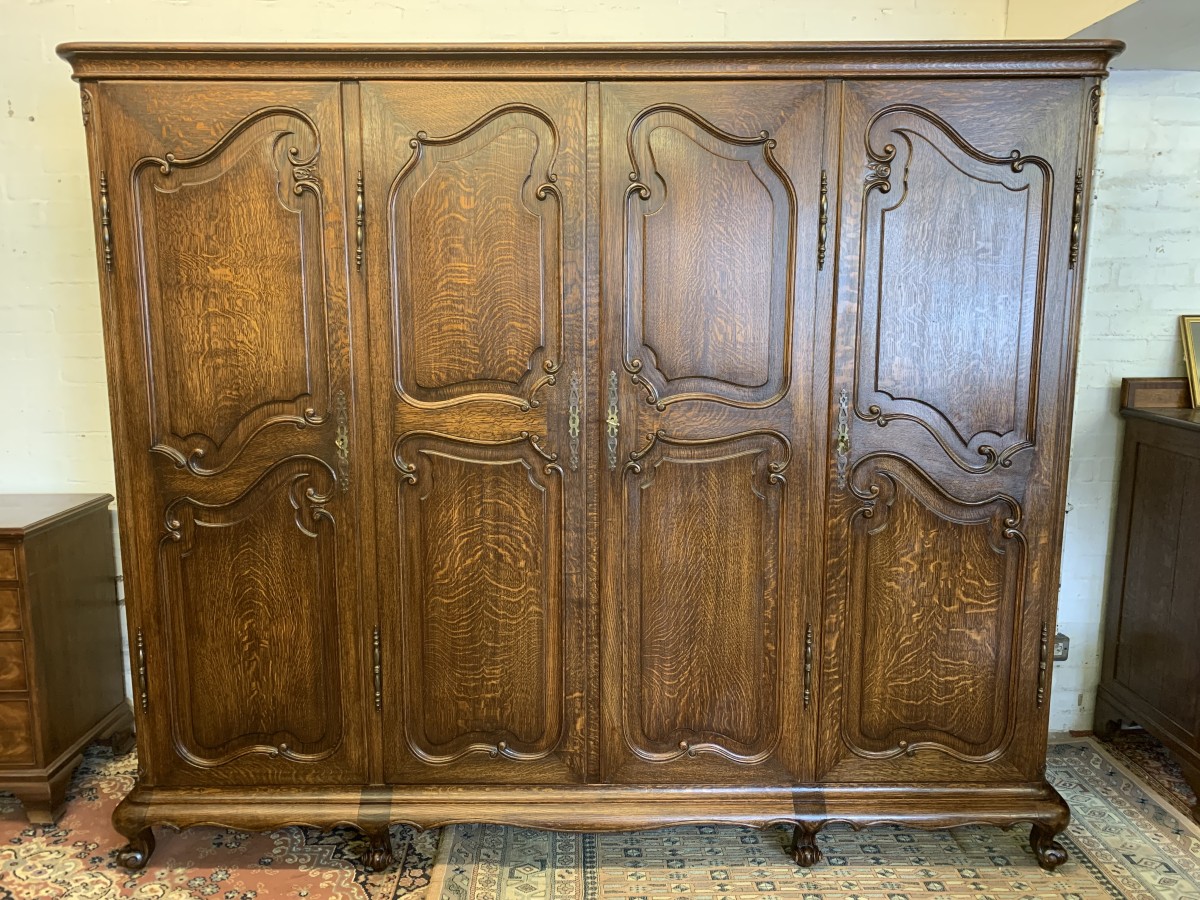 The oversailing top has rounded corners to the front. Below are four lockable carved recessed panelled doors, each door having brass hinges, decorative brass escutcheon and brass key. The left-hand door opens to reveal a full length dressing mirror to the back of the door and an adjustable shelf with metal hanging rail below. The pair of central doors open to reveal an adjustable shelf with metal hanging rail below. The right-hand door opens to reveal four adjustable/removable shelves. This armoire offers ample storage. Recessed panelled sides and a shaped skirt – this stunning armoire stands on four carved shaped cabriole legs to the front. Please note this armoire splits down for easy transportation and delivery into any home.