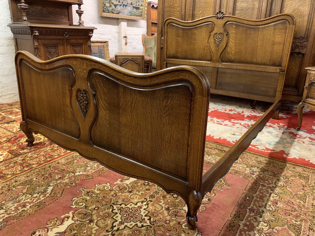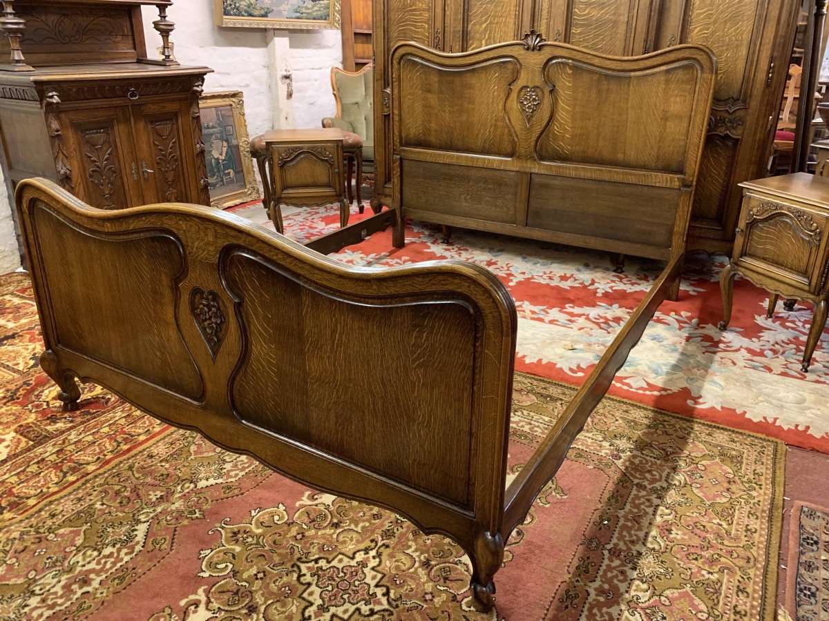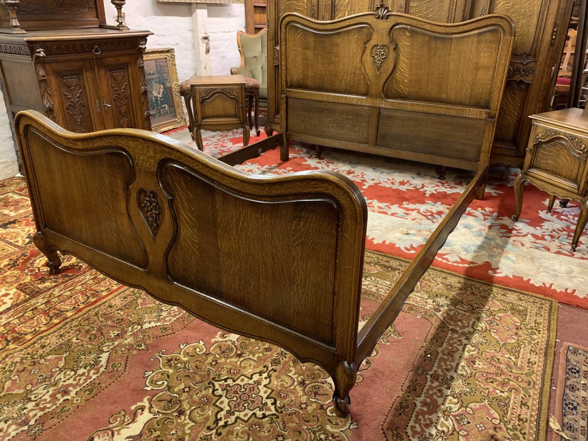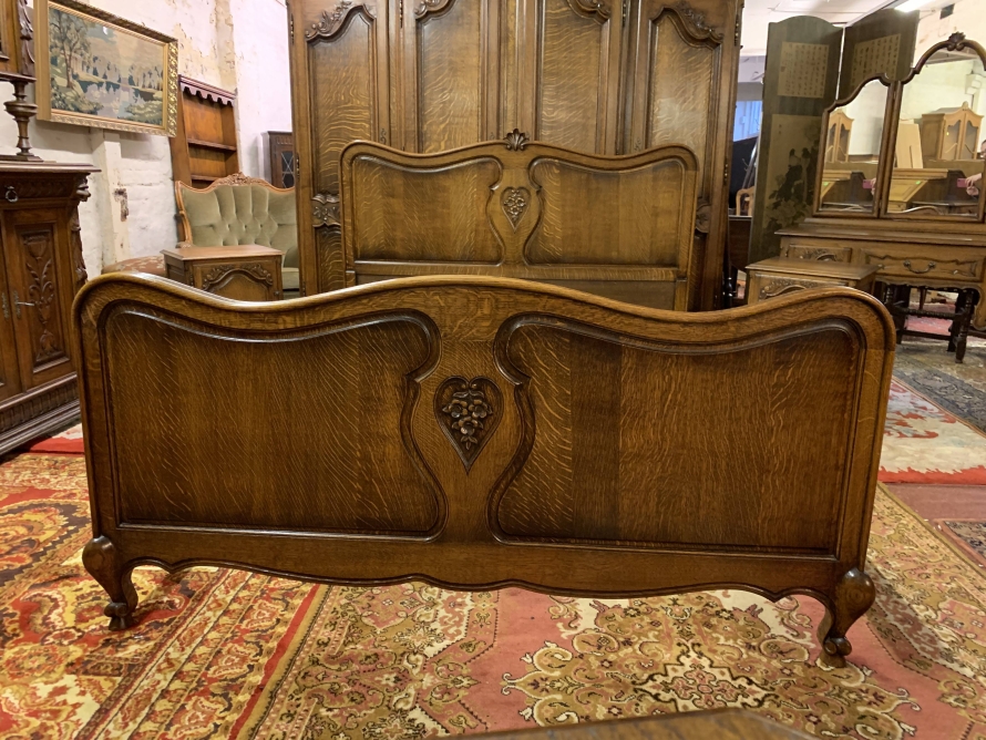 This antique French bed is in excellent condition. The shaped headboard rises to a central decorative carved crest, below the crest is a decorative carving which sits between two shaped recessed panels. The shaped footboard has a central decorative carving which is also flanked by two shaped recessed panels, the footboard stands on carved cabriole shaped legs. This bed splits down for easy transportation and delivery.
