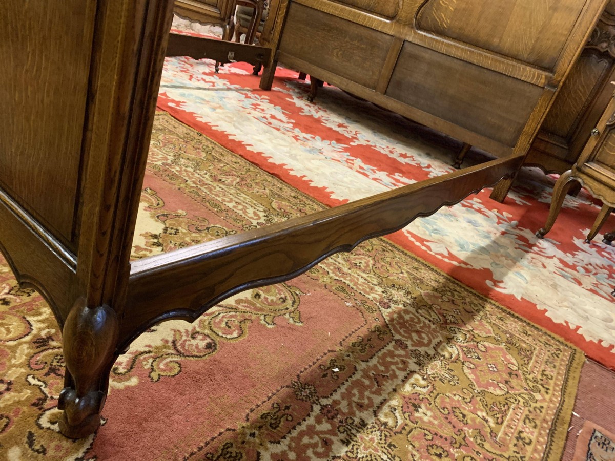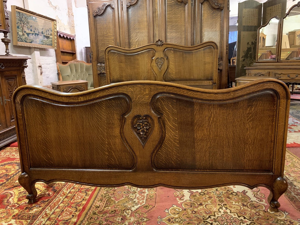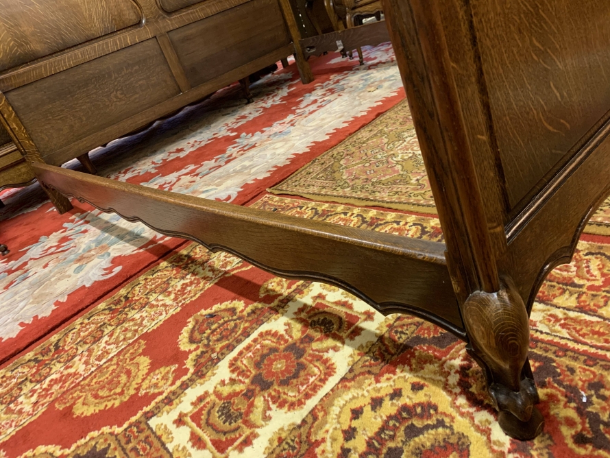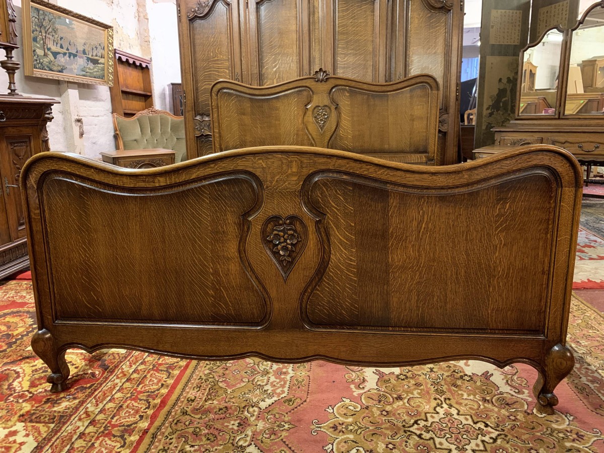 This antique French bed is in excellent condition. The shaped headboard rises to a central decorative carved crest, below the crest is a decorative carving which sits between two shaped recessed panels. The shaped footboard has a central decorative carving which is also flanked by two shaped recessed panels, the footboard stands on carved cabriole shaped legs. This bed splits down for easy transportation and delivery.