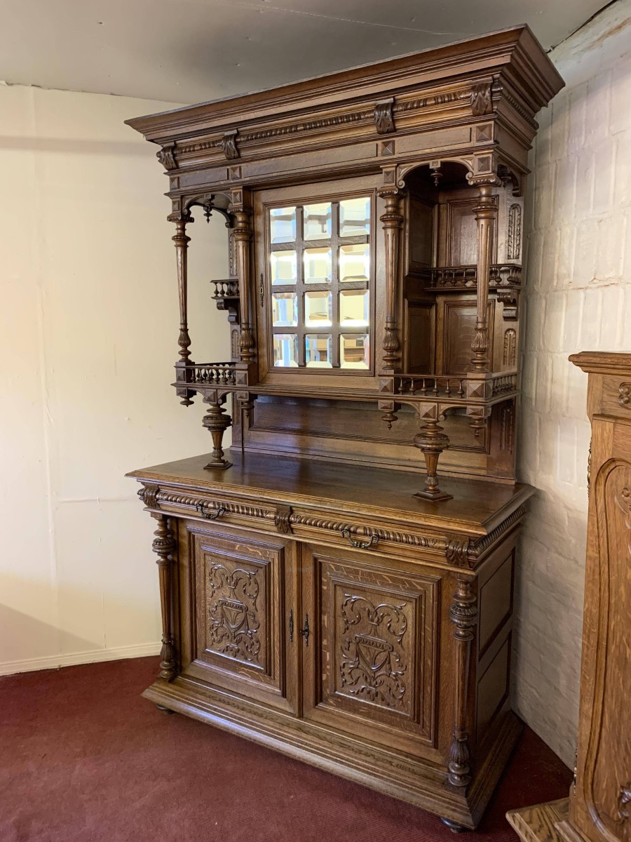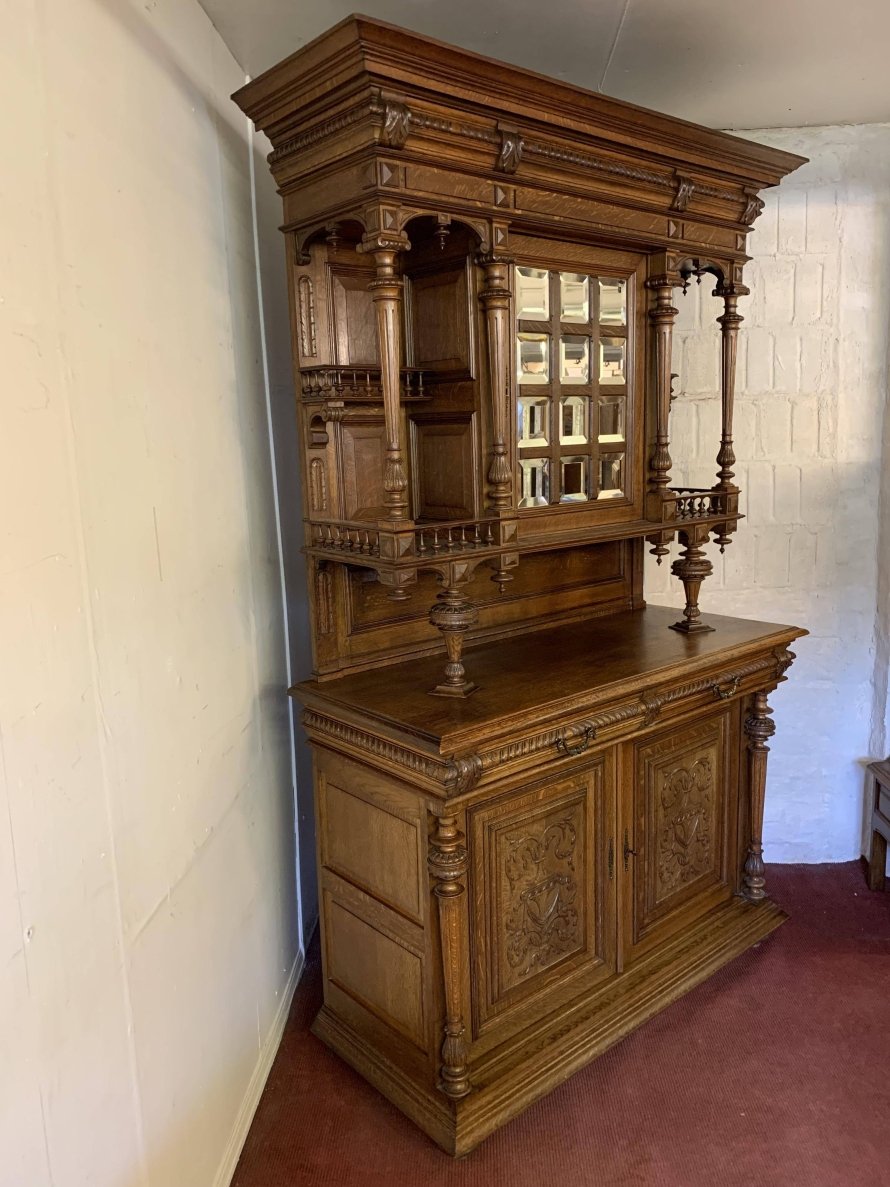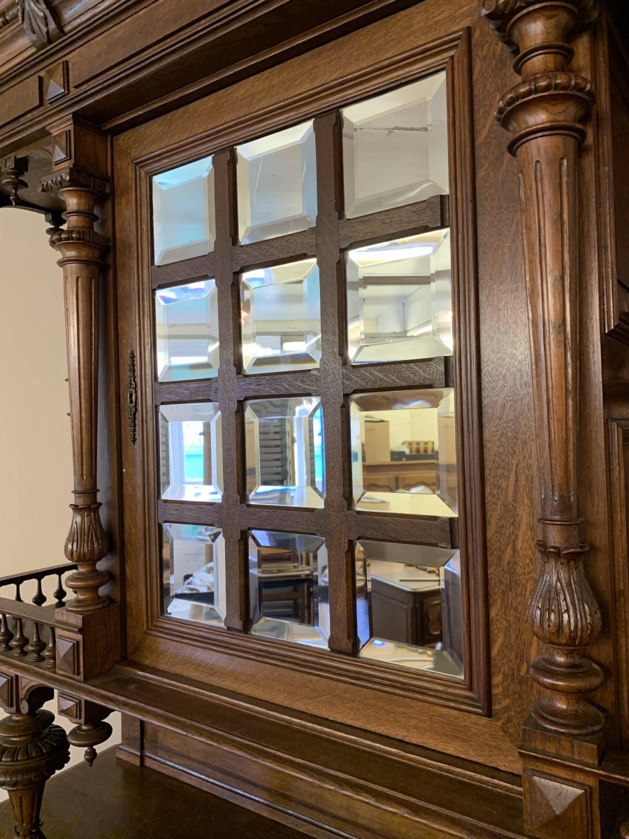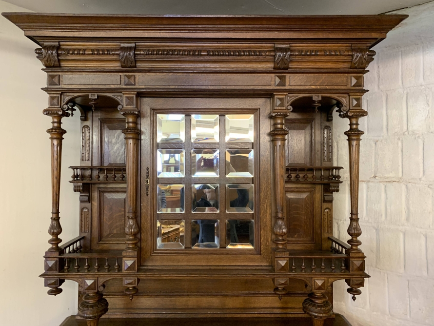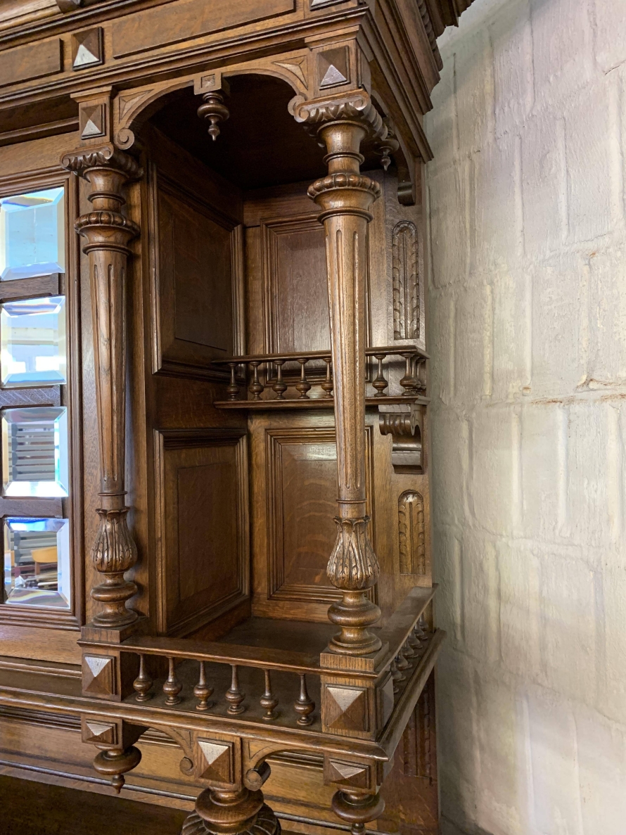 The top section has a stepped cornice which has ornate carvings below. Central bevel mirror lockable door opens to reveal a removable shelf. Open sections to the side each with carving, pair of recessed panels and mounted finials. Four fabulous turned, reeded and tapered columns with two carved turned column supports below. Two carved drawers each with decorative brass handle sit above a pair of carved recessed panelled cupboard doors flanked by a pair of fantastic turned reeded and tapered columns. The doors open to reveal a shelf. Recessed panelled sides, stepped skirt, this stunning French cupboard/cabinet sits on a pair of turned feet to the front.
