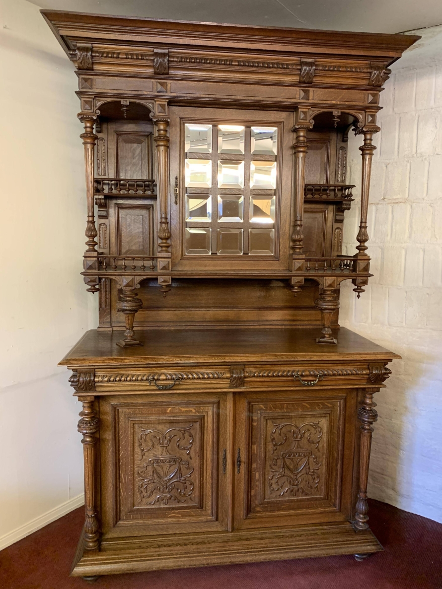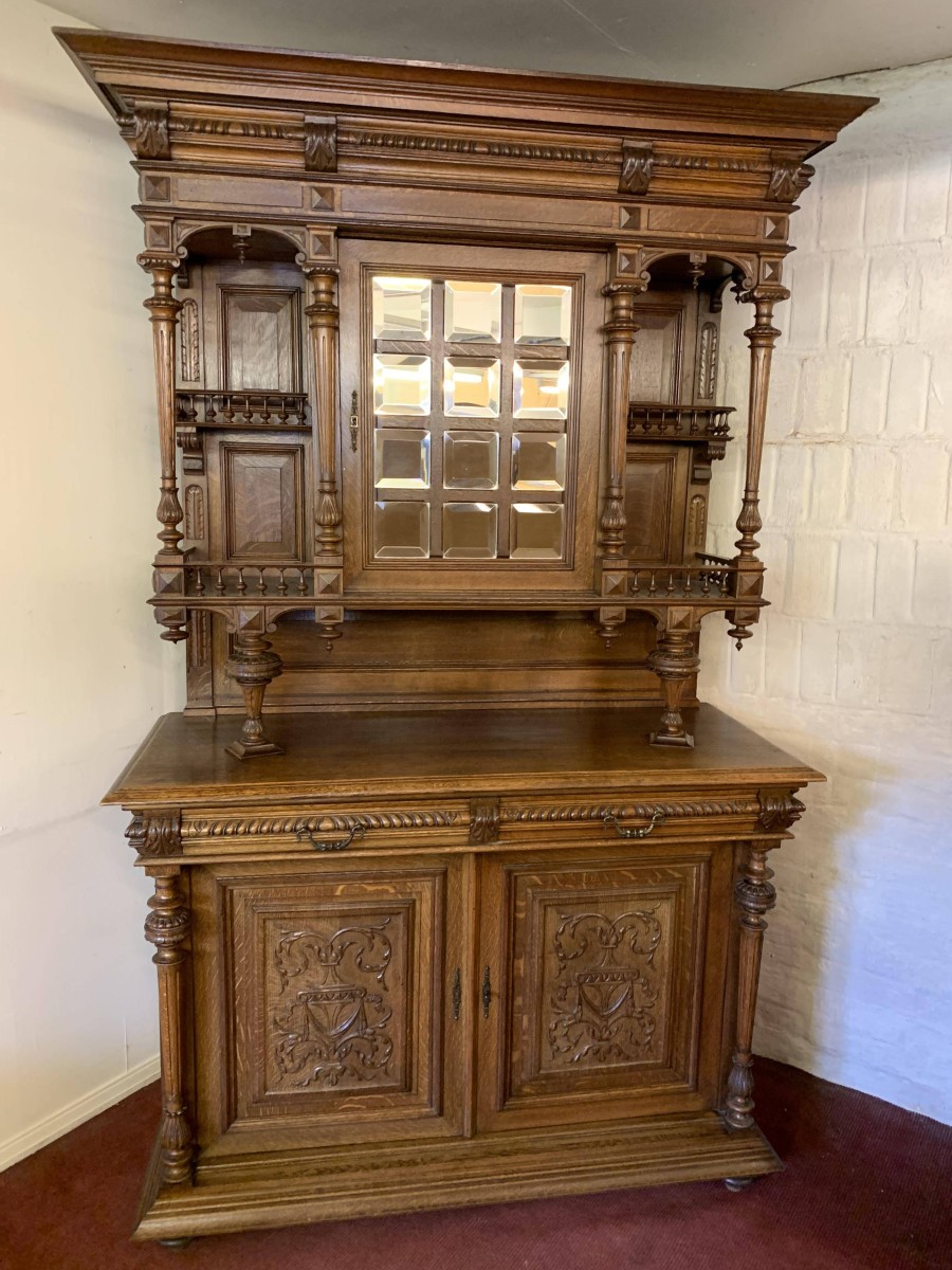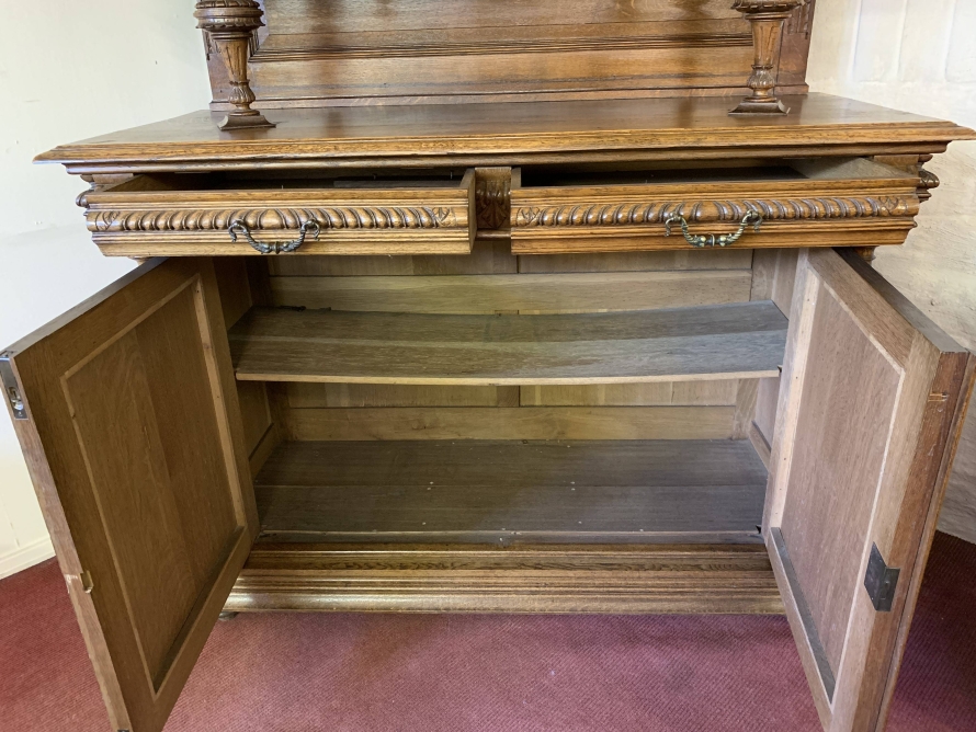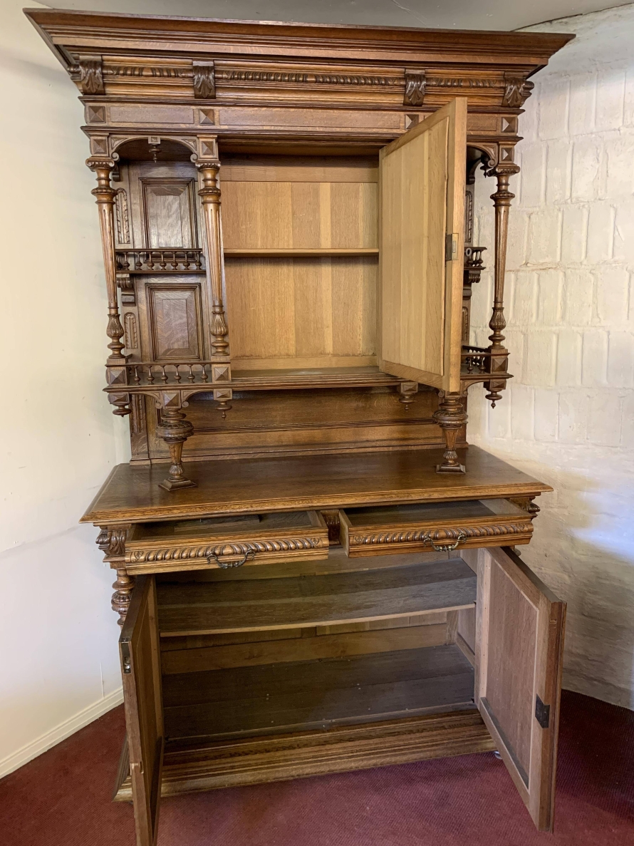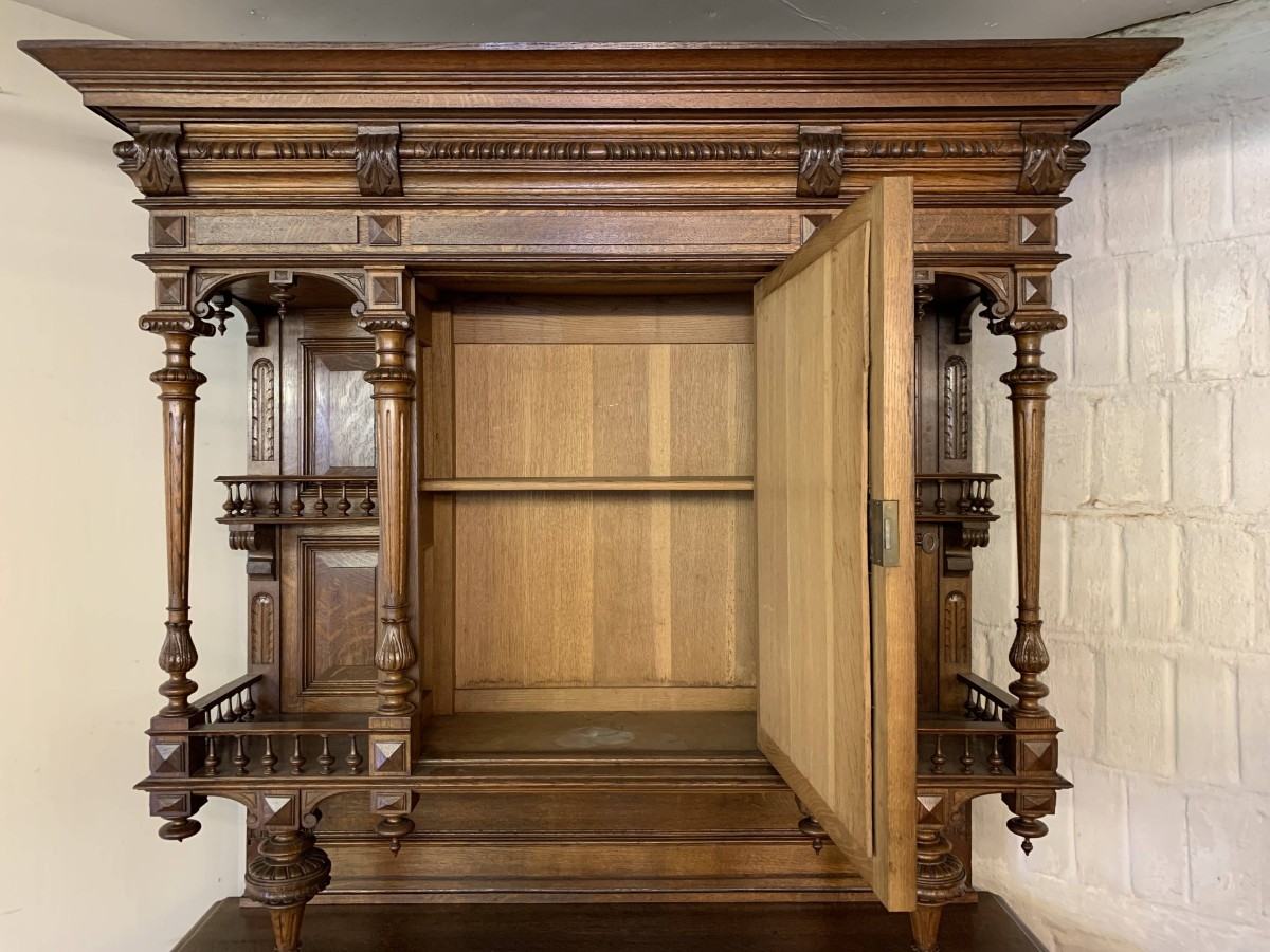The top section has a stepped cornice which has ornate carvings below. Central bevel mirror lockable door opens to reveal a removable shelf. Open sections to the side each with carving, pair of recessed panels and mounted finials. Four fabulous turned, reeded and tapered columns with two carved turned column supports below. Two carved drawers each with decorative brass handle sit above a pair of carved recessed panelled cupboard doors flanked by a pair of fantastic turned reeded and tapered columns. The doors open to reveal a shelf. Recessed panelled sides, stepped skirt, this stunning French cupboard/cabinet sits on a pair of turned feet to the front.
