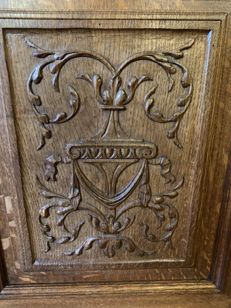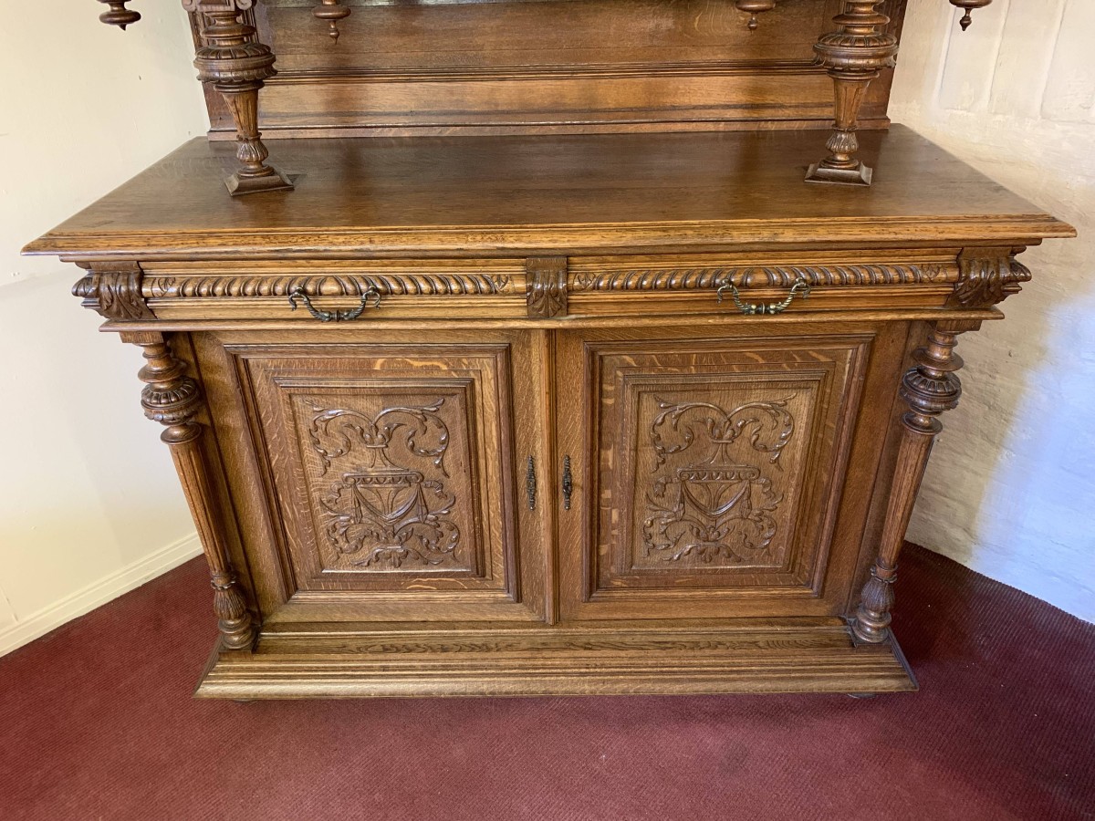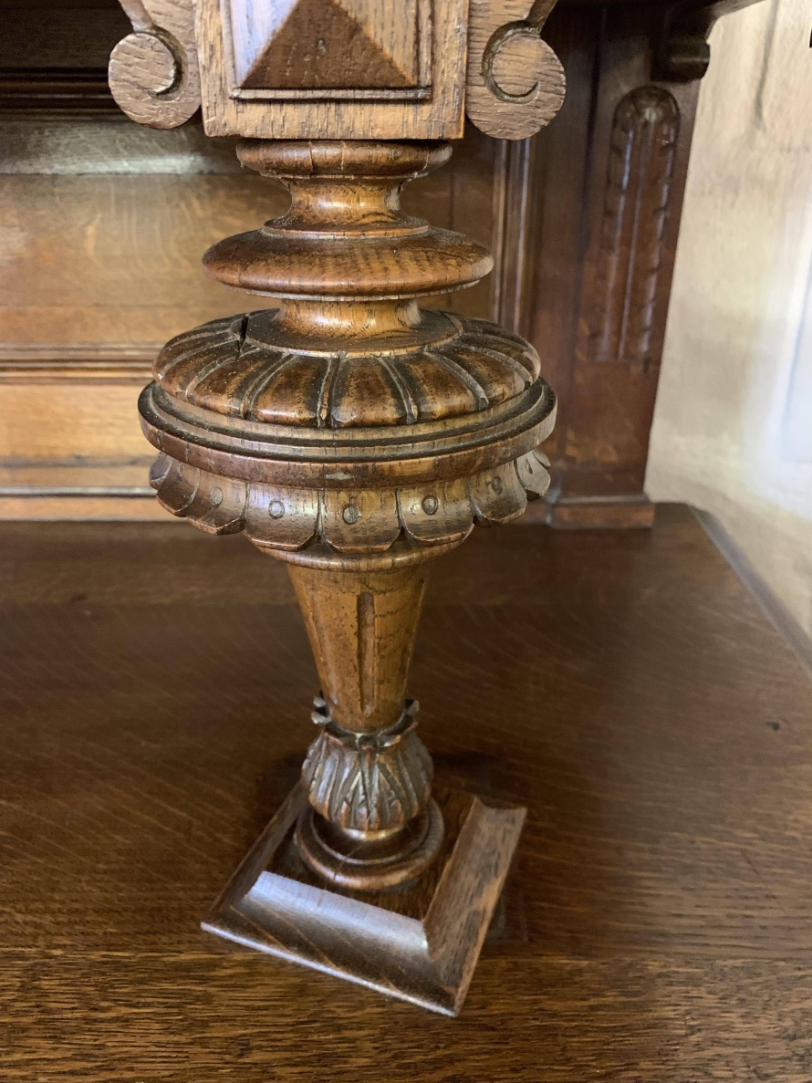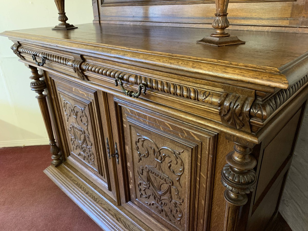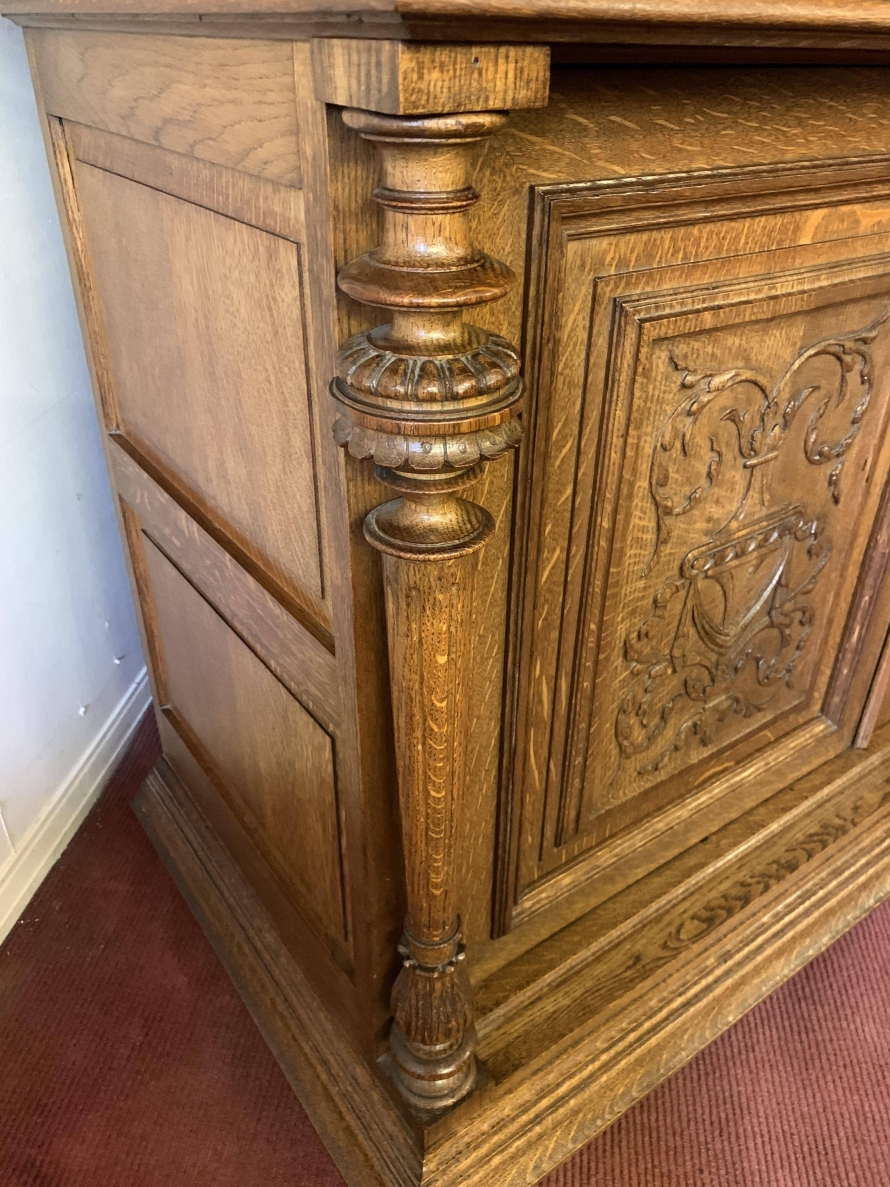 The top section has a stepped cornice which has ornate carvings below. Central bevel mirror lockable door opens to reveal a removable shelf. Open sections to the side each with carving, pair of recessed panels and mounted finials. Four fabulous turned, reeded and tapered columns with two carved turned column supports below. Two carved drawers each with decorative brass handle sit above a pair of carved recessed panelled cupboard doors flanked by a pair of fantastic turned reeded and tapered columns. The doors open to reveal a shelf. Recessed panelled sides, stepped skirt, this stunning French cupboard/cabinet sits on a pair of turned feet to the front.