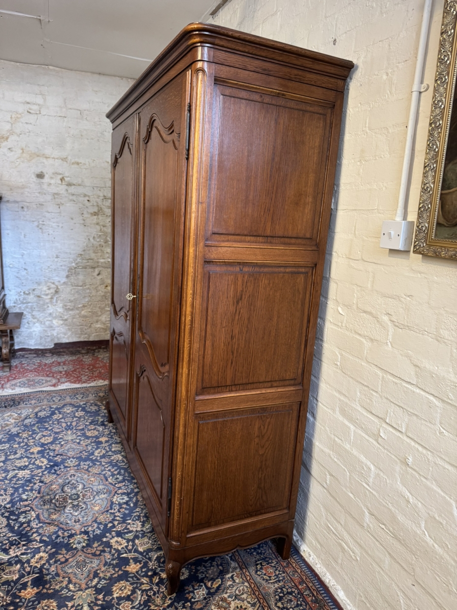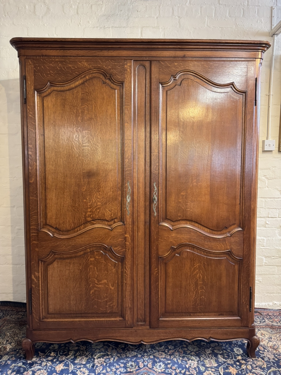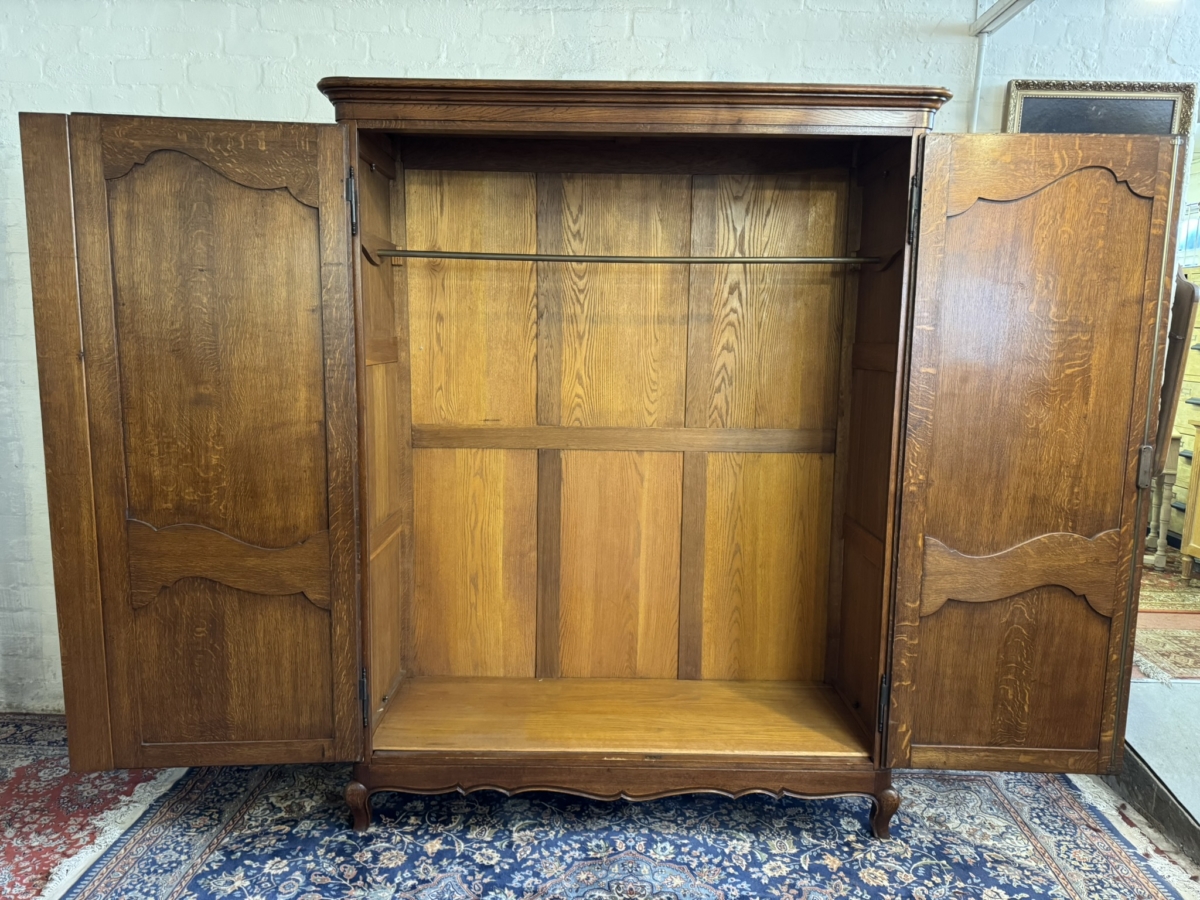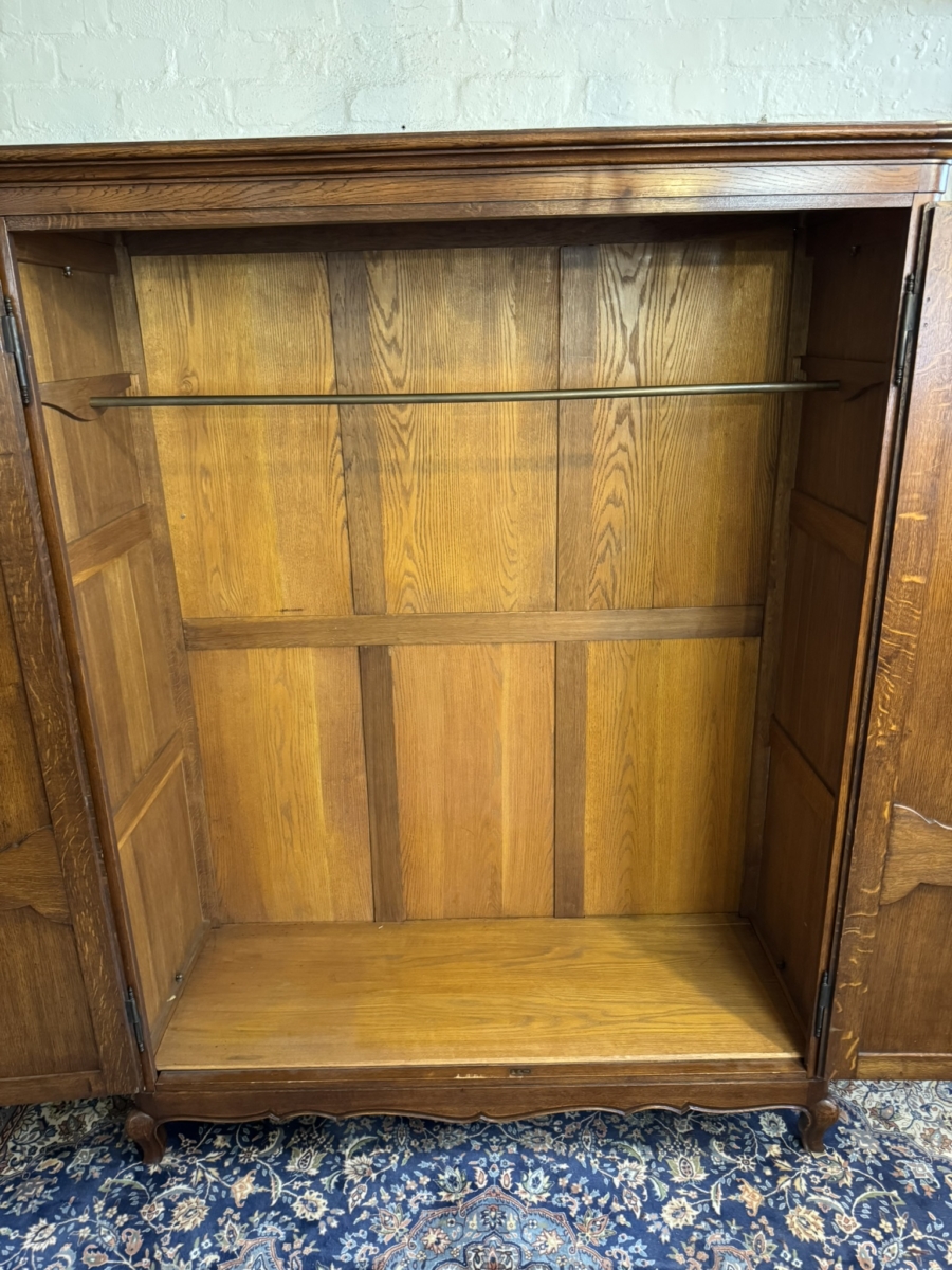 This top quality oak armoire dates circa 1930 and it is in excellent condition. The over sailing top sits above a pair of shaped lockable recessed panelled doors. The doors open to reveal a hanging rail. Recessed panelled sides, shaped skirt and standing on cabriole shaped legs to the front. Please note this armoire completely splits down for easy transportation and delivery into any home.