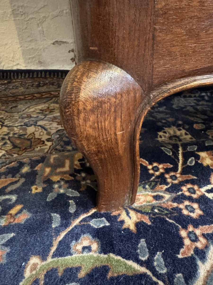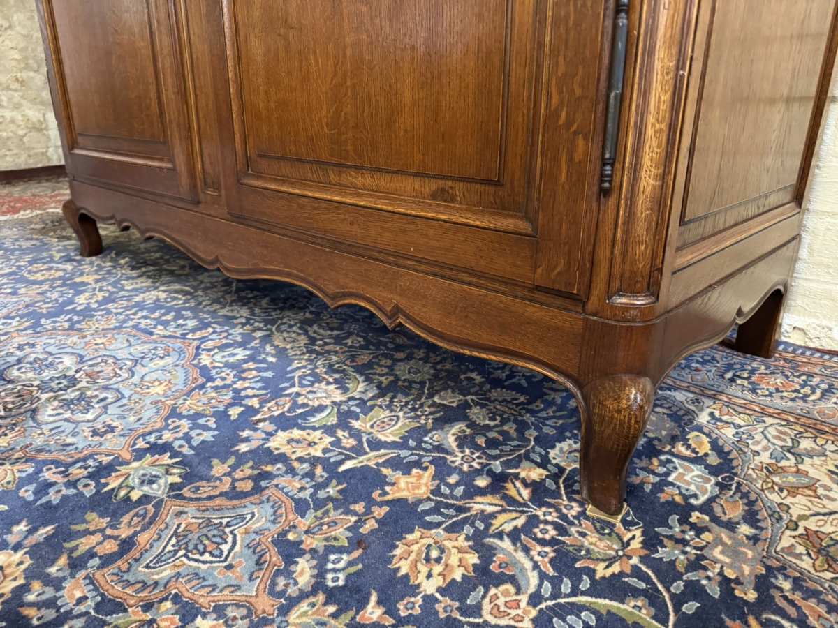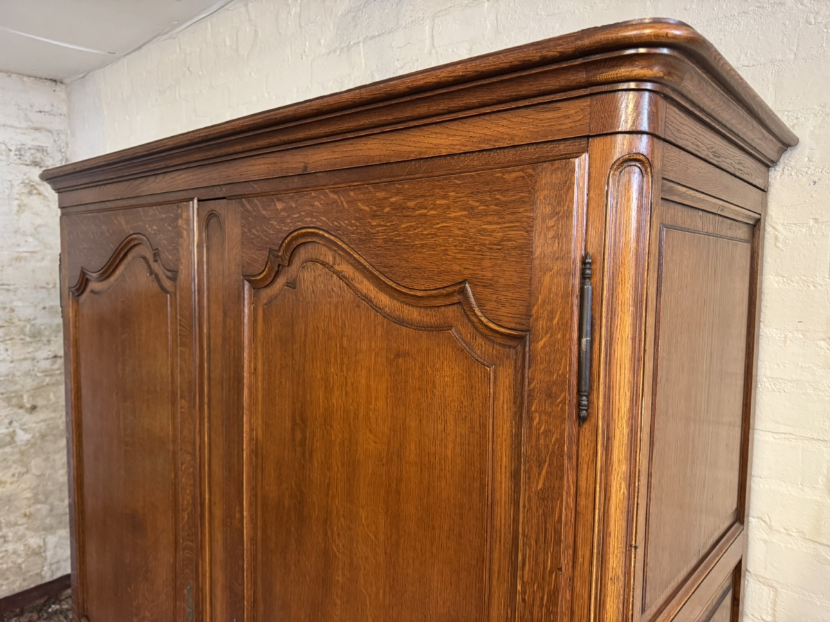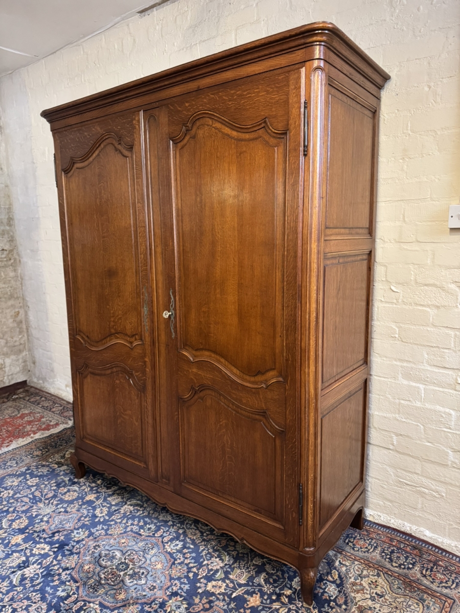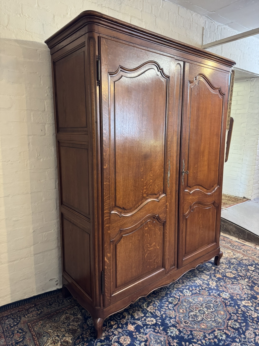 This top quality oak armoire dates circa 1930 and it is in excellent condition. The over sailing top sits above a pair of shaped lockable recessed panelled doors. The doors open to reveal a hanging rail. Recessed panelled sides, shaped skirt and standing on cabriole shaped legs to the front. Please note this armoire completely splits down for easy transportation and delivery into any home.