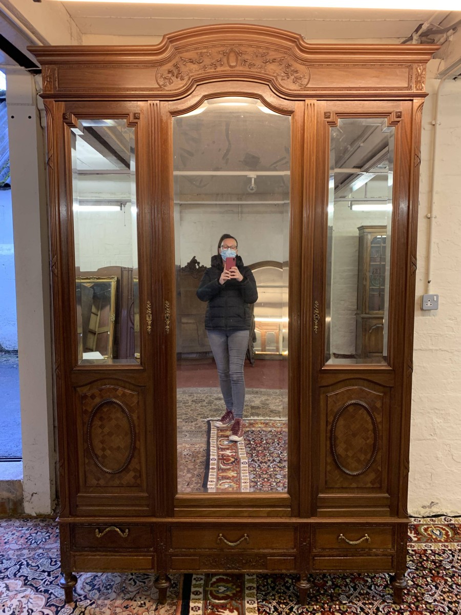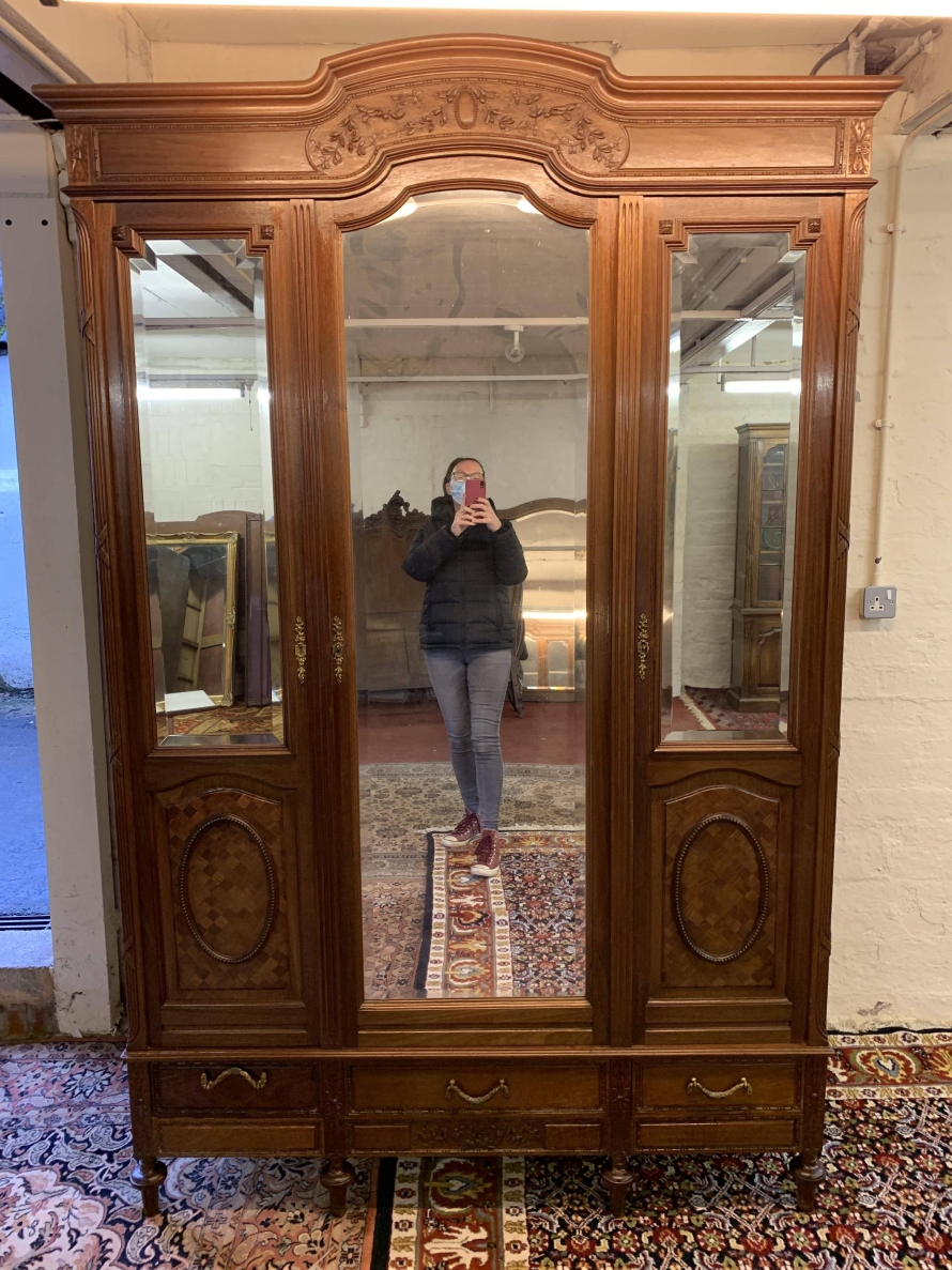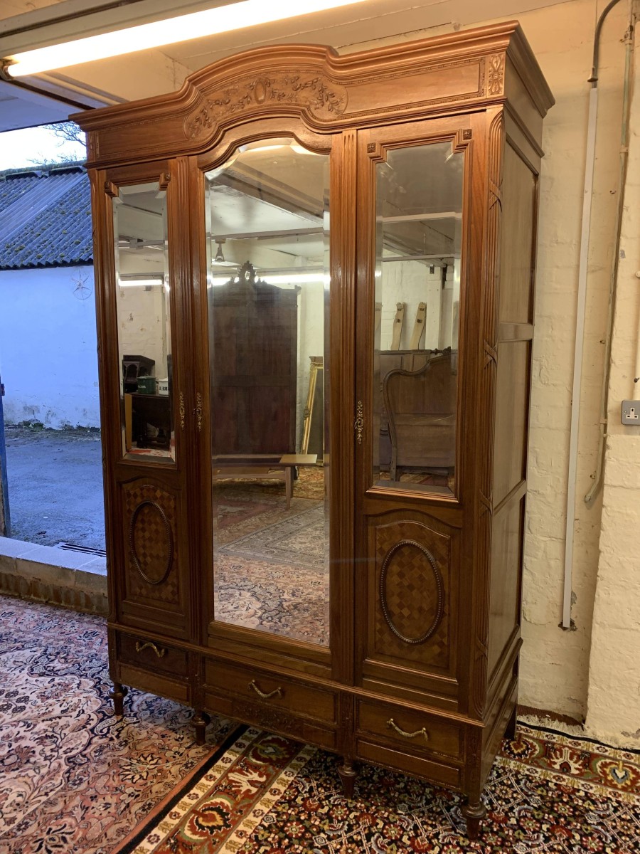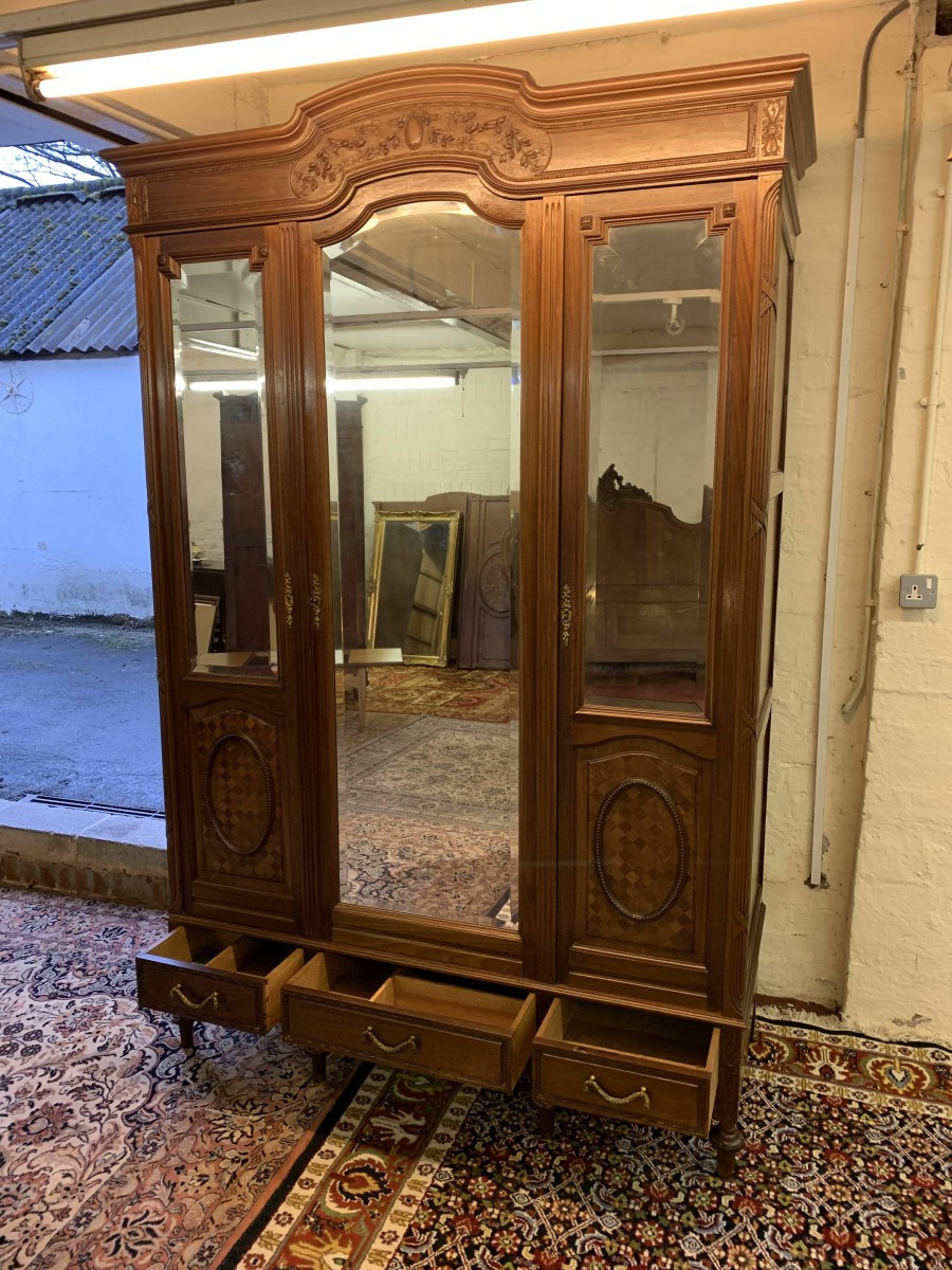 This stunning armoire dates circa 1890 and is in excellent condition. The shaped oversailing top has decorative carving to the front. Below is a full length bevel edged central mirrored lockable door. This door is flanked by a pair of doors, each door having a bevel edged mirror to the top and a fabulous parquetry inlaid recessed panel below. The left-hand door and central door open to reveal a hanging rail. The right-hand door opens to reveal five removable shelves. Below are three drawers each with brass handle. Recessed panelled sides, this stunning antique rmoire stands on four turned legs to the front.