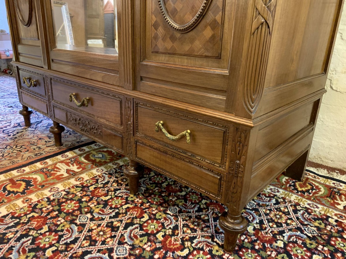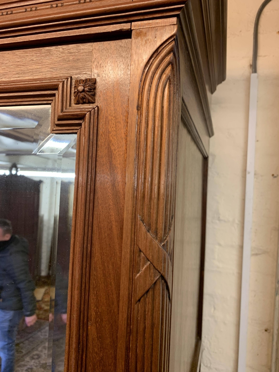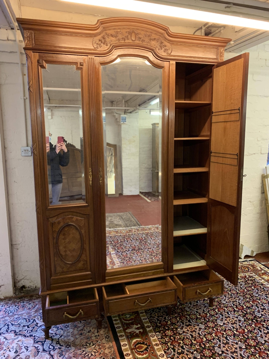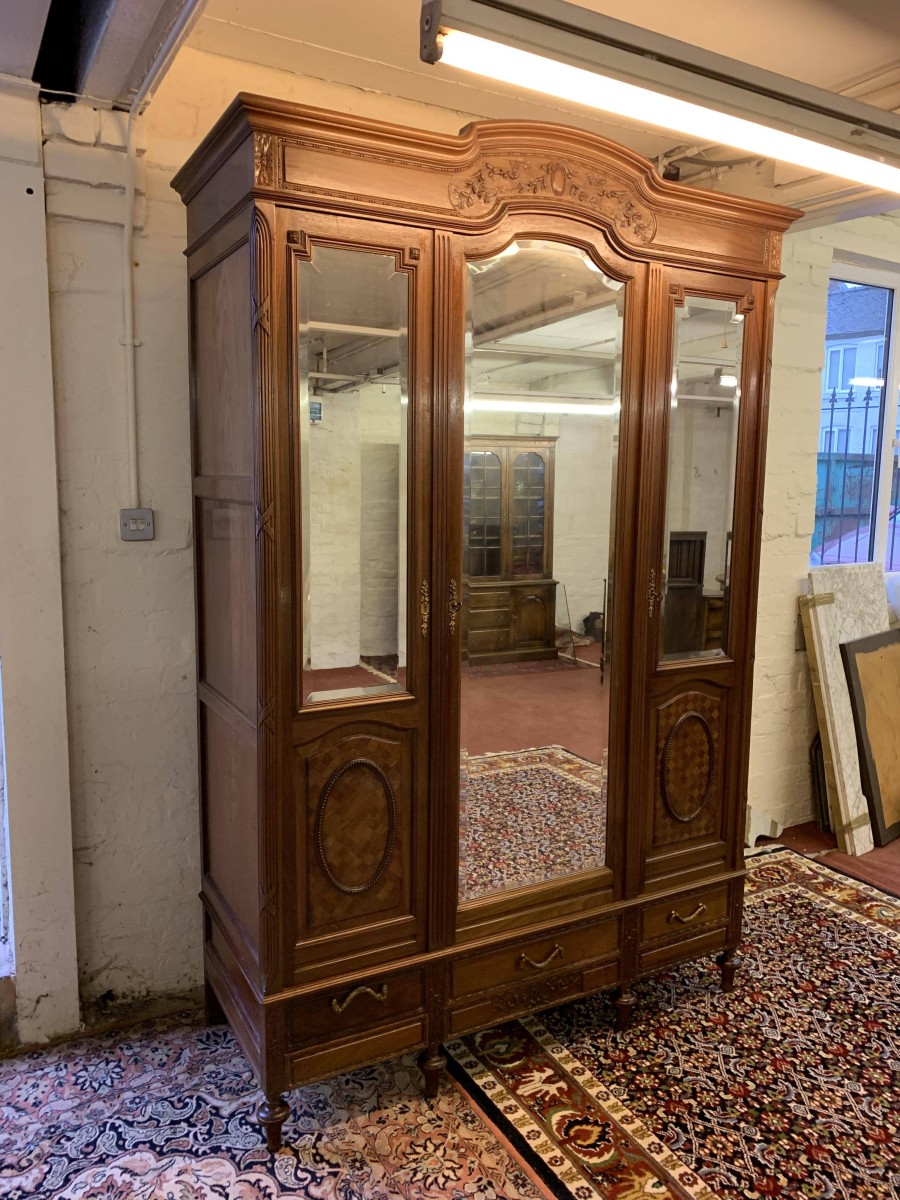 This stunning armoire dates circa 1890 and is in excellent condition. The shaped oversailing top has decorative carving to the front. Below is a full length bevel edged central mirrored lockable door. This door is flanked by a pair of doors, each door having a bevel edged mirror to the top and a fabulous parquetry inlaid recessed panel below. The left-hand door and central door open to reveal a hanging rail. The right-hand door opens to reveal five removable shelves. Below are three drawers each with brass handle. Recessed panelled sides, this stunning antique rmoire stands on four turned legs to the front.