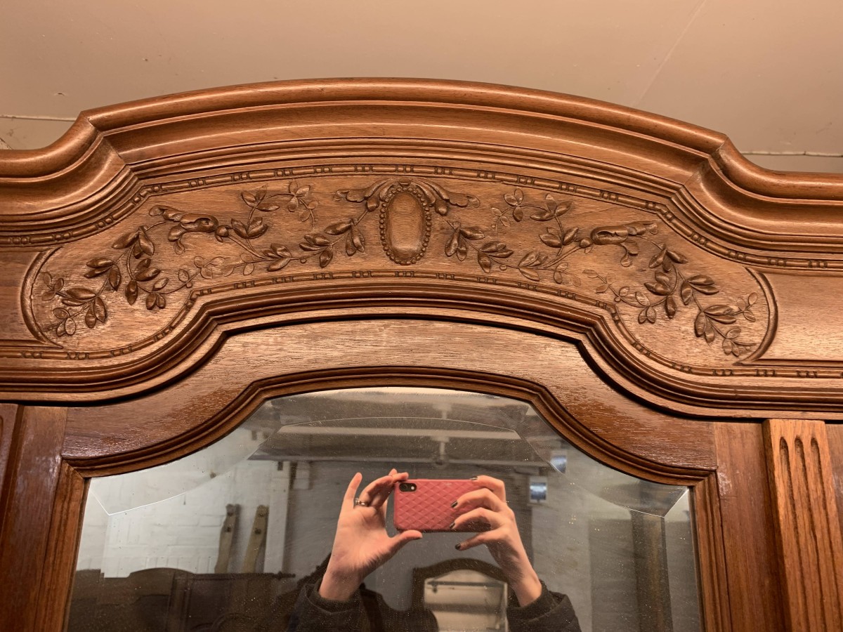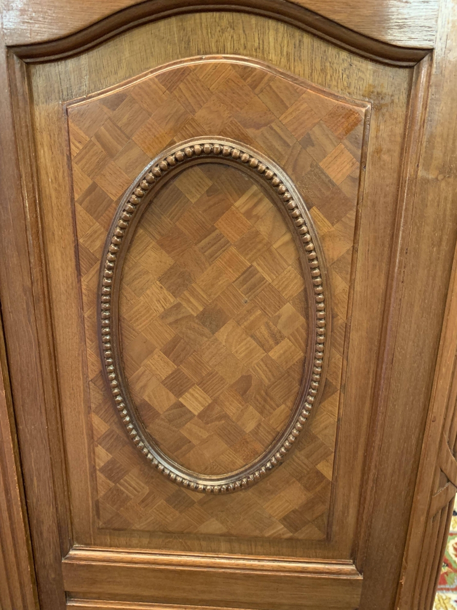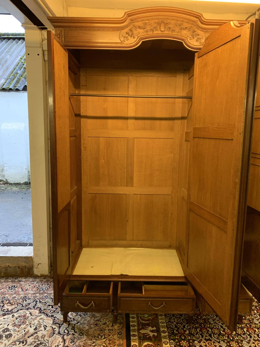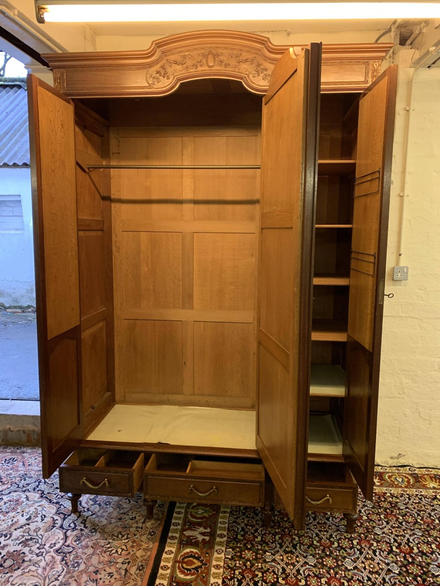 This stunning armoire dates circa 1890 and is in excellent condition. The shaped oversailing top has decorative carving to the front. Below is a full length bevel edged central mirrored lockable door. This door is flanked by a pair of doors, each door having a bevel edged mirror to the top and a fabulous parquetry inlaid recessed panel below. The left-hand door and central door open to reveal a hanging rail. The right-hand door opens to reveal five removable shelves. Below are three drawers each with brass handle. Recessed panelled sides, this stunning antique rmoire stands on four turned legs to the front.