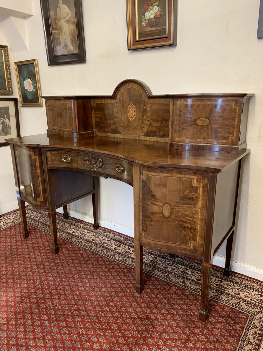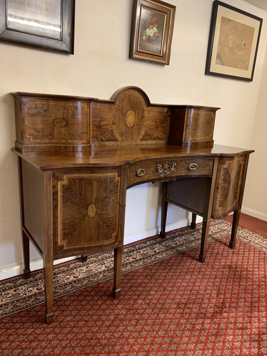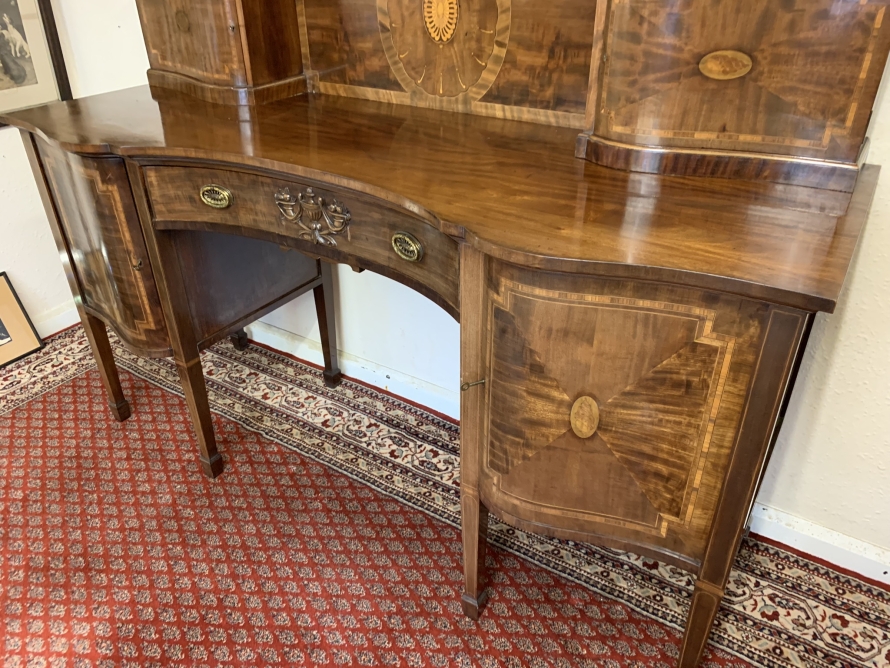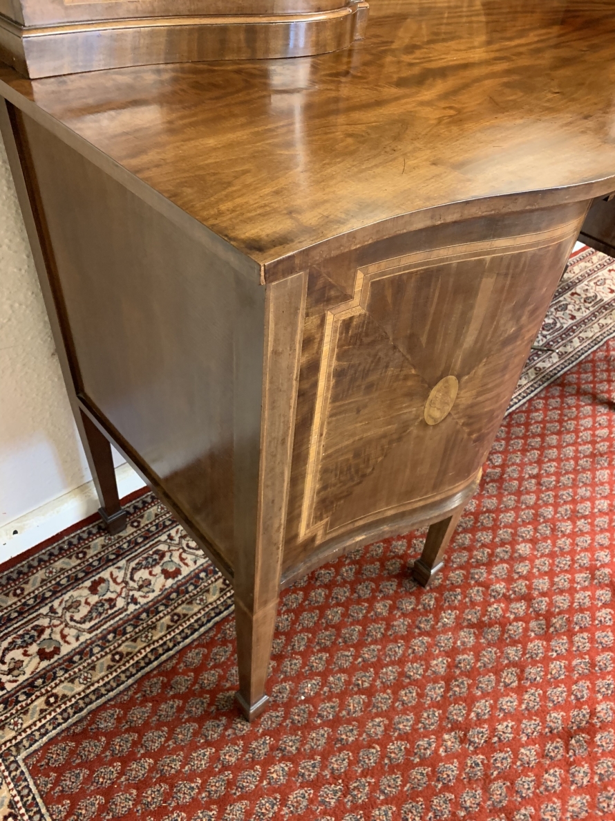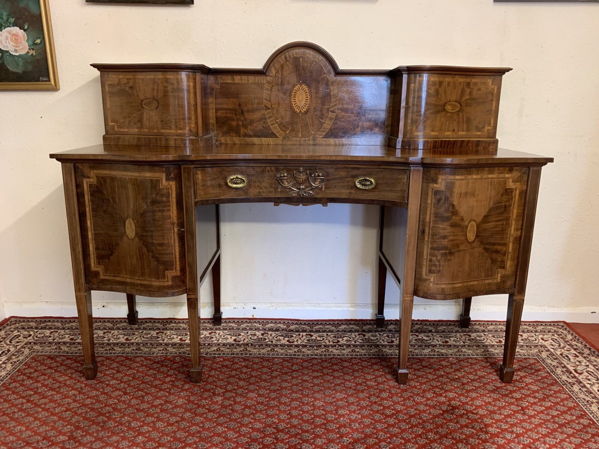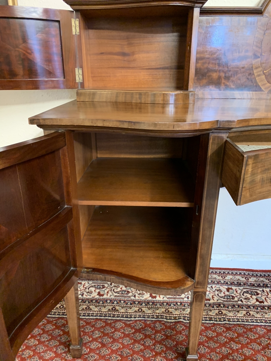 This stunning dresser dates circa 1910. The back section consists of a pair of lockable shaped inlaid decorated cupboard doors which flank a striking inlaid central curved panel. Below are a pair of lockable shaped inlaid doors with a curved drawer which has fabulous carved decoration and a pair of brass handles this fine item of antique English furniture stands on eight inlaid tapered legs.
