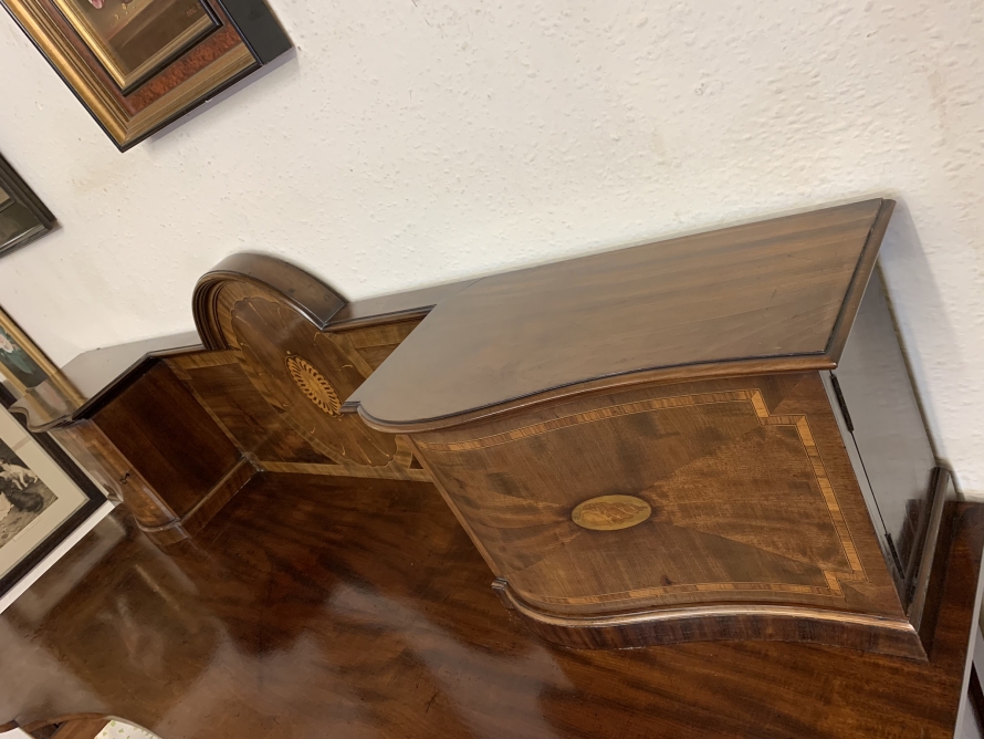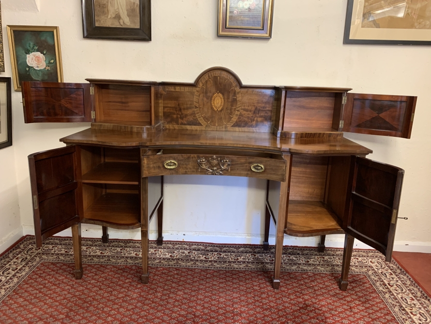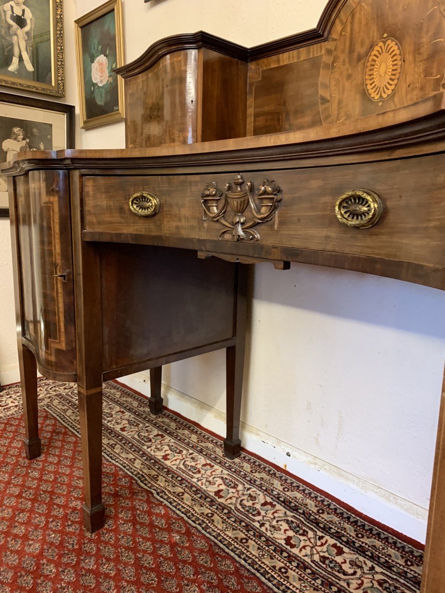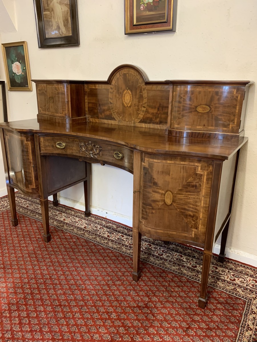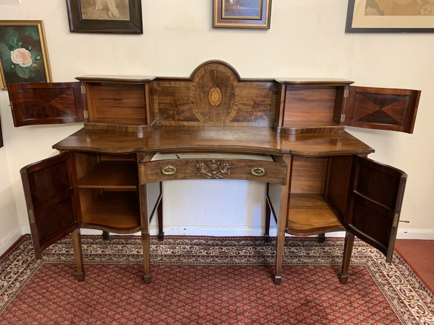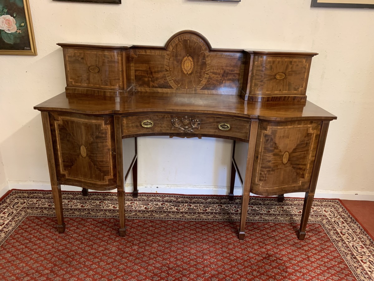 This stunning dresser dates circa 1910. The back section consists of a pair of lockable shaped inlaid decorated cupboard doors which flank a striking inlaid central curved panel. Below are a pair of lockable shaped inlaid doors with a curved drawer which has fabulous carved decoration and a pair of brass handles this fine item of antique English furniture stands on eight inlaid tapered legs.