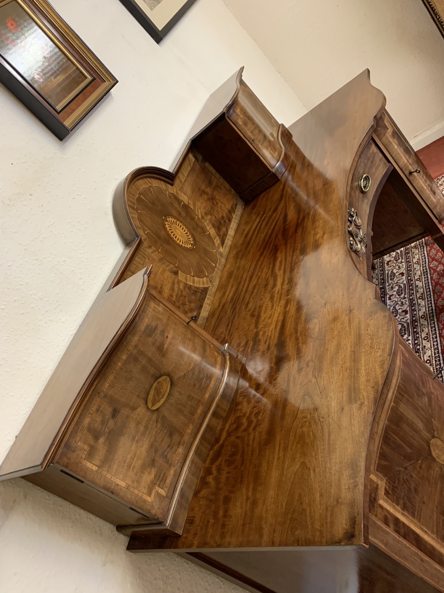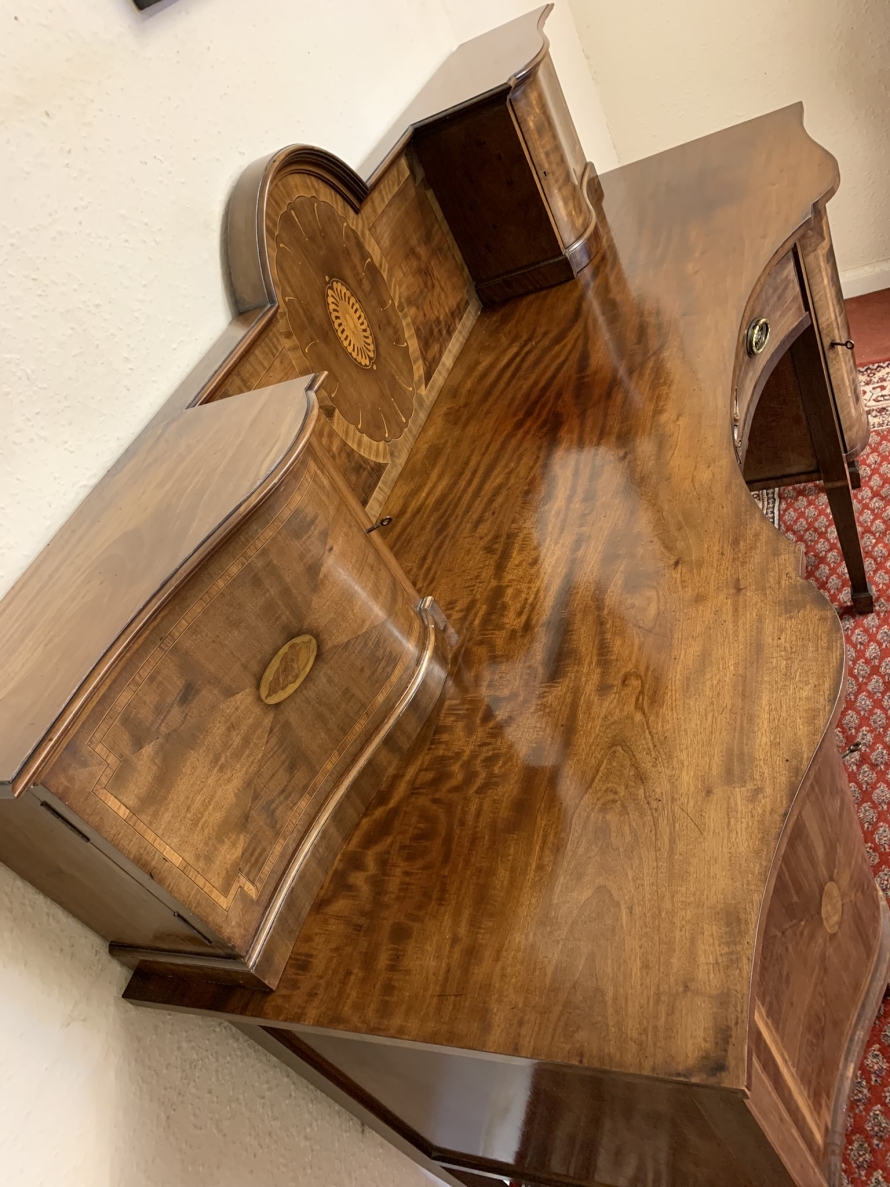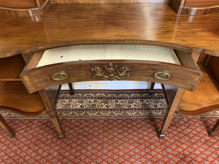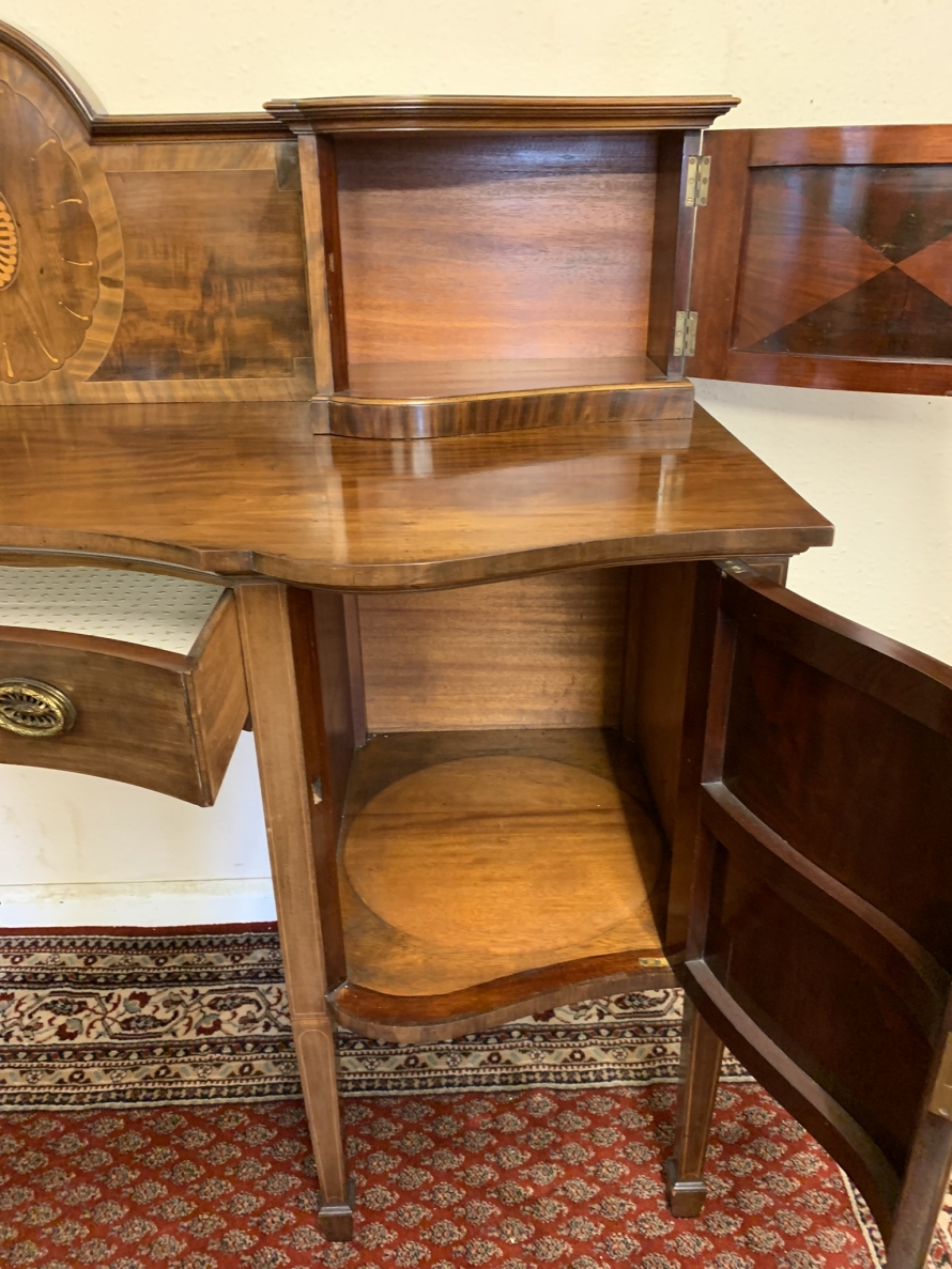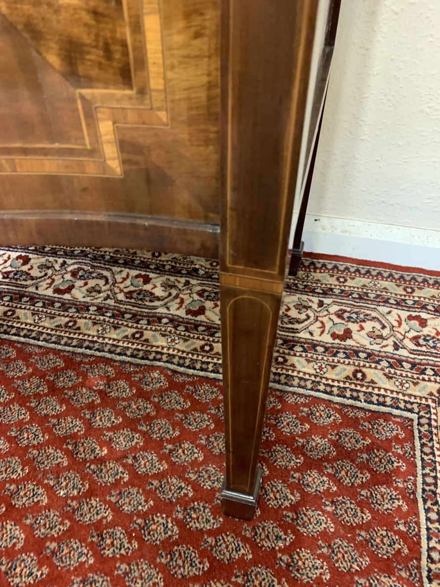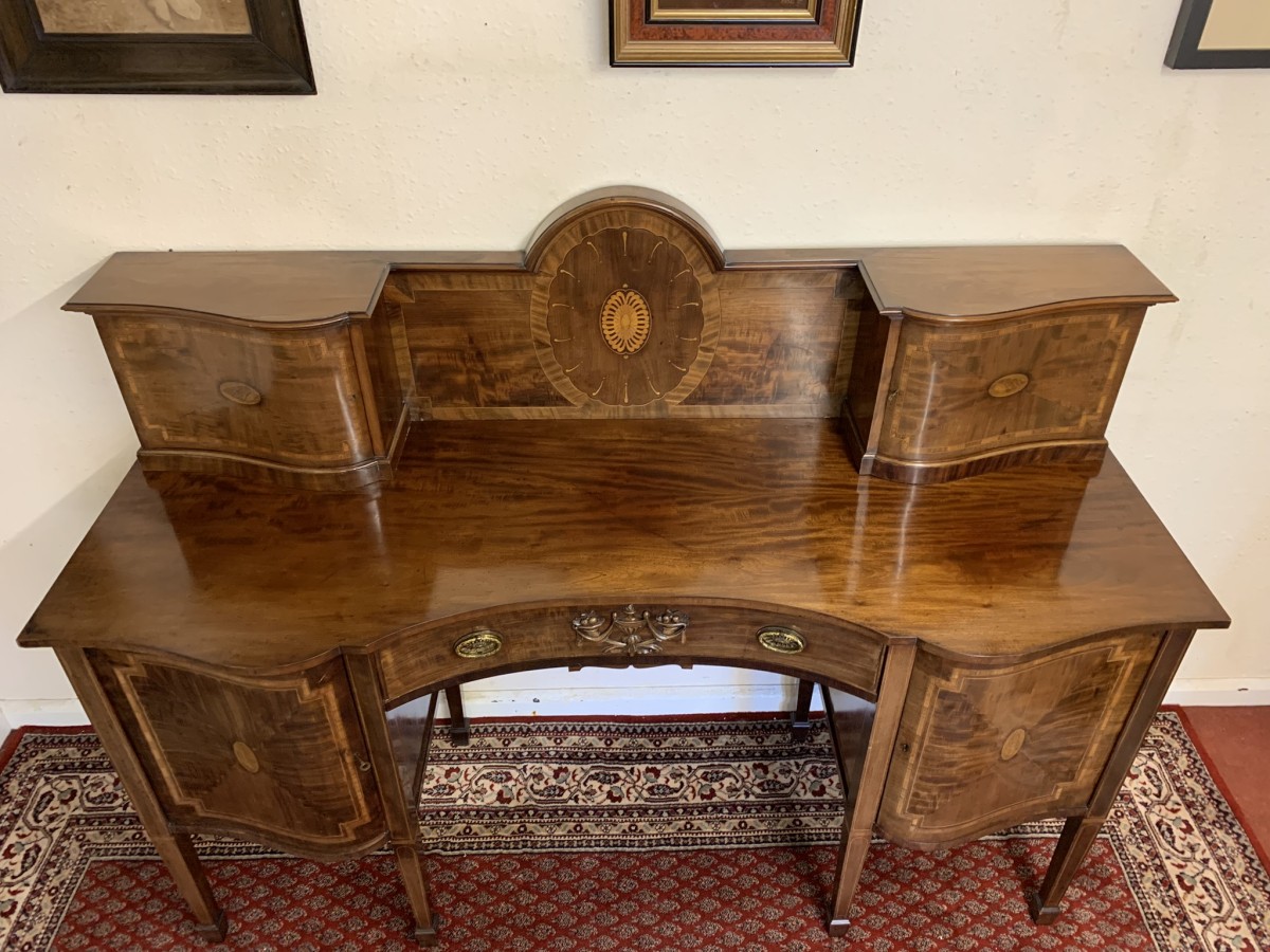 This stunning dresser dates circa 1910. The back section consists of a pair of lockable shaped inlaid decorated cupboard doors which flank a striking inlaid central curved panel. Below are a pair of lockable shaped inlaid doors with a curved drawer which has fabulous carved decoration and a pair of brass handles this fine item of antique English furniture stands on eight inlaid tapered legs.