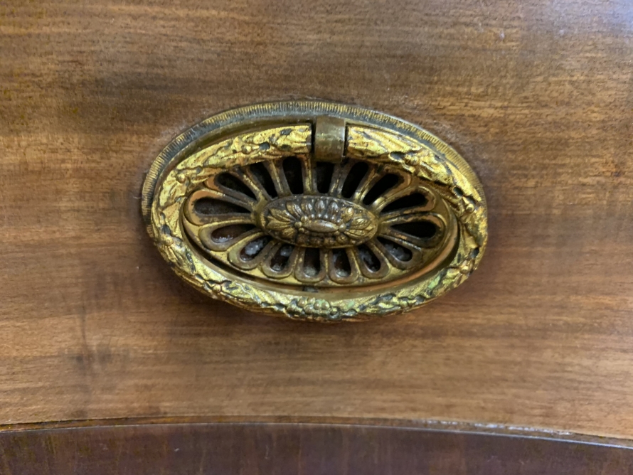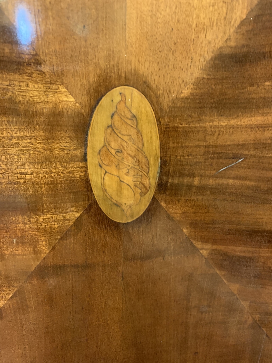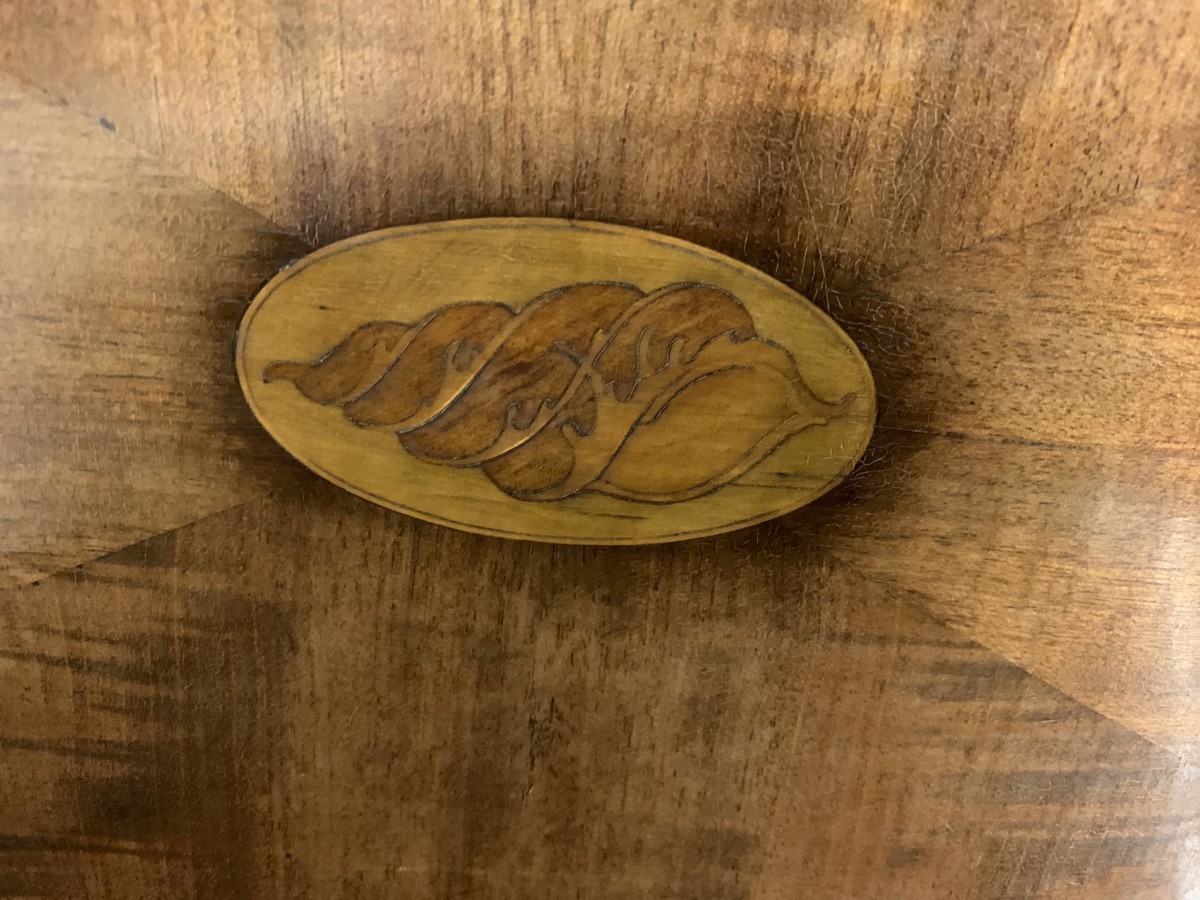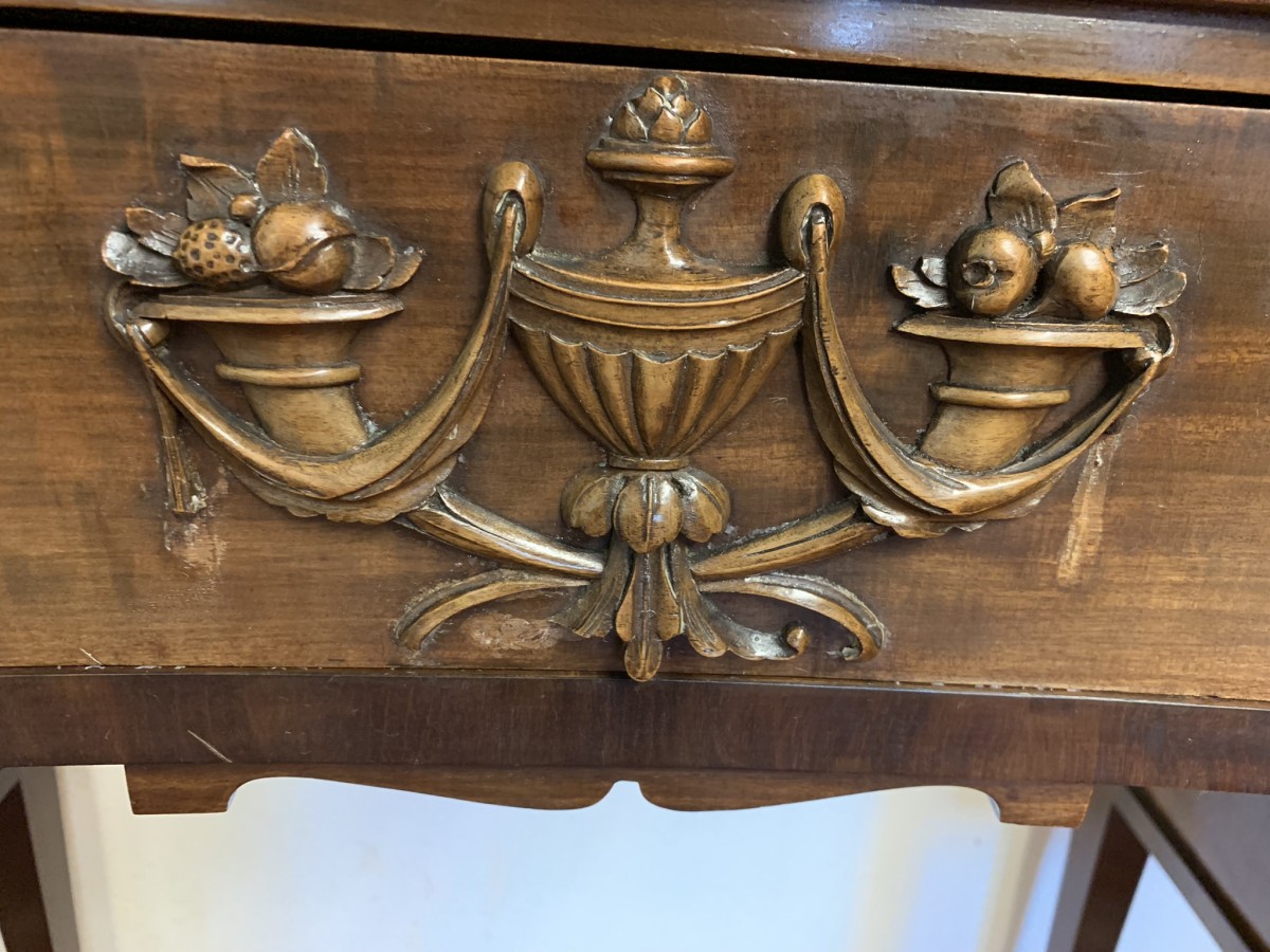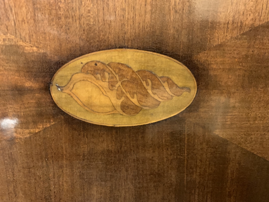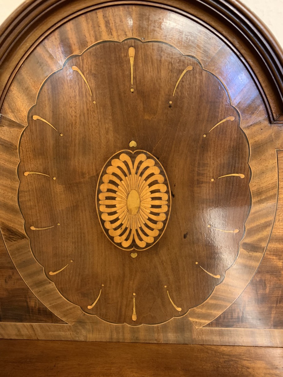 This stunning dresser dates circa 1910. The back section consists of a pair of lockable shaped inlaid decorated cupboard doors which flank a striking inlaid central curved panel. Below are a pair of lockable shaped inlaid doors with a curved drawer which has fabulous carved decoration and a pair of brass handles this fine item of antique English furniture stands on eight inlaid tapered legs.