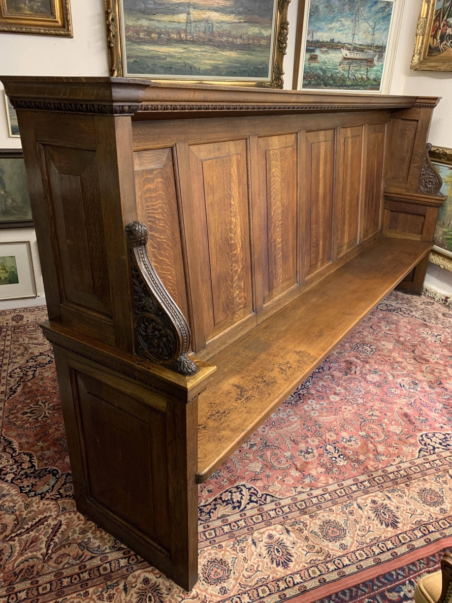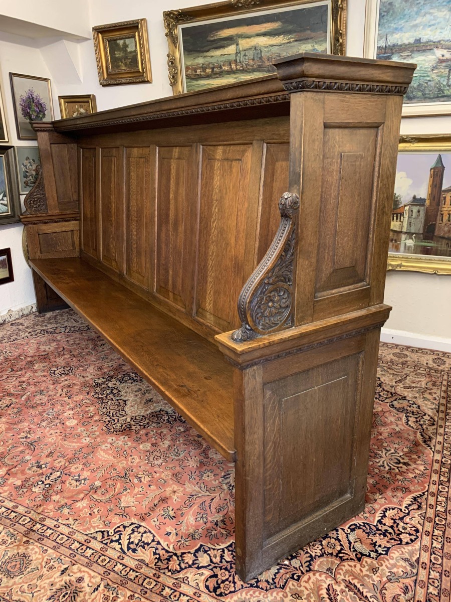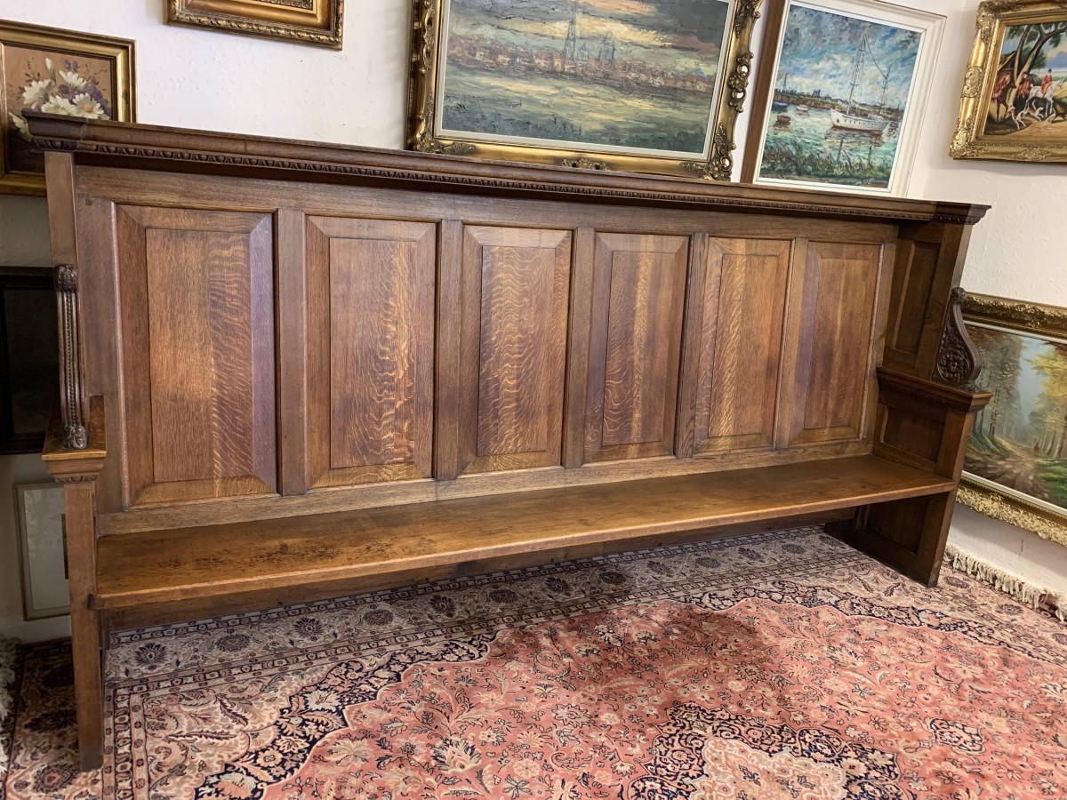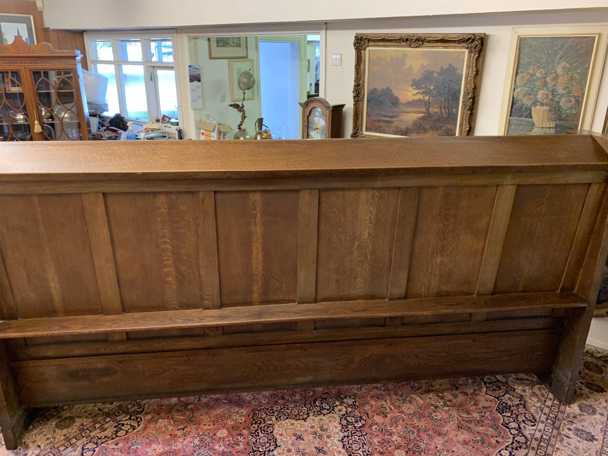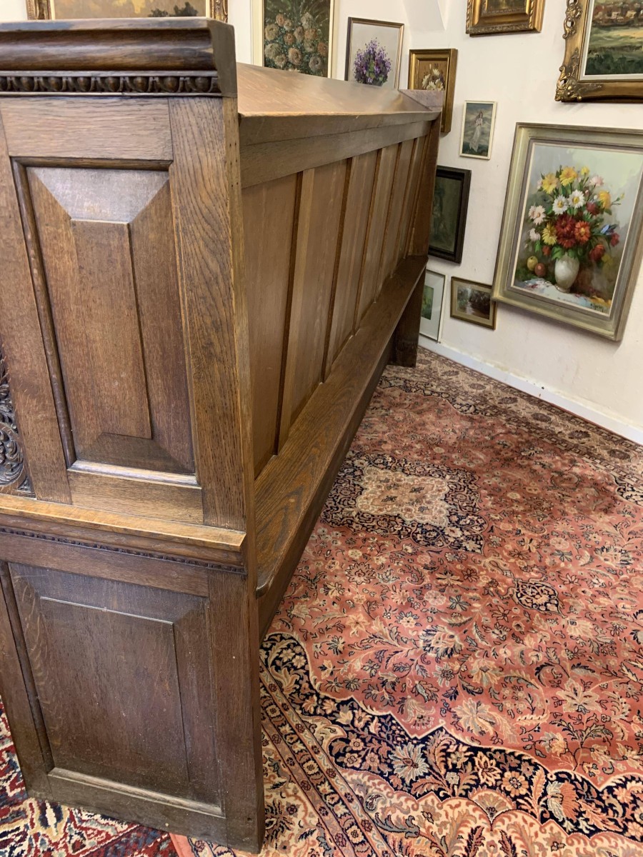 This impressive pew dates circa 1900 and is made in glorious solid oak. The carved back rail sits above six fielded panels. The two ends have fabulous carved mounts. The solid oak seat has fielded panelled ends. There are two original shelves to the back.