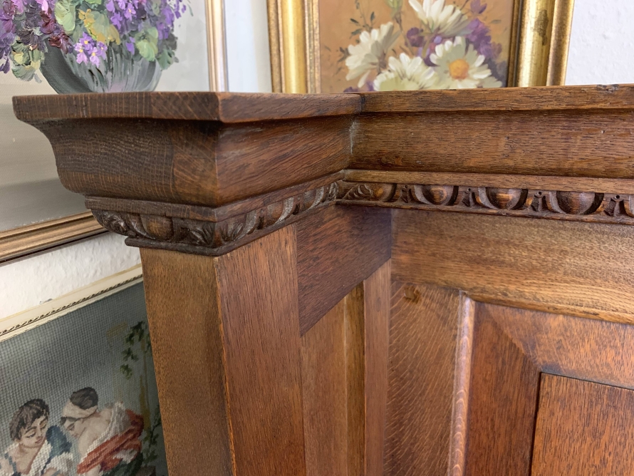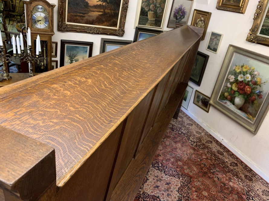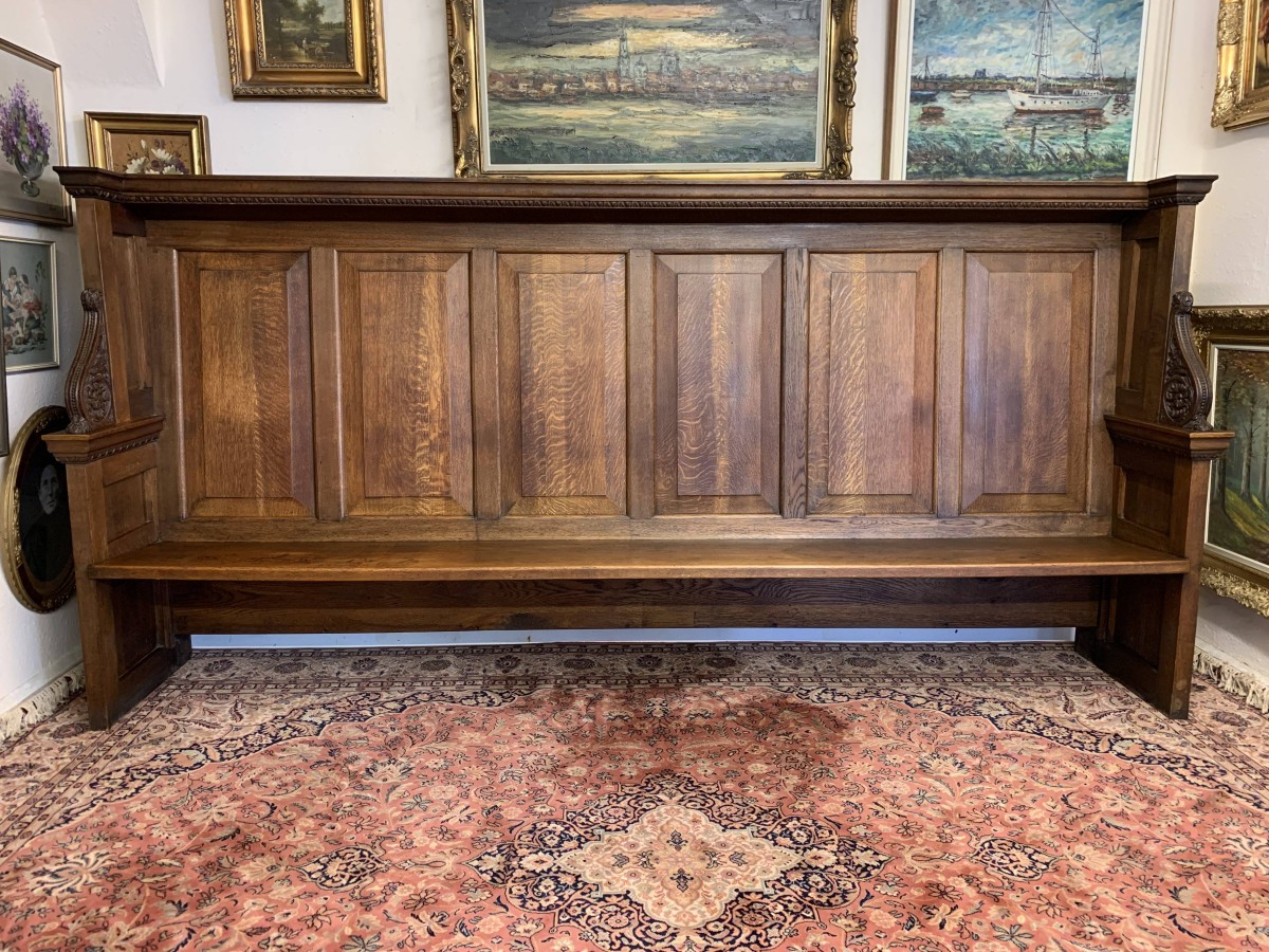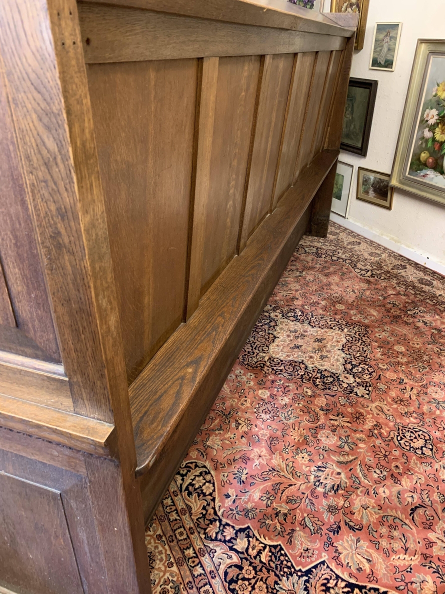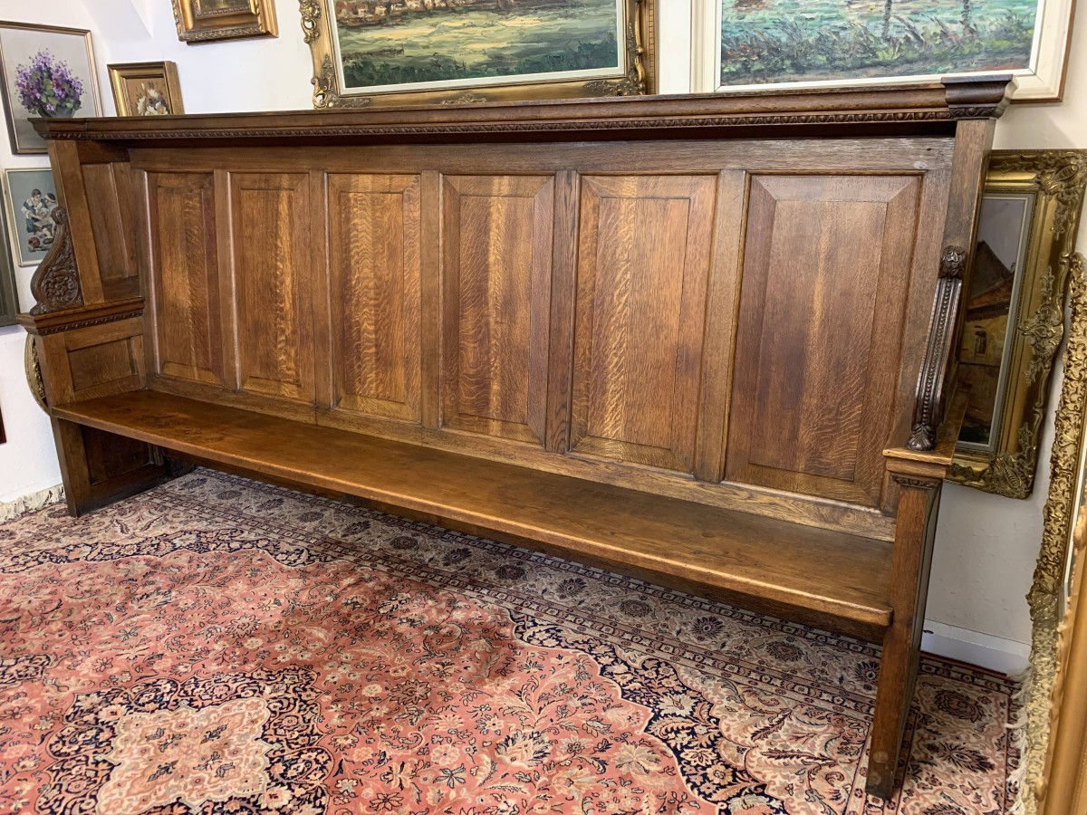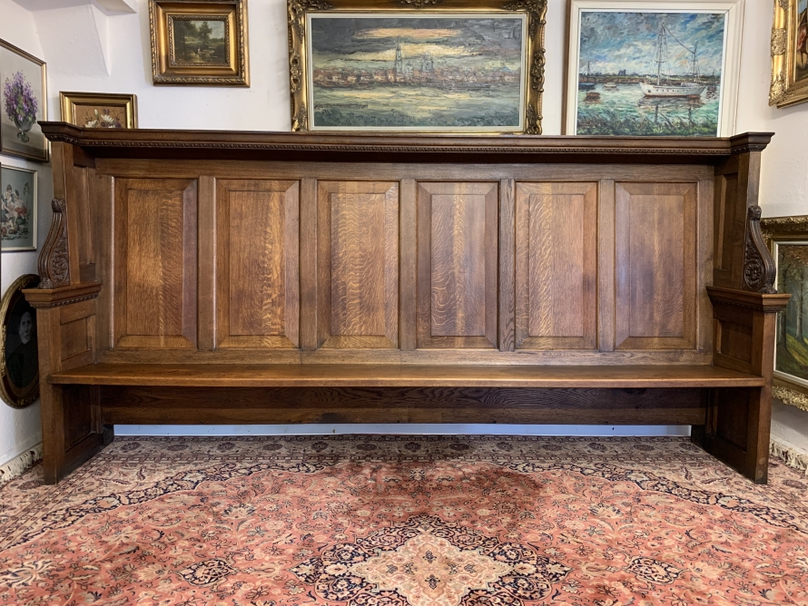 This impressive pew dates circa 1900 and is made in glorious solid oak. The carved back rail sits above six fielded panels. The two ends have fabulous carved mounts. The solid oak seat has fielded panelled ends. There are two original shelves to the back.