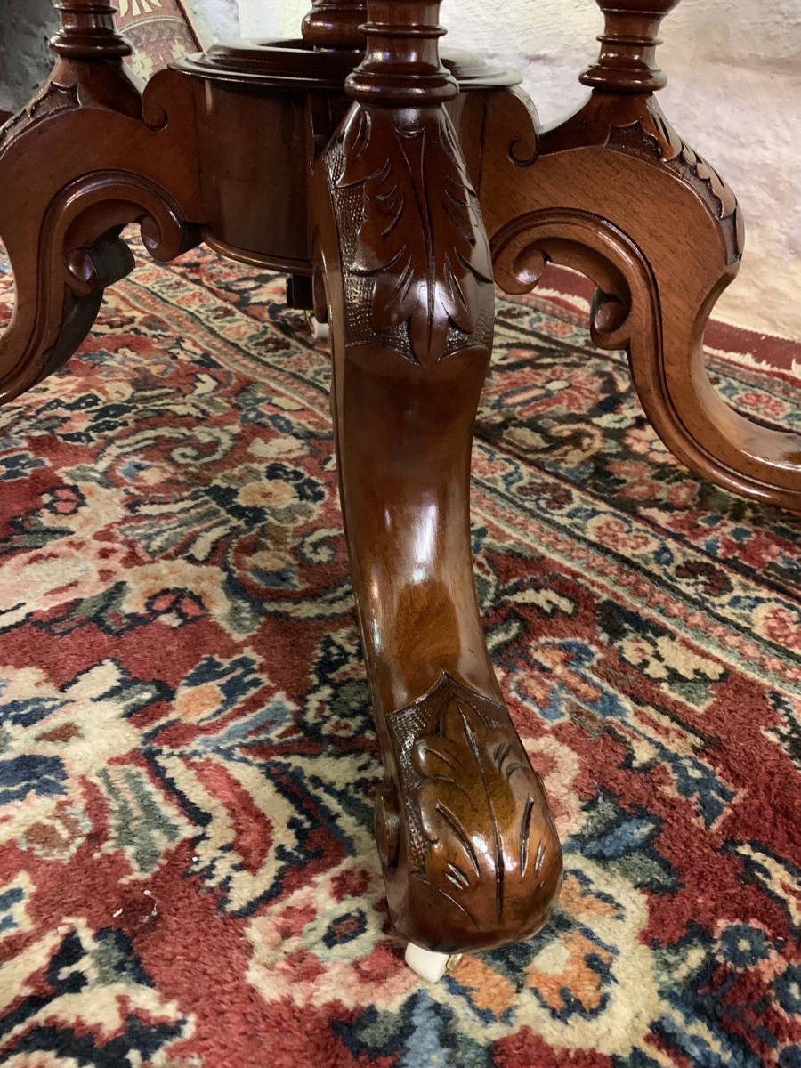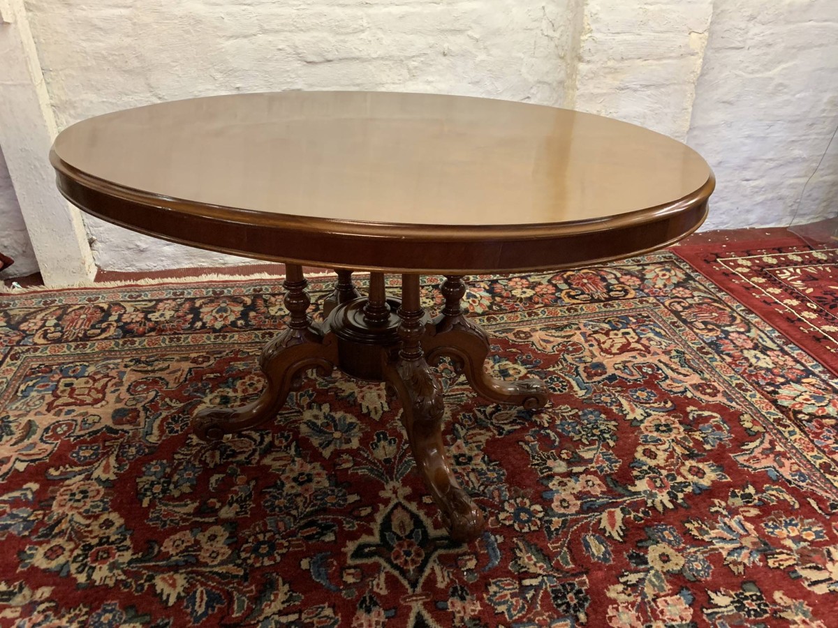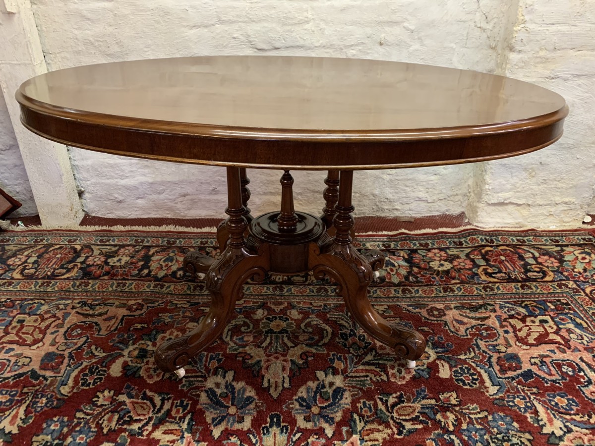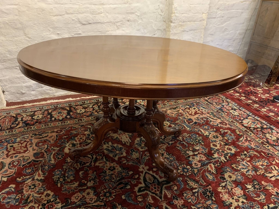 The table dates circa 1885 and is in excellent condition. The beautiful oval top sits on an impressive base, the base having four turned column supports which sit on four fabulous carved shaped legs which sit on original enamel casters.