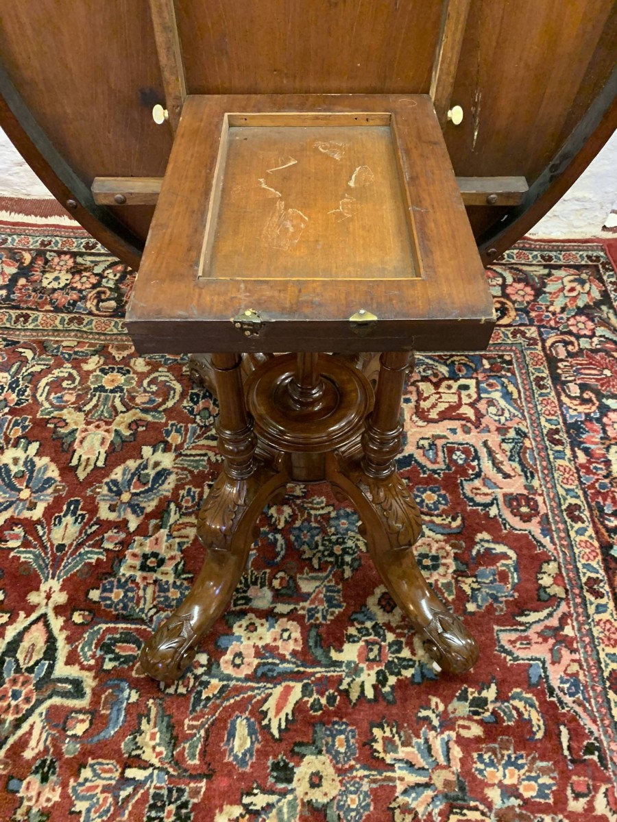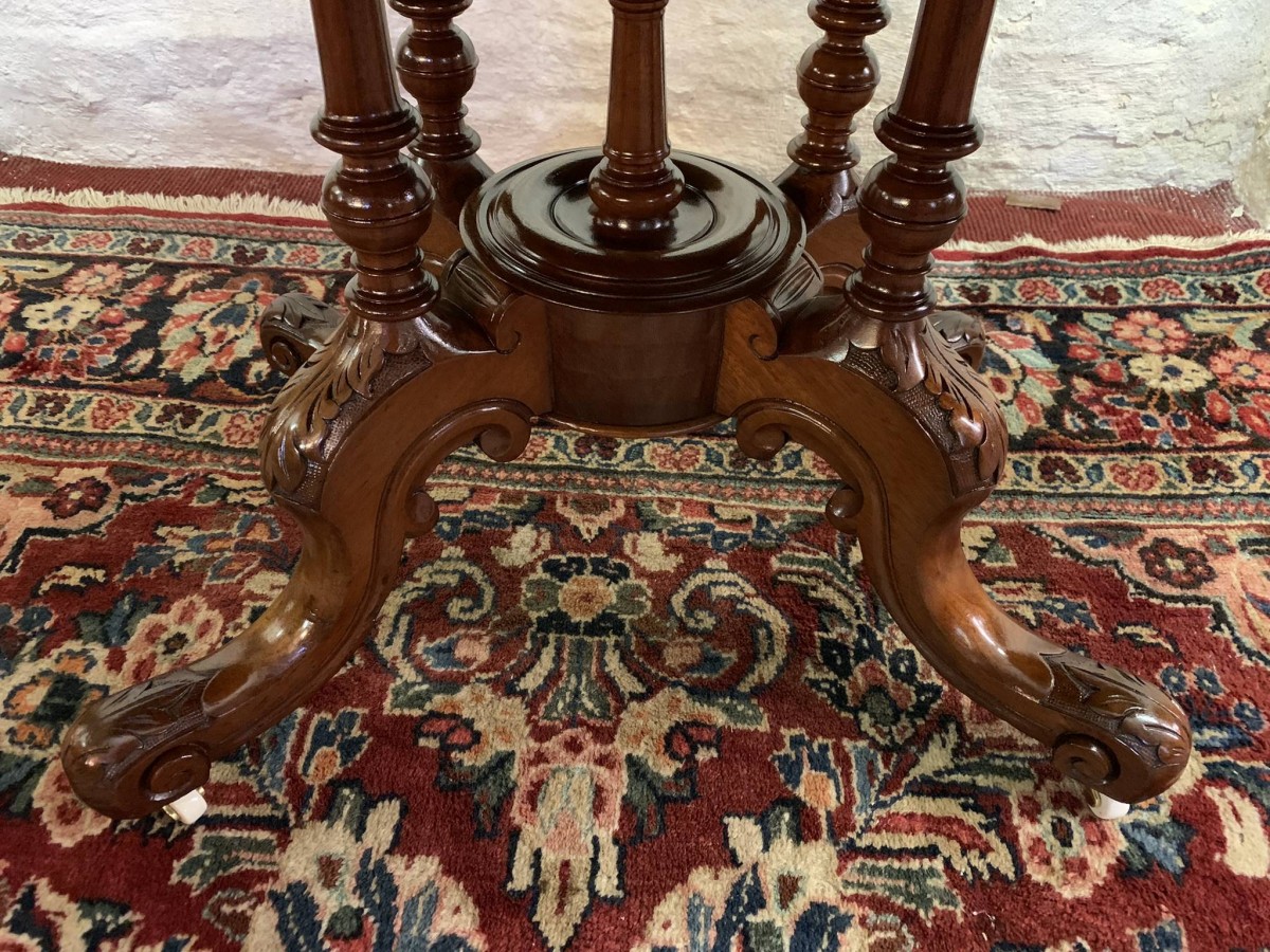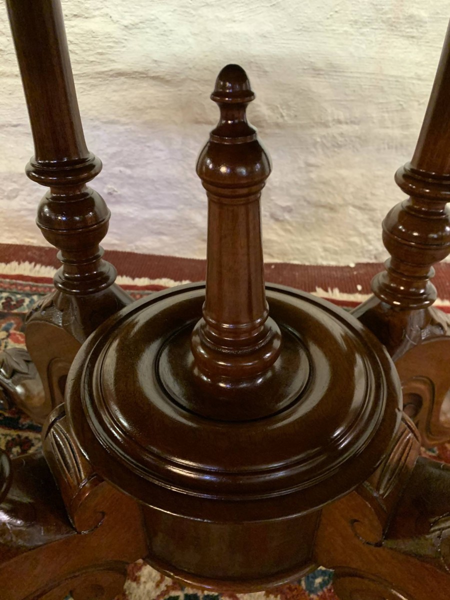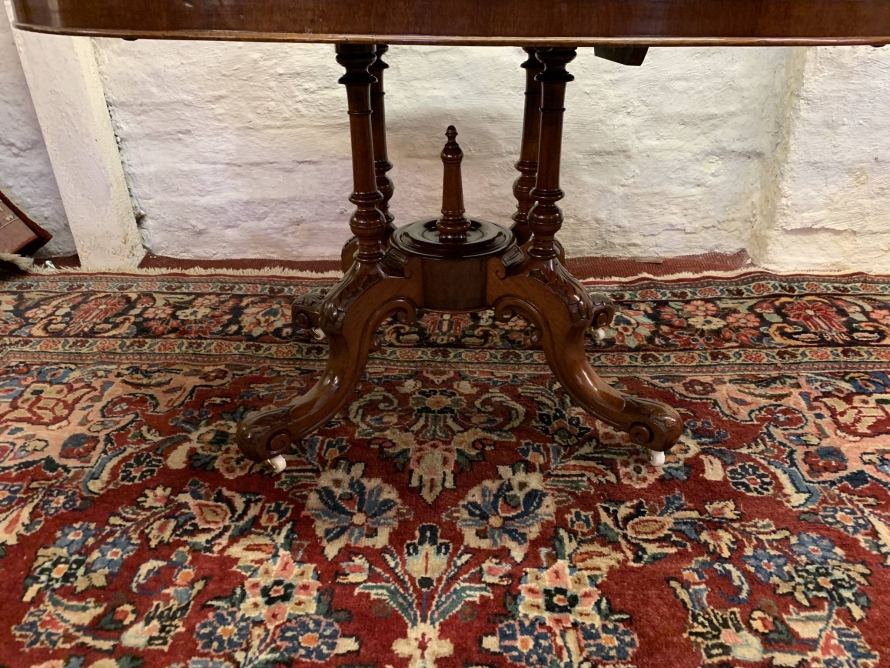 The table dates circa 1885 and is in excellent condition. The beautiful oval top sits on an impressive base, the base having four turned column supports which sit on four fabulous carved shaped legs which sit on original enamel casters.