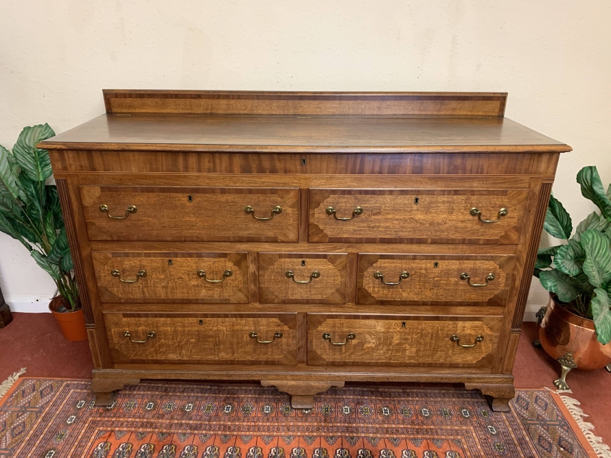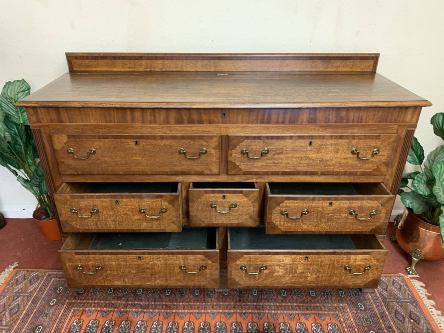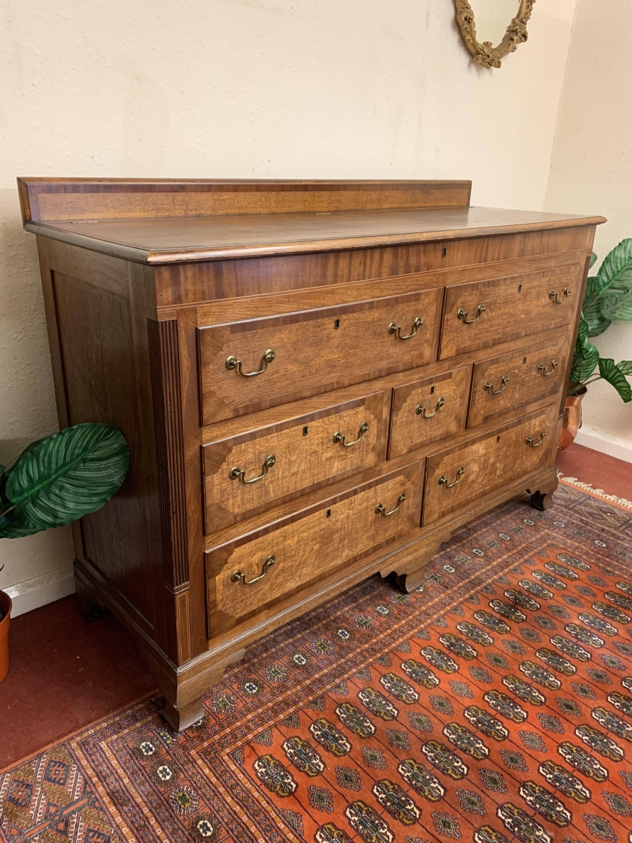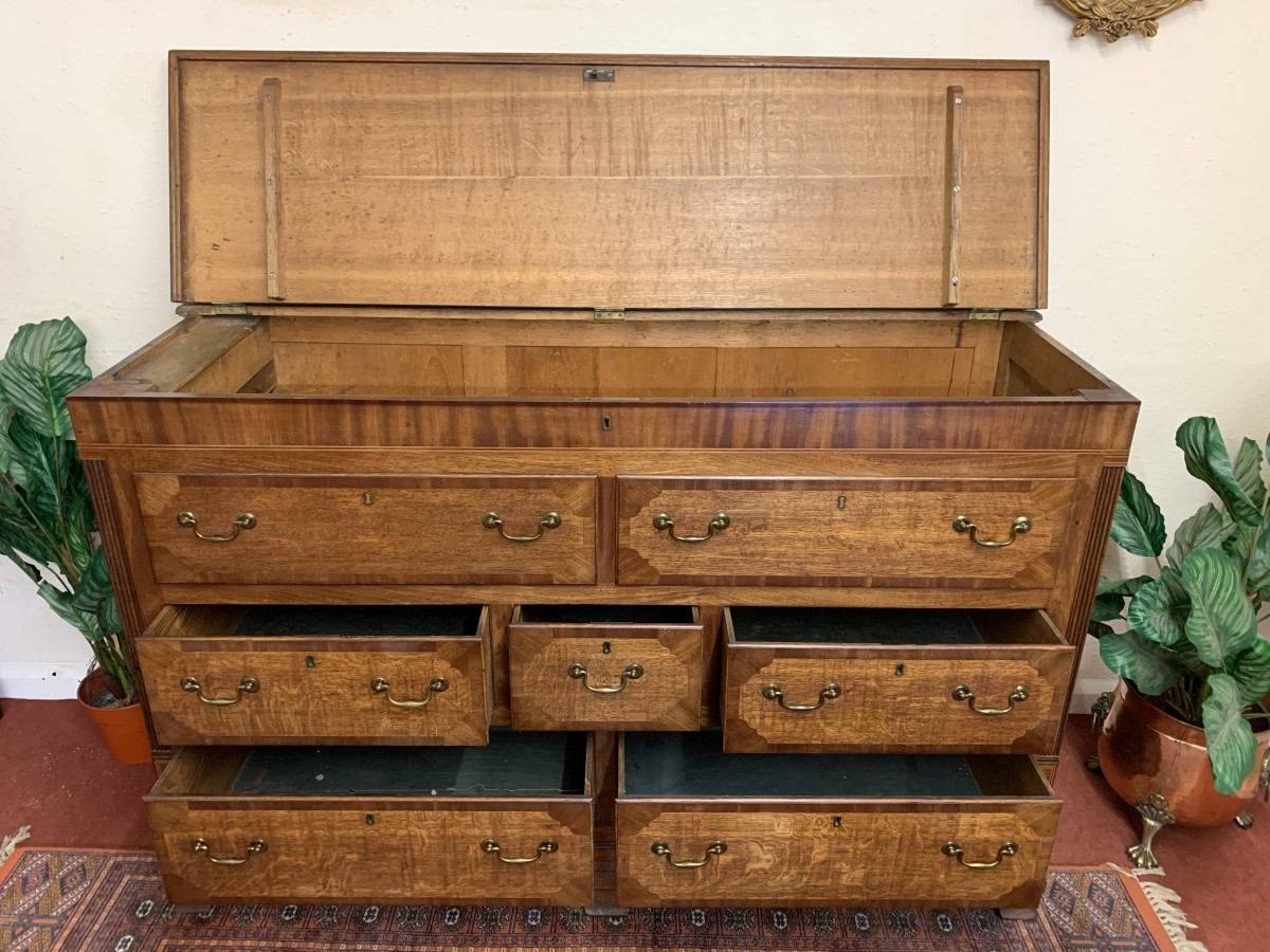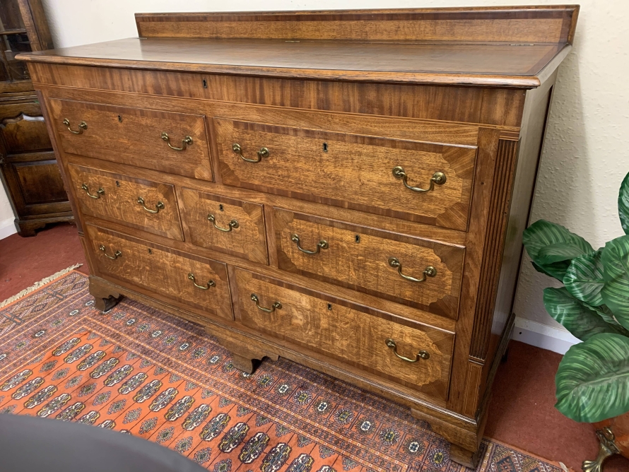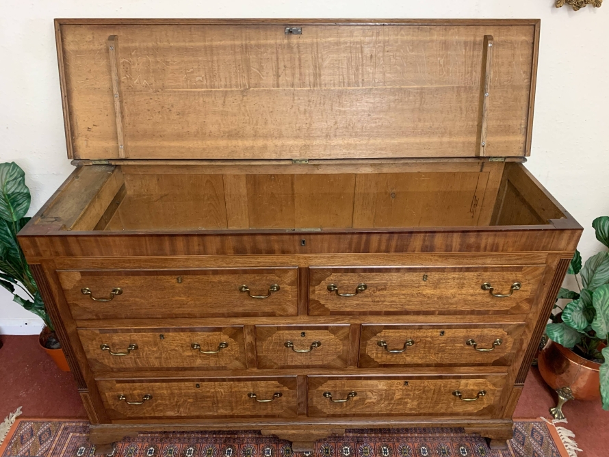 This fantastic chest has a crossbanded lift up lid and there is a crossbanded back stand. The top lifts up to offer storage, below are two dummy drawers which in turn sit above an arrangement of five drawers. Each drawer having unusually shaped crossbanding decoration to the corners and original swan neck drop brass handles. Reeded sides with string inlay decoration below. This outstanding item of English antique furniture sits on five shaped bracket feet.