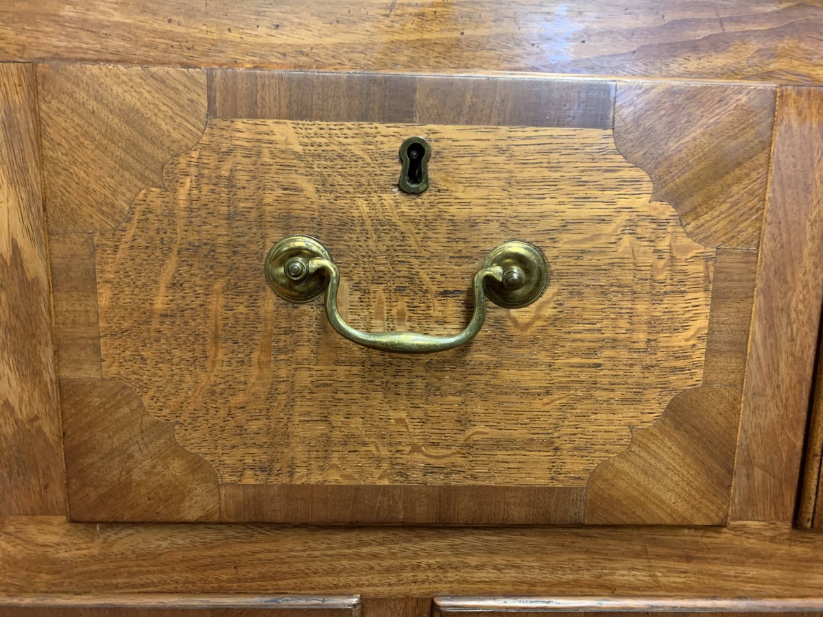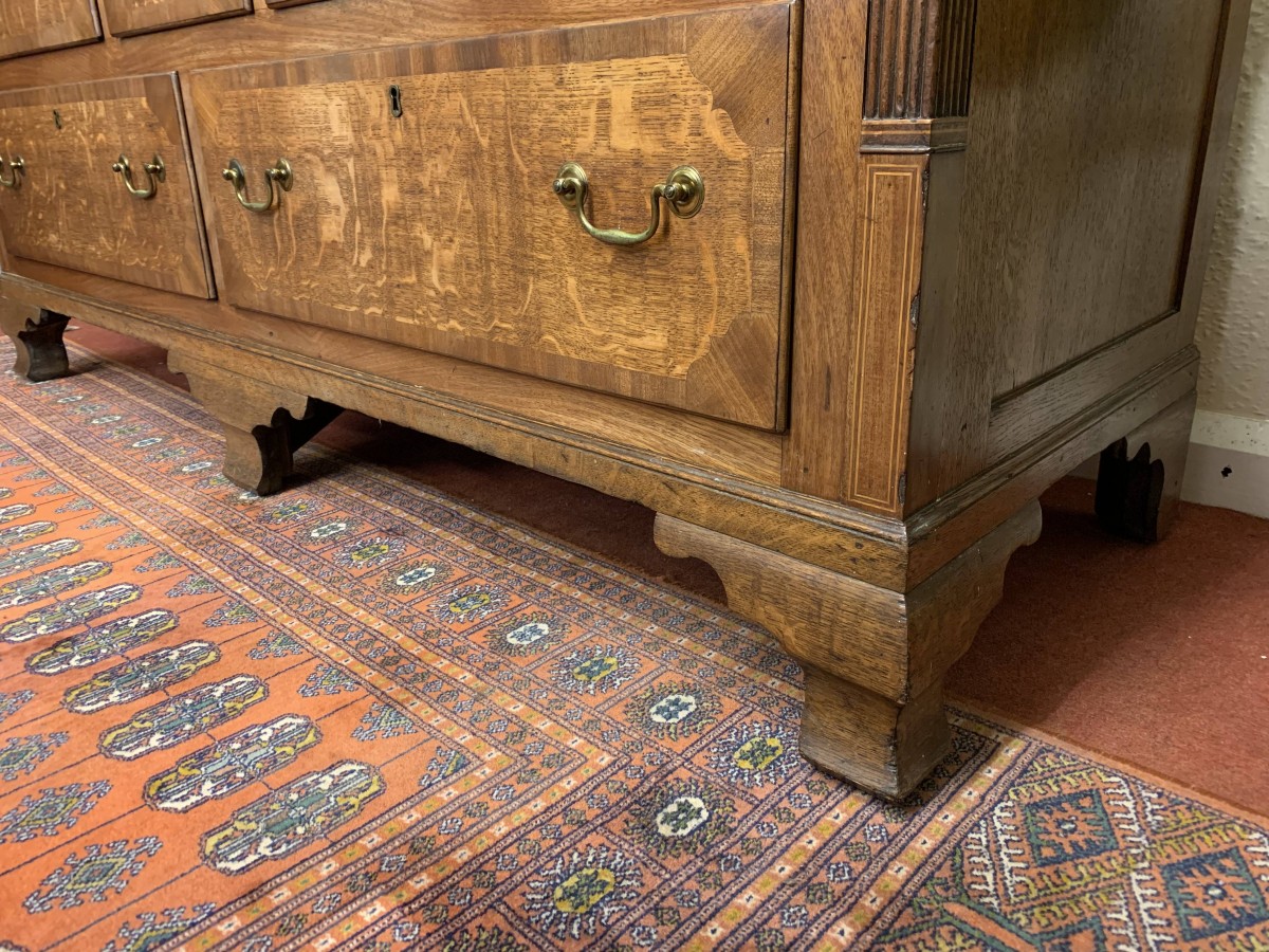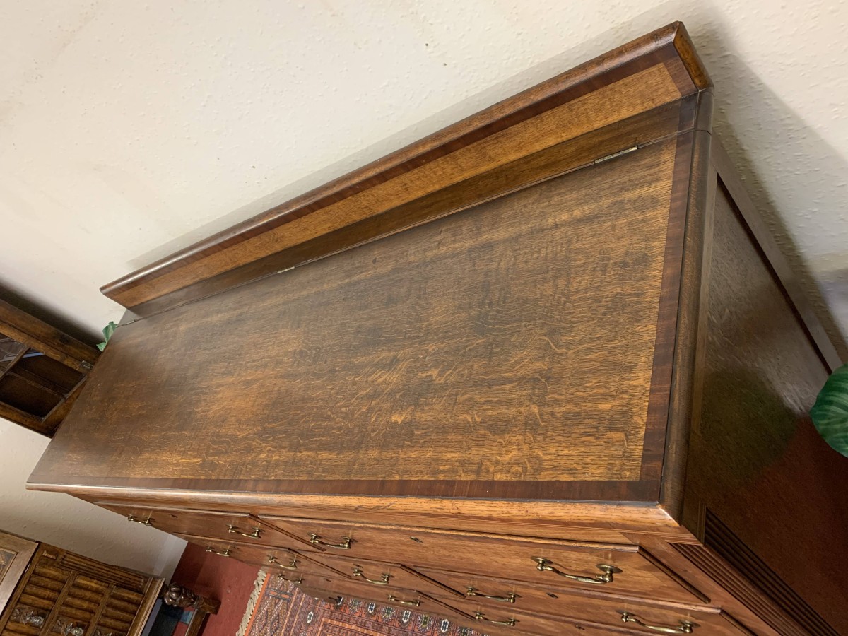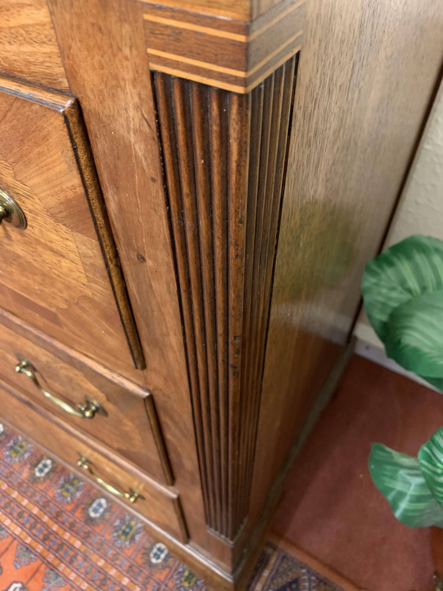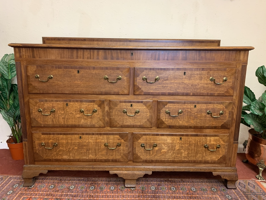 This fantastic chest has a crossbanded lift up lid and there is a crossbanded back stand. The top lifts up to offer storage, below are two dummy drawers which in turn sit above an arrangement of five drawers. Each drawer having unusually shaped crossbanding decoration to the corners and original swan neck drop brass handles. Reeded sides with string inlay decoration below. This outstanding item of English antique furniture sits on five shaped bracket feet.