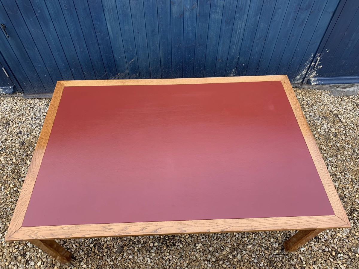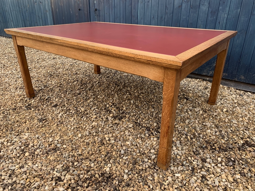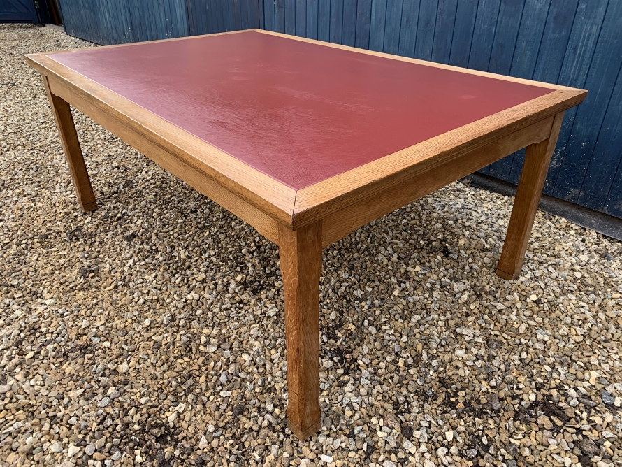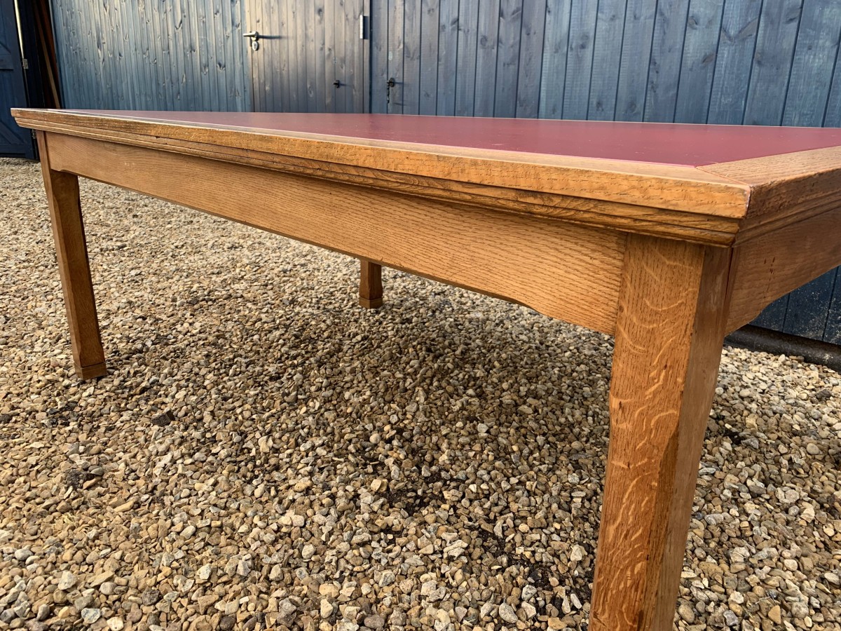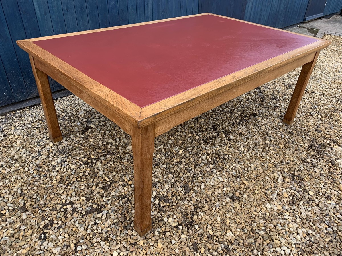 The table has a red leather top. The table sits on four oak legs, the legs having chamfered corners. The table dates circa 1925. The table would be ideal for a shop display.