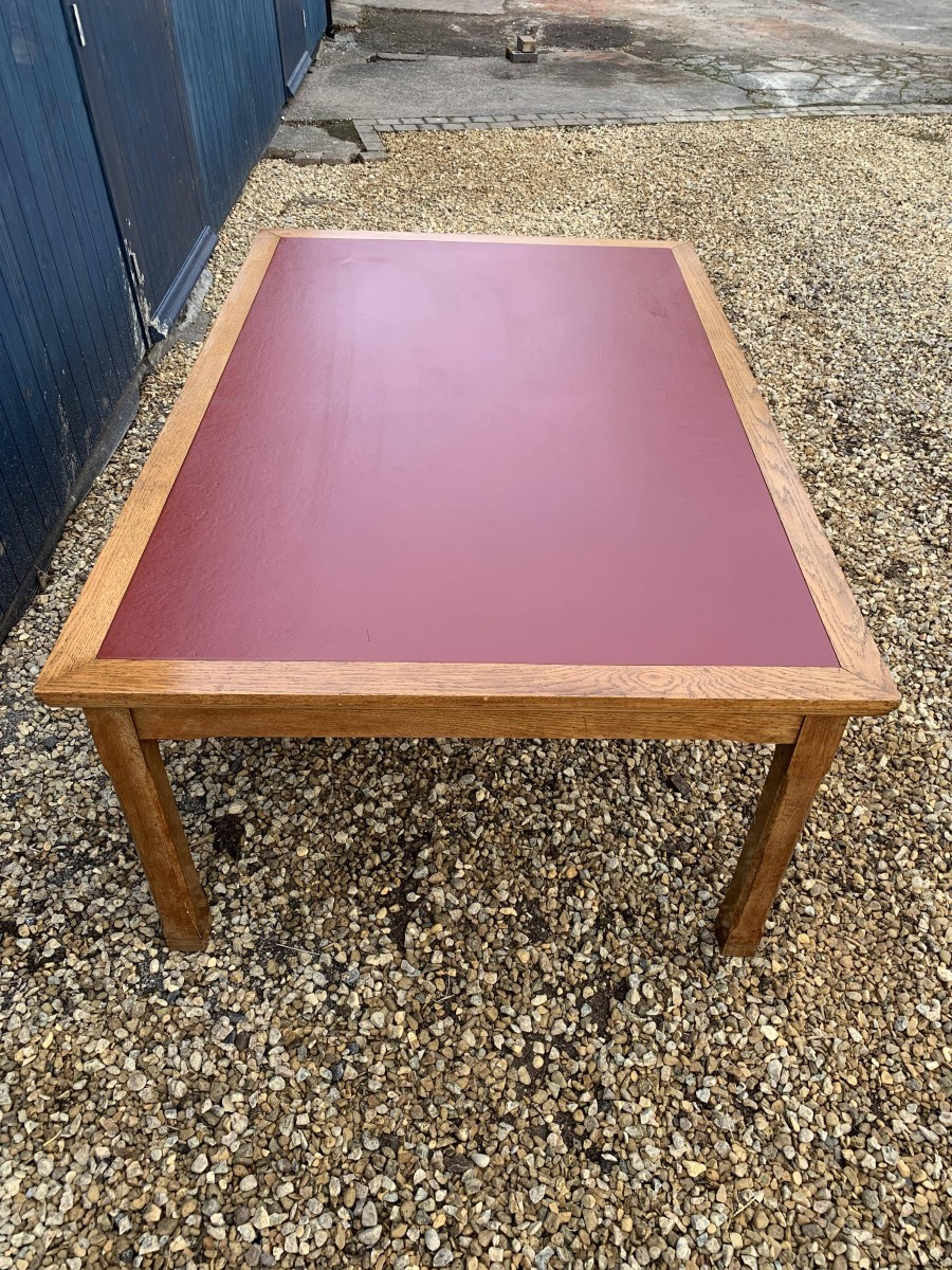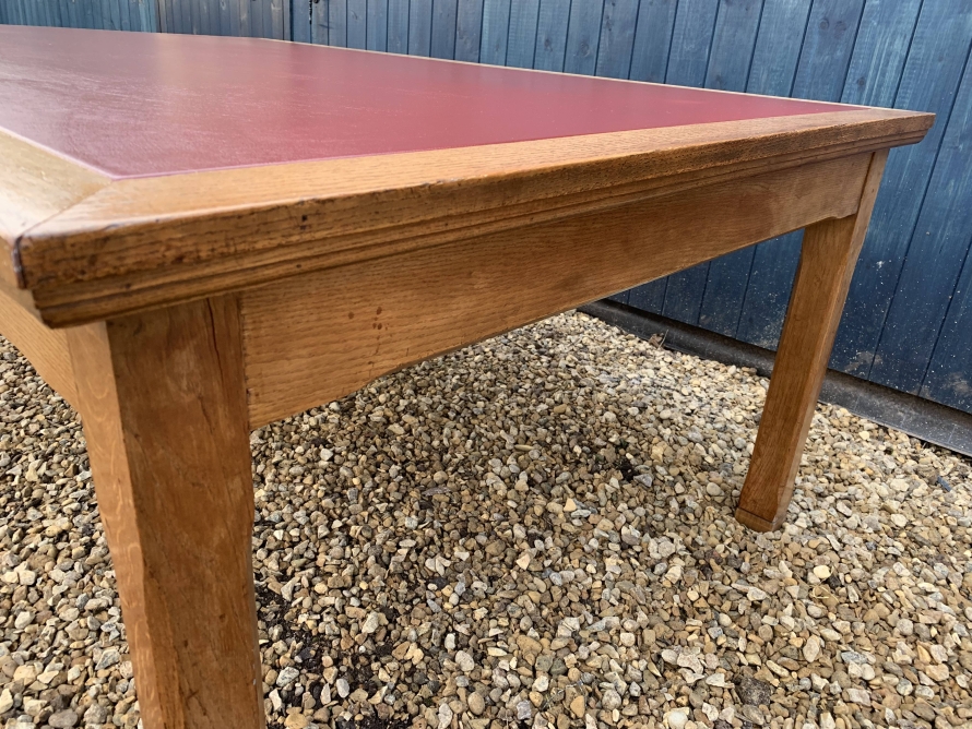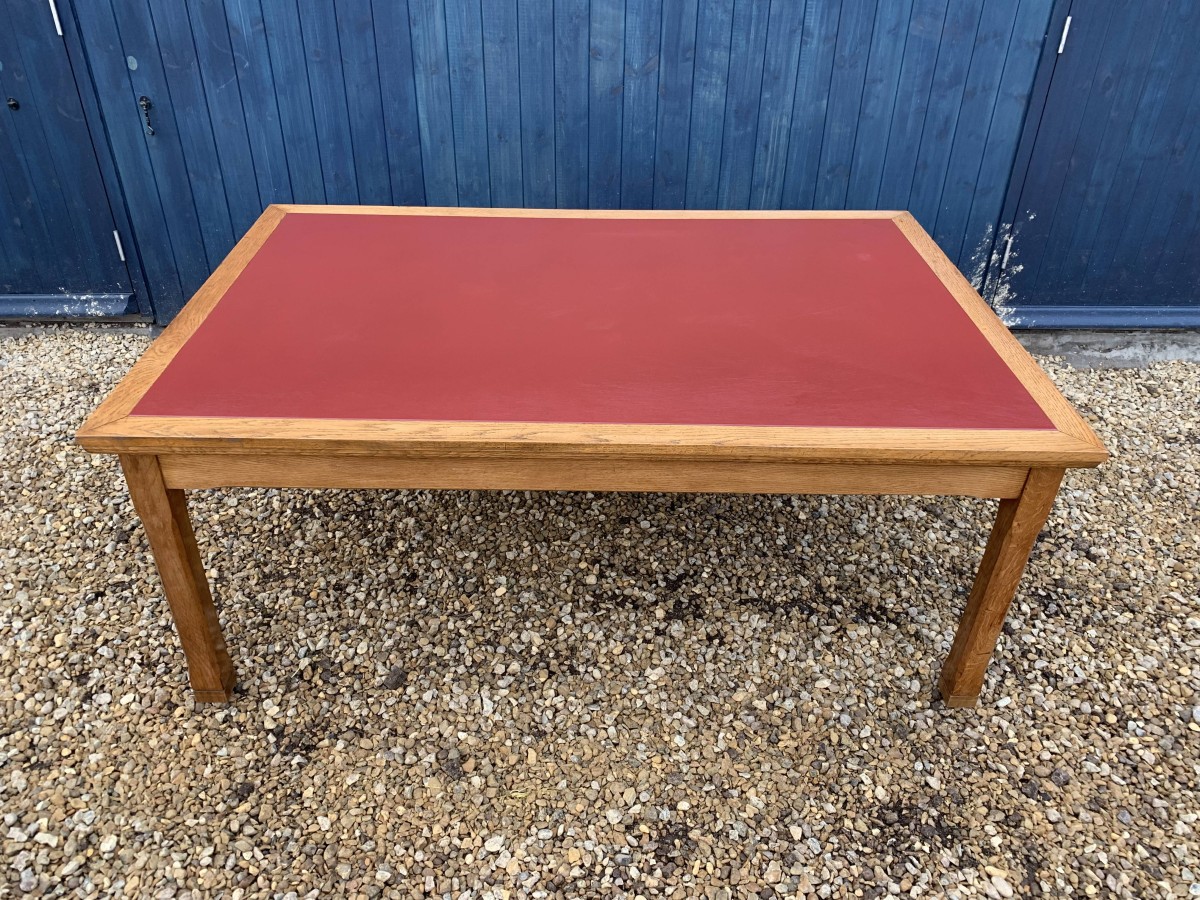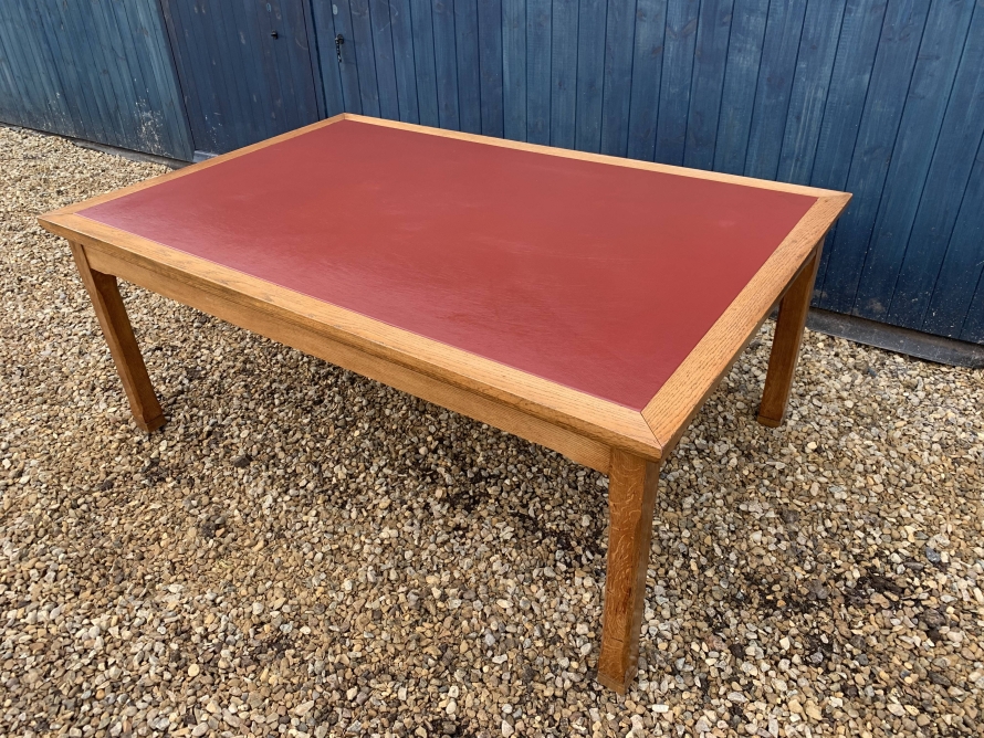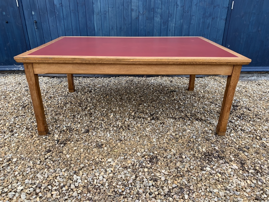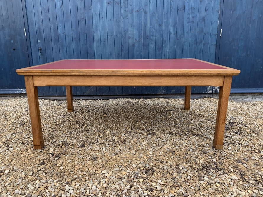 The table has a red leather top. The table sits on four oak legs, the legs having chamfered corners. The table dates circa 1925. The table would be ideal for a shop display.