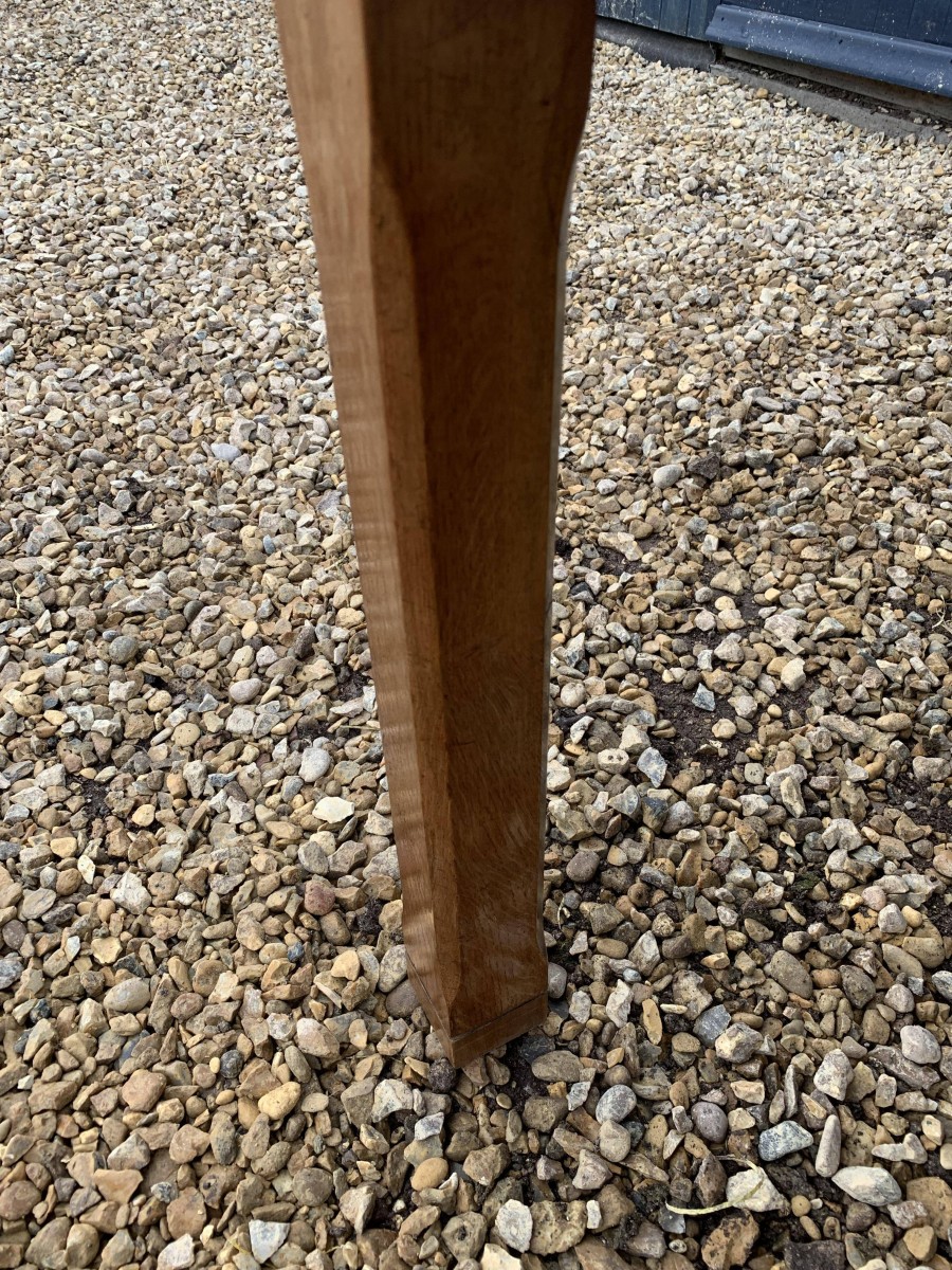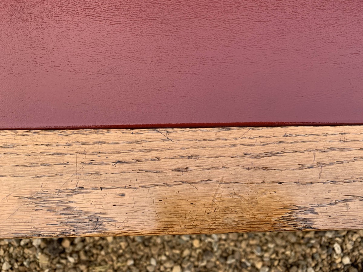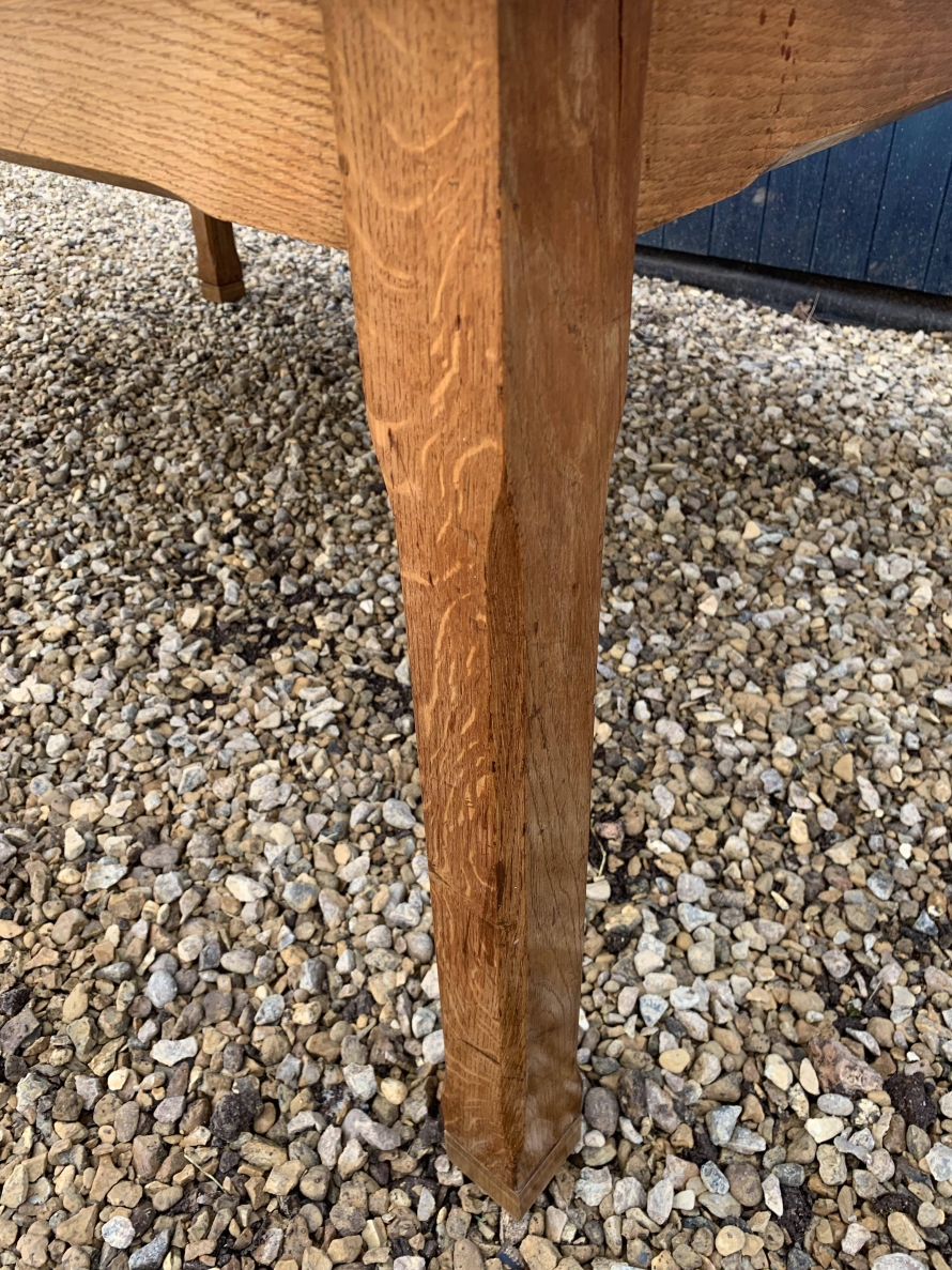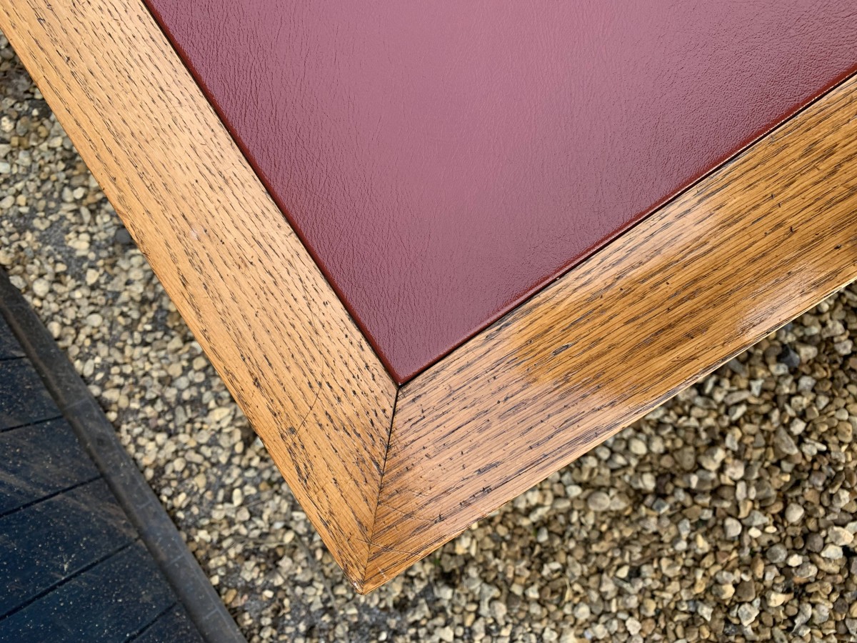 The table has a red leather top. The table sits on four oak legs, the legs having chamfered corners. The table dates circa 1925. The table would be ideal for a shop display.