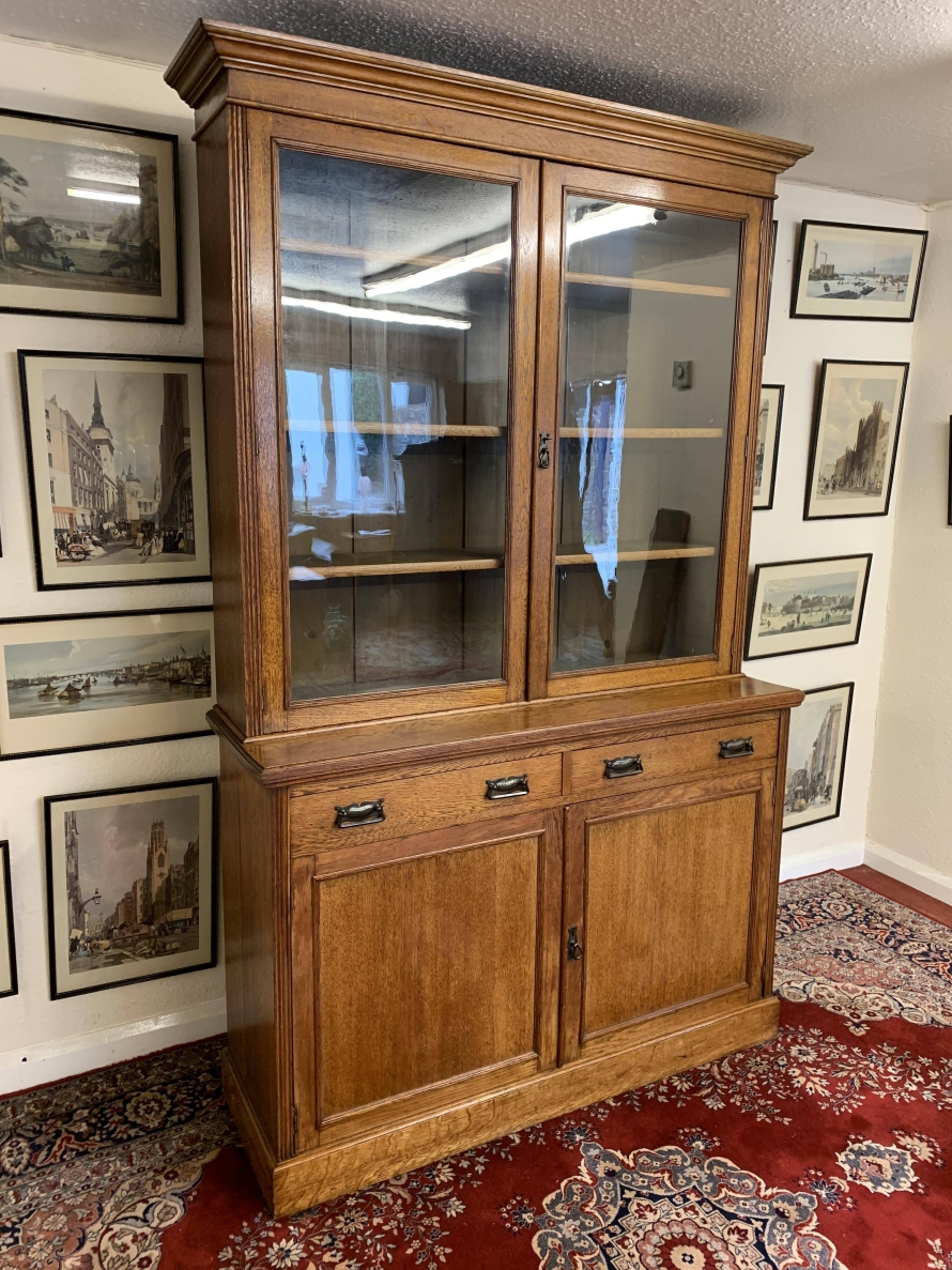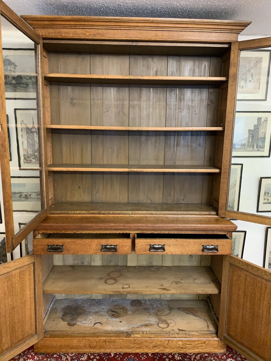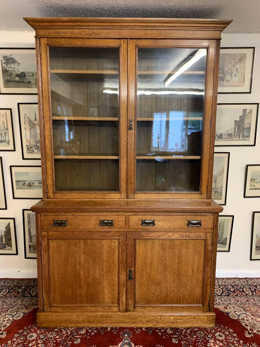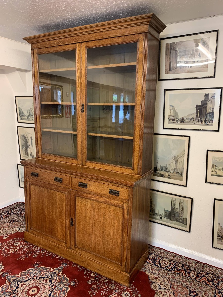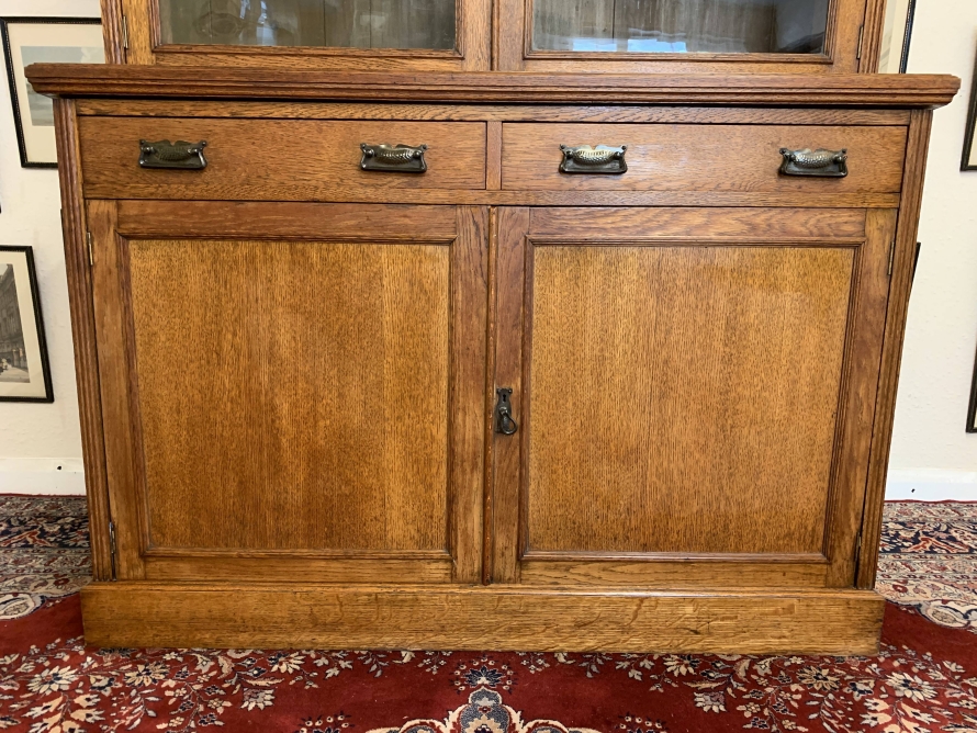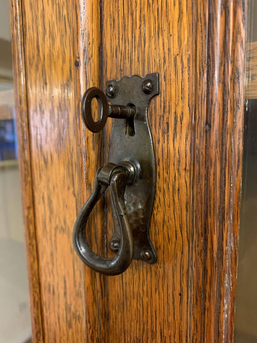 A beautiful antique book case made in the Liberty style. The stepped cornice sits above a pair of lockable glazed doors, the doors open to reveal three adjustable and removable oak shelves. The base has a pair of drawers which sit above a pair of recessed panelled lockable doors. The handles of the doors and drawers are hand beaten metal. The cupboard doors open to reveal a removable shelf. This great bookcase sits on a plinth base. Please note the platina of the oak is striking.