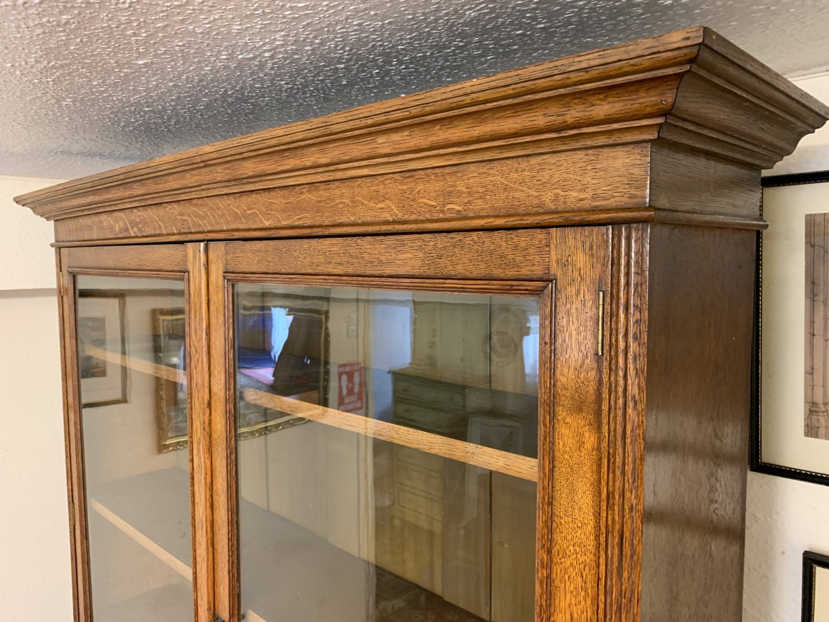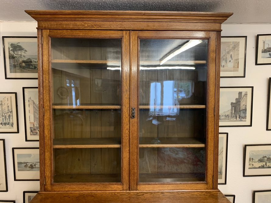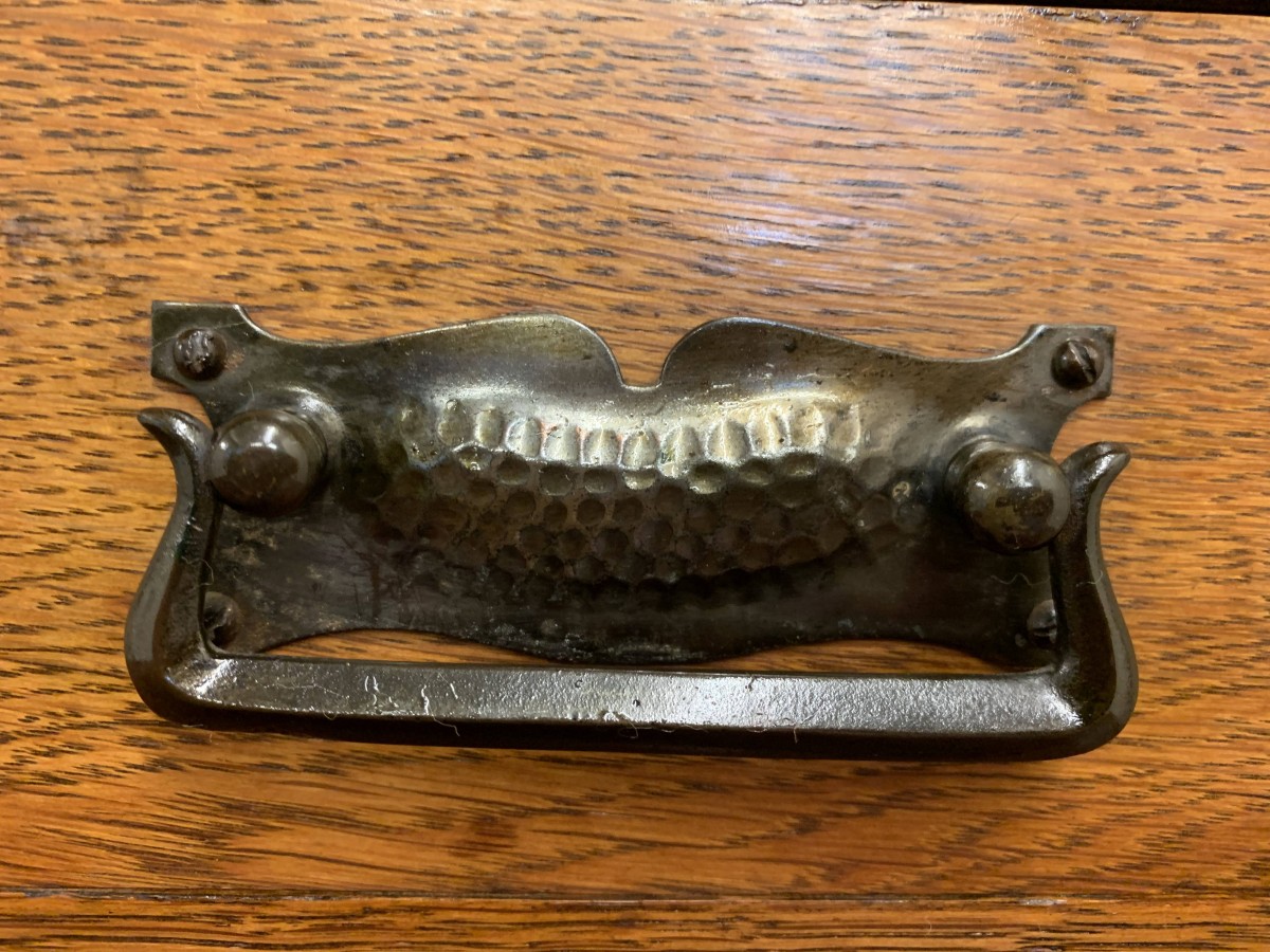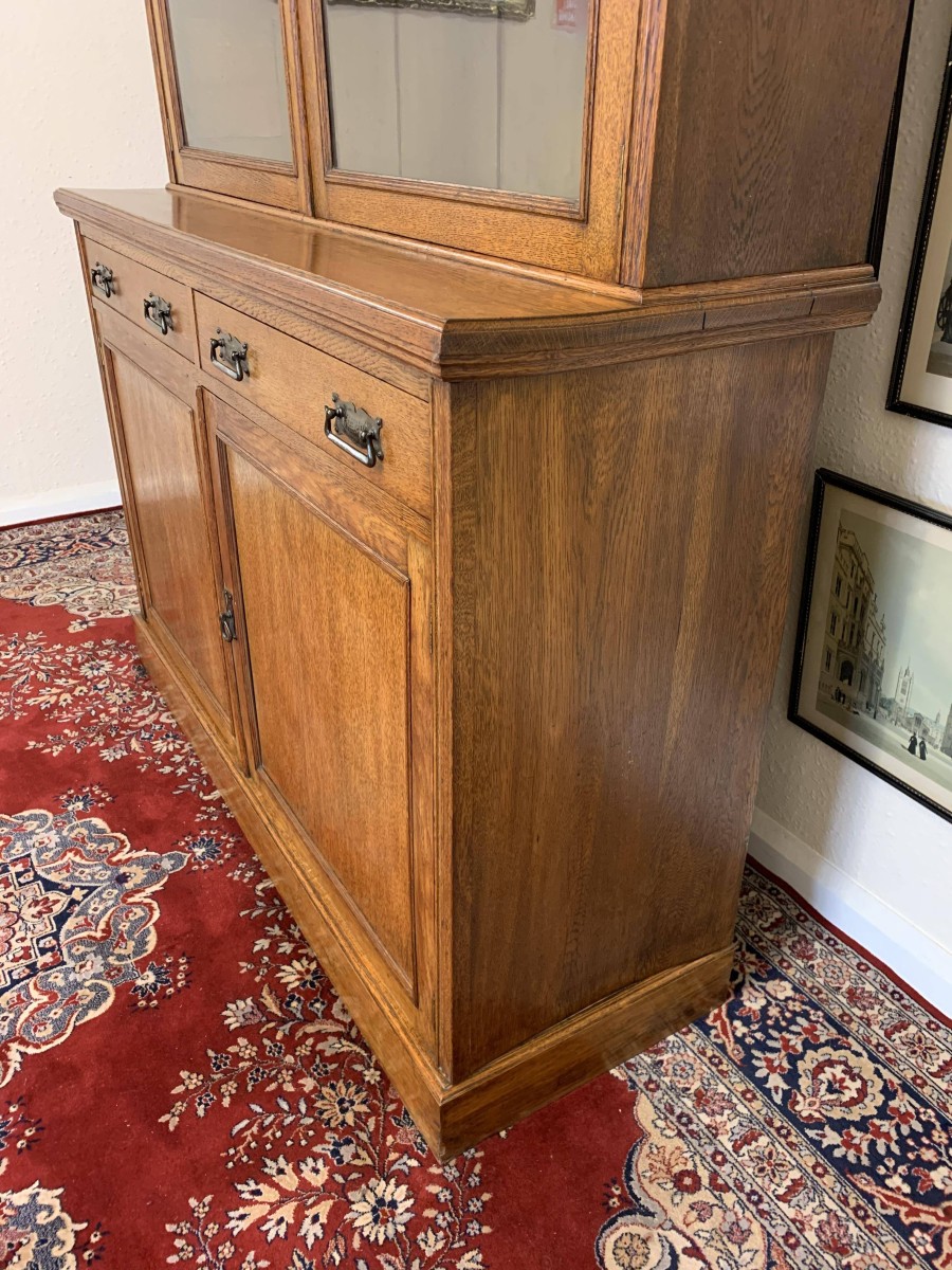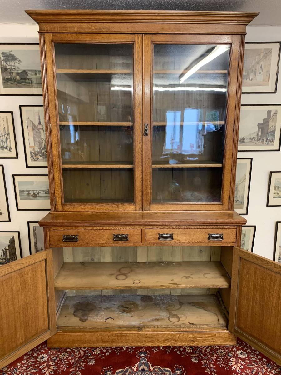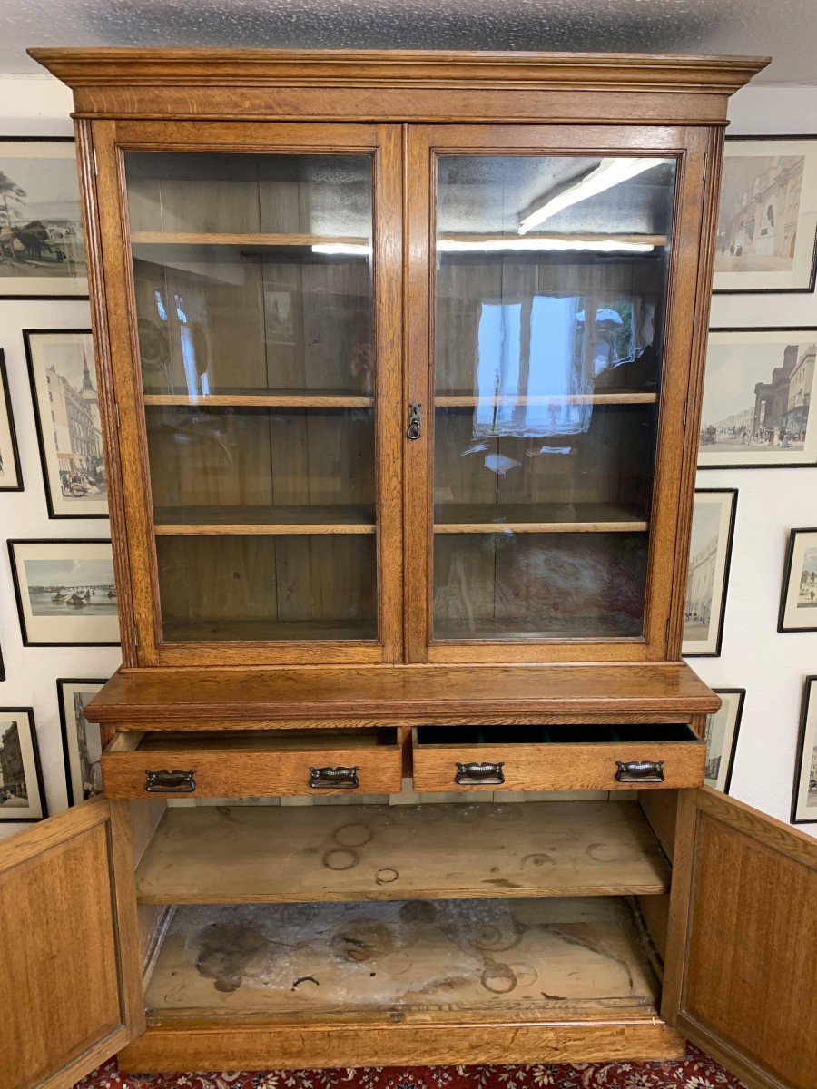 A beautiful antique book case made in the Liberty style. The stepped cornice sits above a pair of lockable glazed doors, the doors open to reveal three adjustable and removable oak shelves. The base has a pair of drawers which sit above a pair of recessed panelled lockable doors. The handles of the doors and drawers are hand beaten metal. The cupboard doors open to reveal a removable shelf. This great bookcase sits on a plinth base. Please note the platina of the oak is striking.