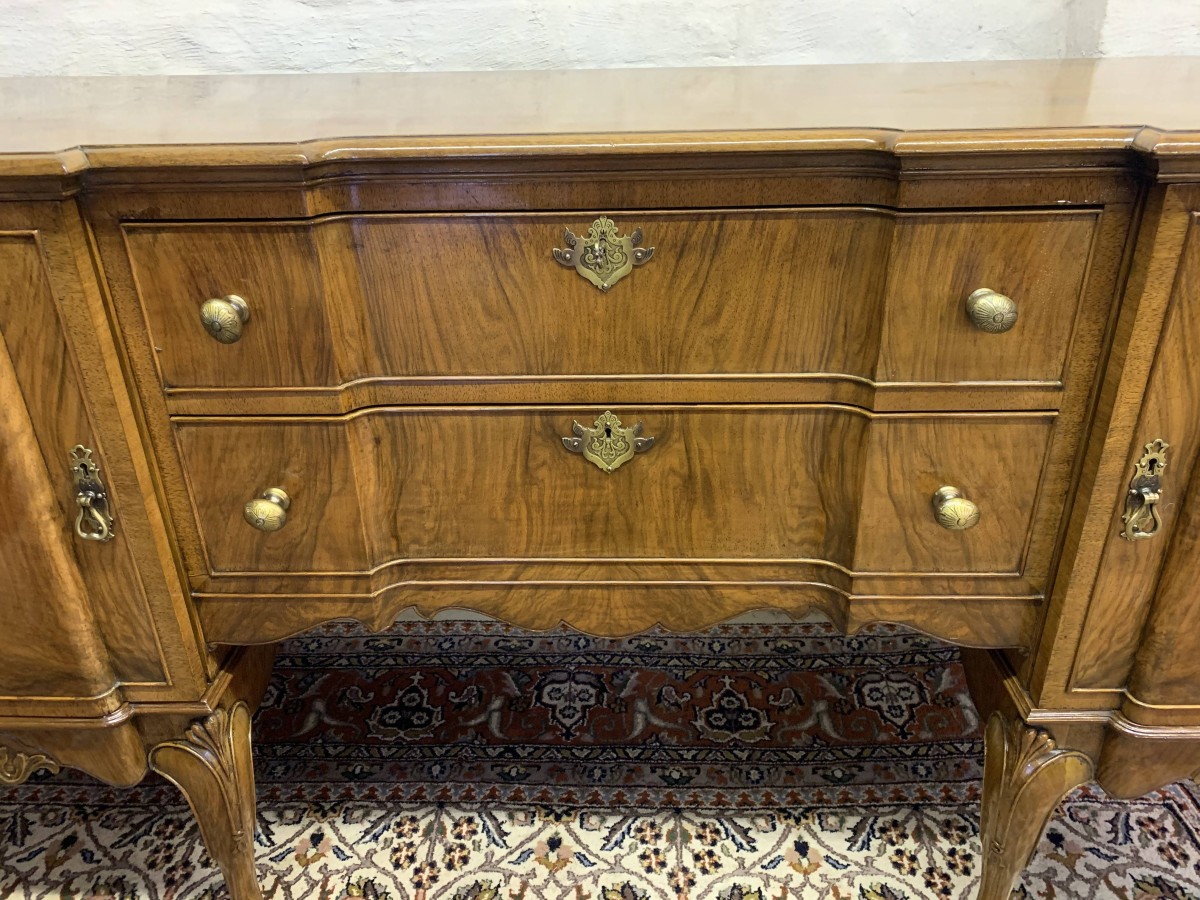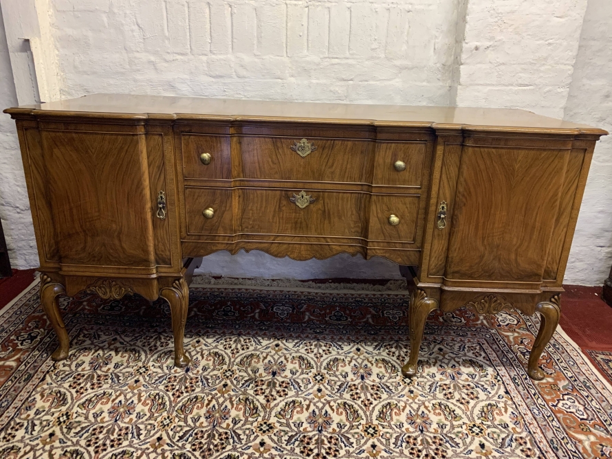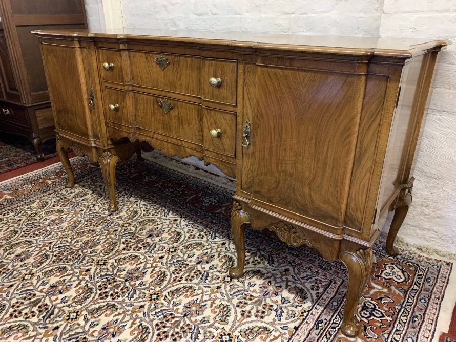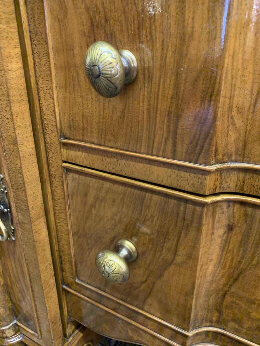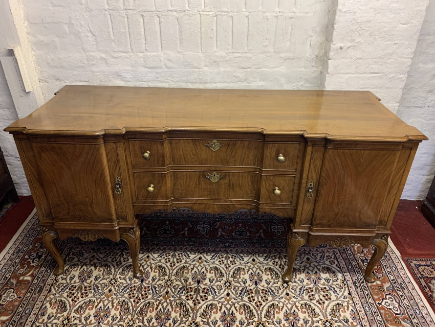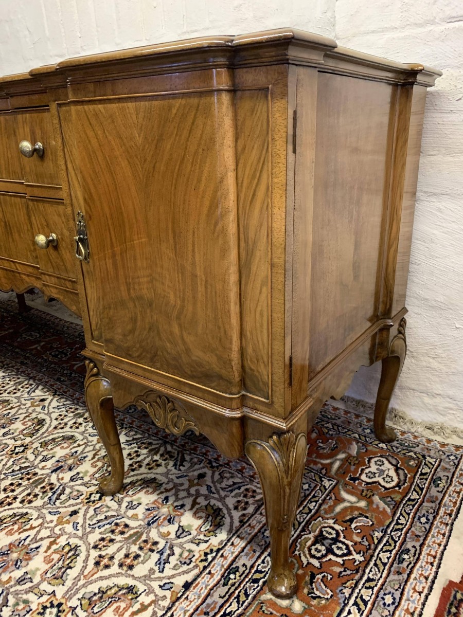 The shaped top has cross banded edging, the two central lockable drawers each have a pair of ornate brass handles and decorative brass escutcheon. The doors are flanked by a pair of shaped cupboard doors each door opens to reveal a removable shelf. Shaped sides, shaped skirt with ornate carving, this fabulous item of English furniture stands proud on six carved shaped cabriole legs.
