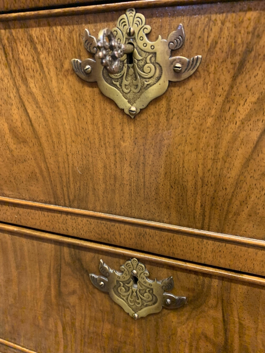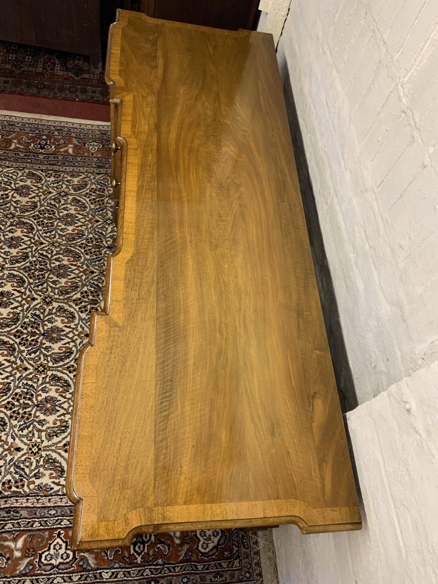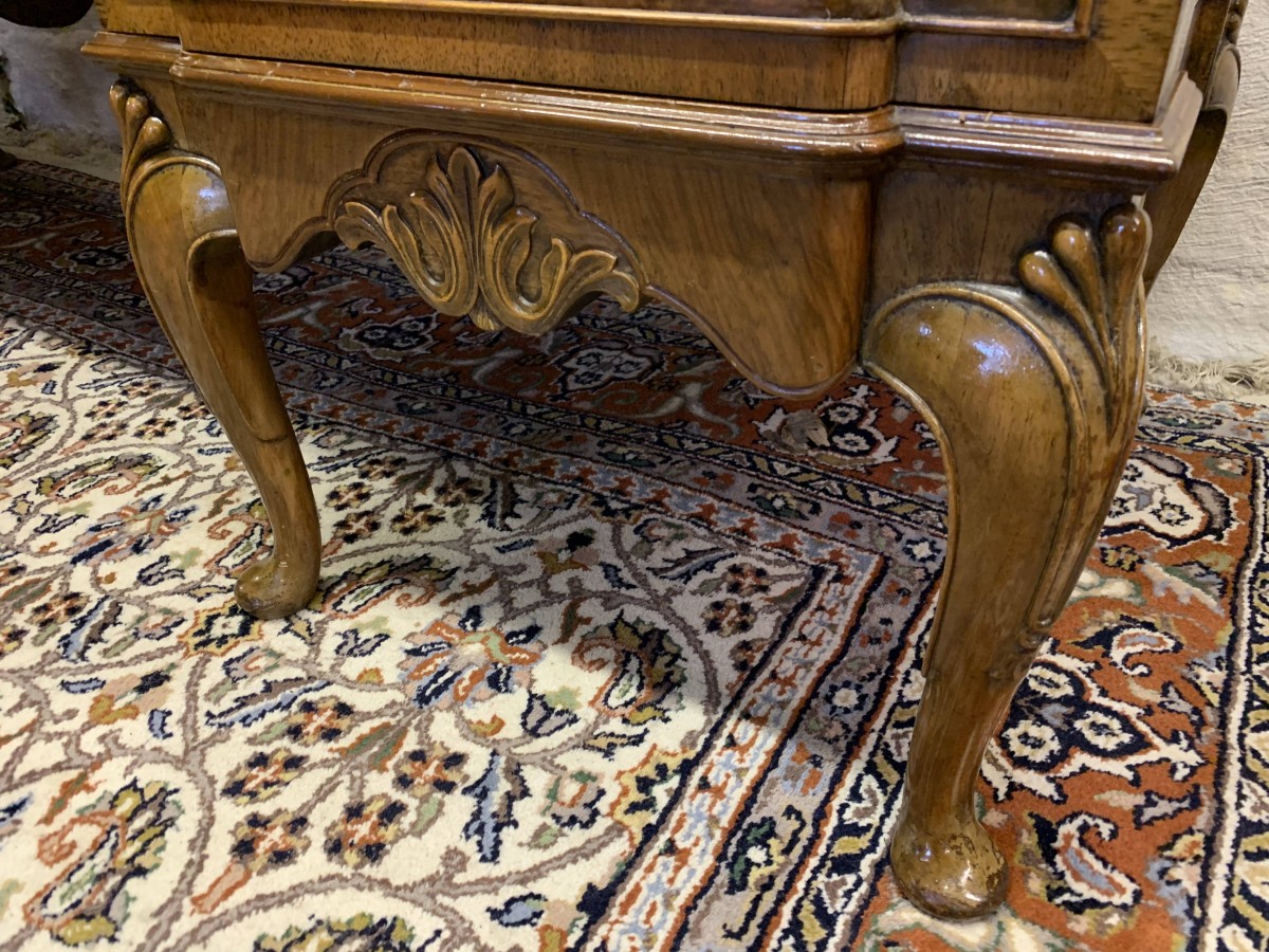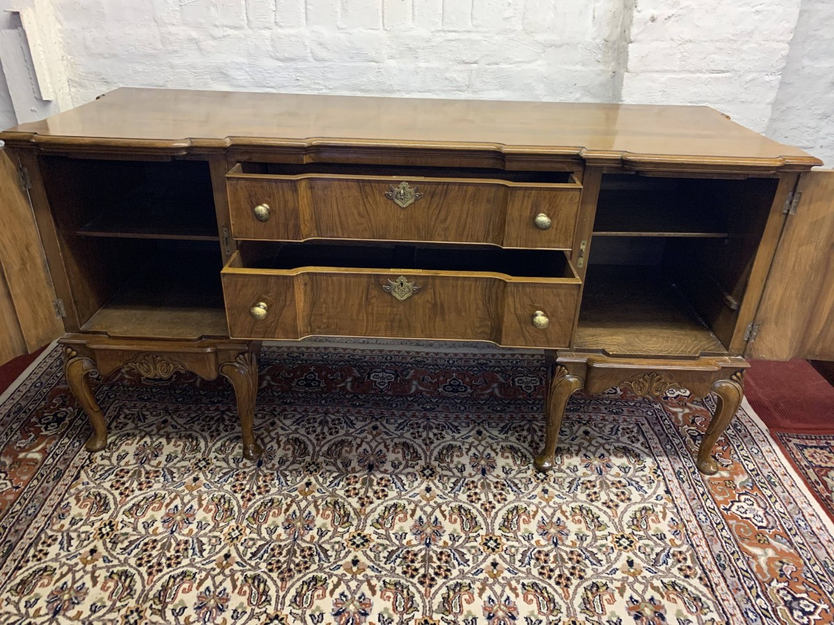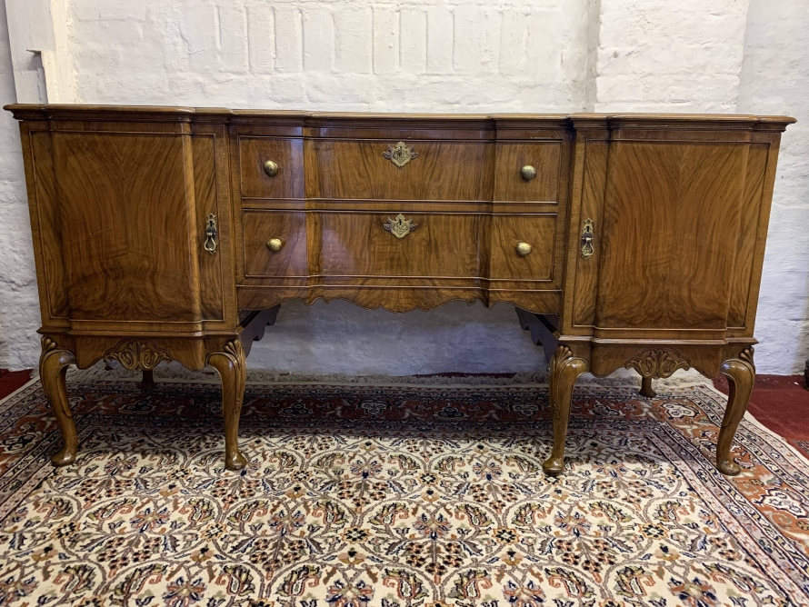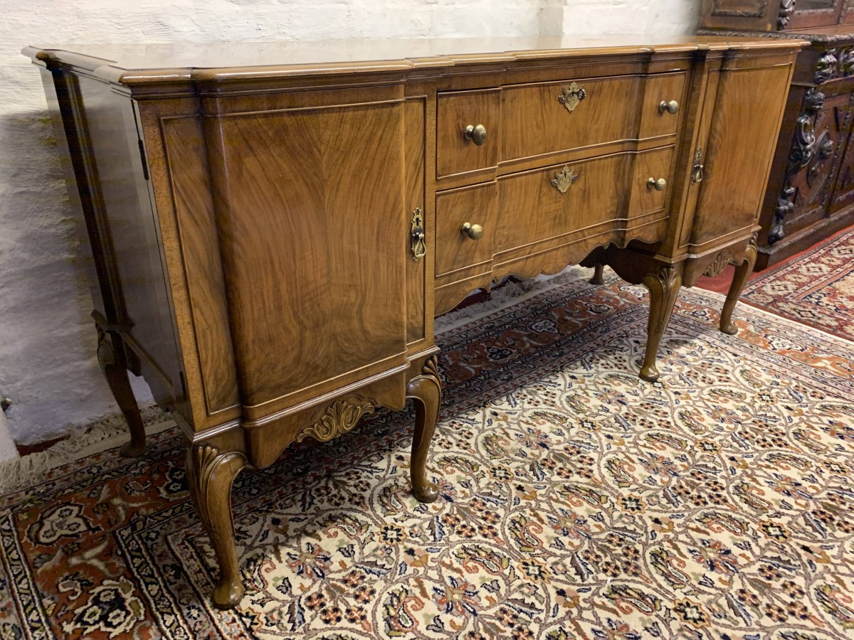 The shaped top has cross banded edging, the two central lockable drawers each have a pair of ornate brass handles and decorative brass escutcheon. The doors are flanked by a pair of shaped cupboard doors each door opens to reveal a removable shelf. Shaped sides, shaped skirt with ornate carving, this fabulous item of English furniture stands proud on six carved shaped cabriole legs.