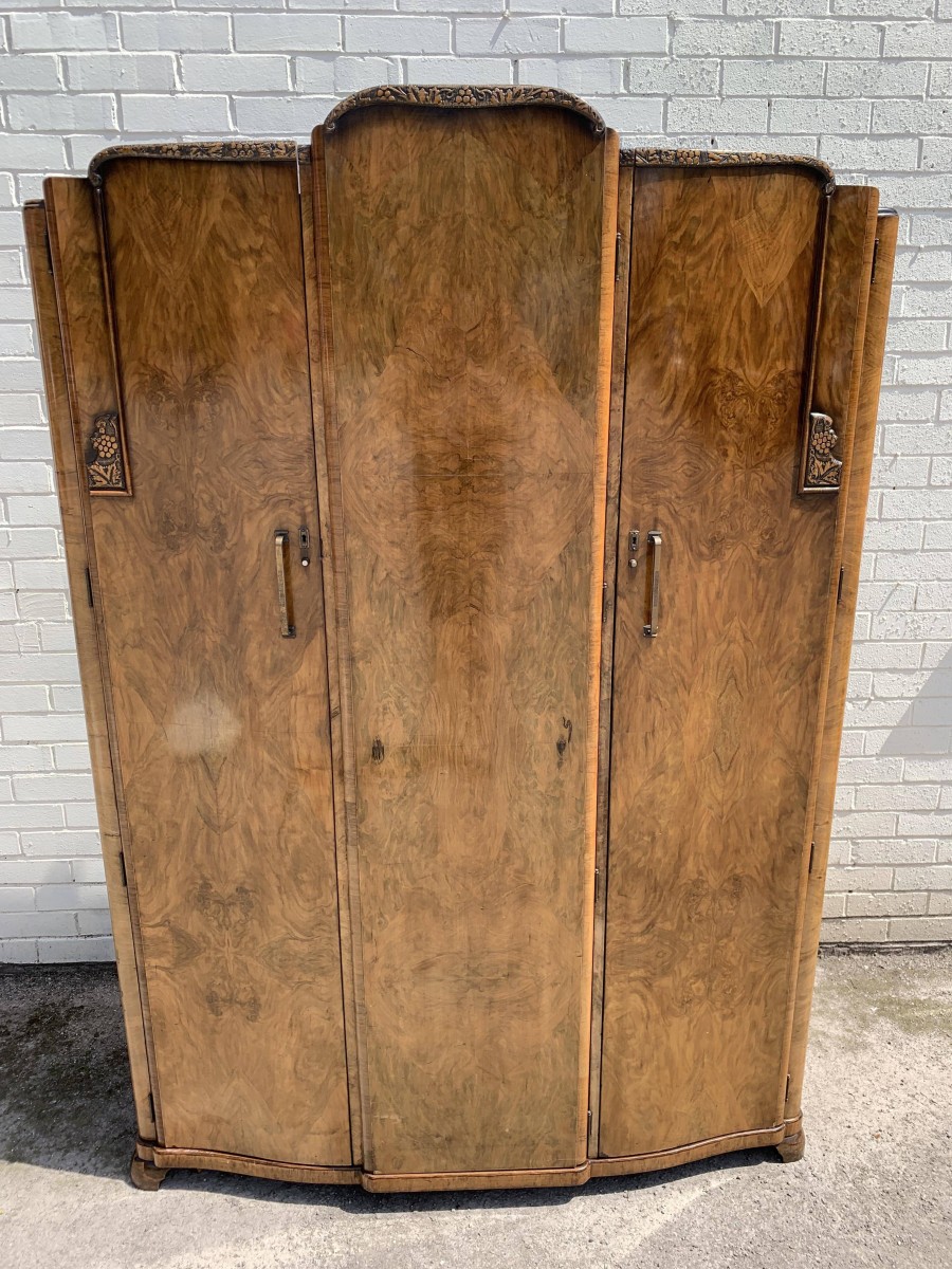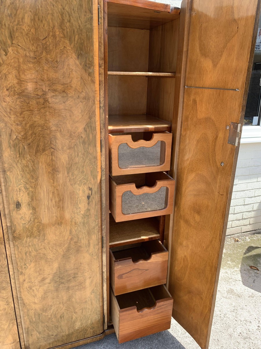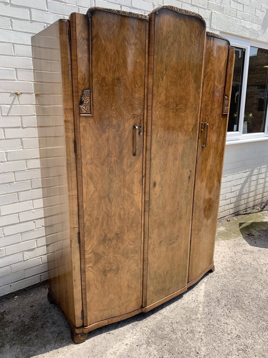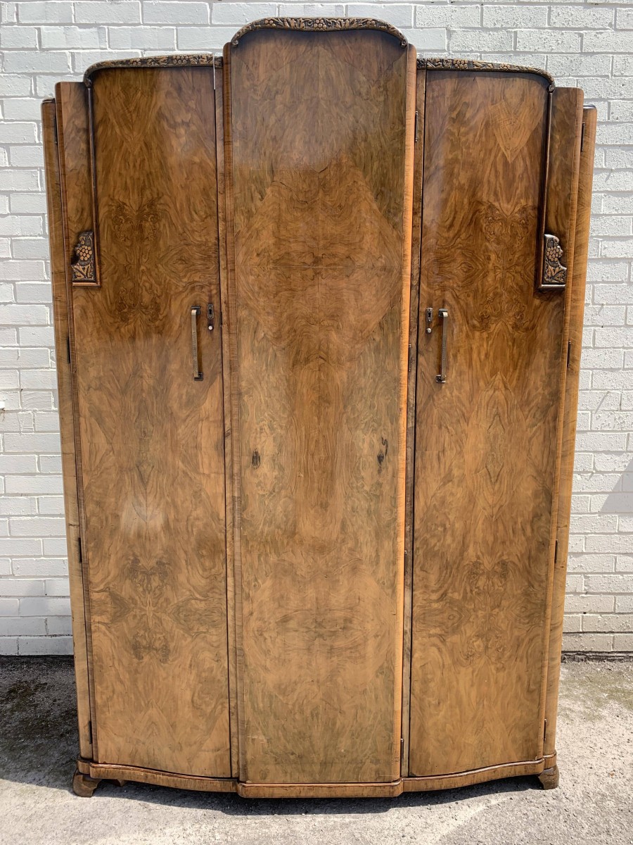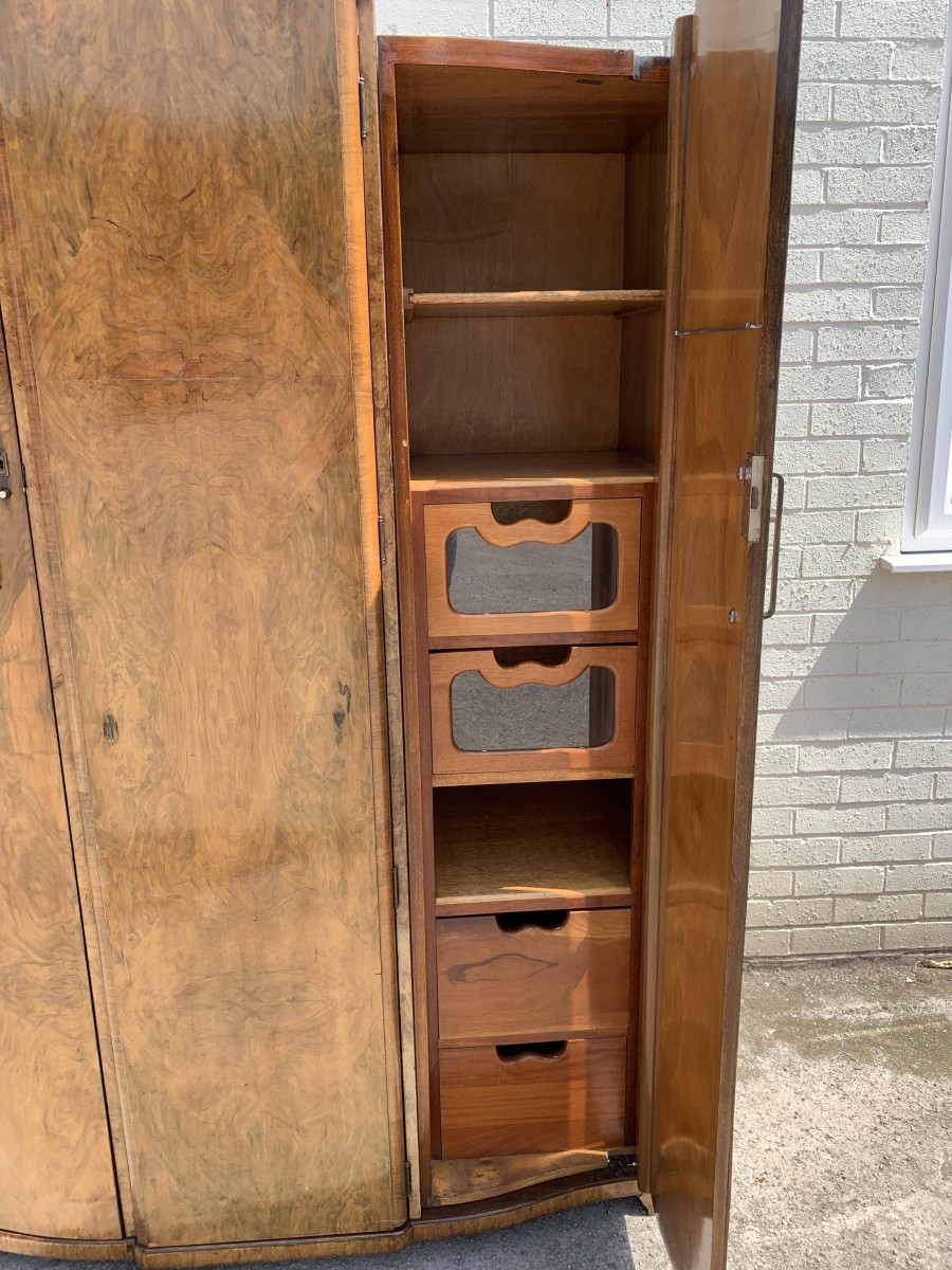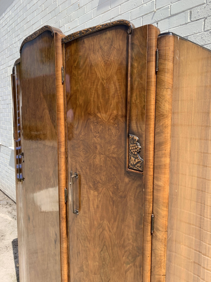 Fantastic stylish Art Deco wardrobe made in striking burr walnut. The shaped top has carved decoration, below are three doors the left and central door open to reveal retractable hanging rail and a shelf with a hanging rail below. The right-hand door opens to reveal two sliding drawers with glass front, two sliding drawers with wooden fronts and three good sized storage shelves. The wardrobe sits on a plinth base.