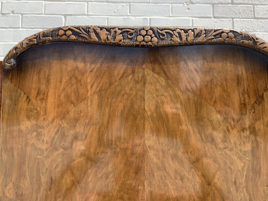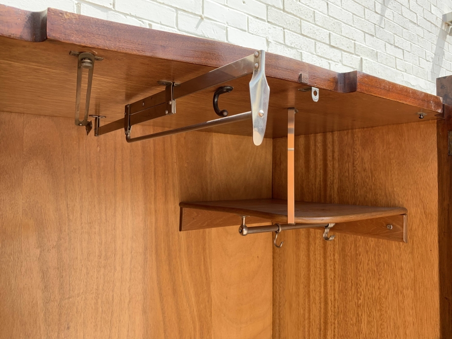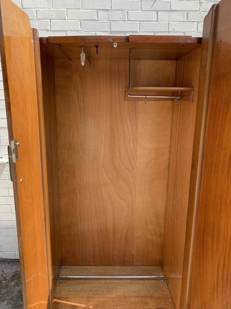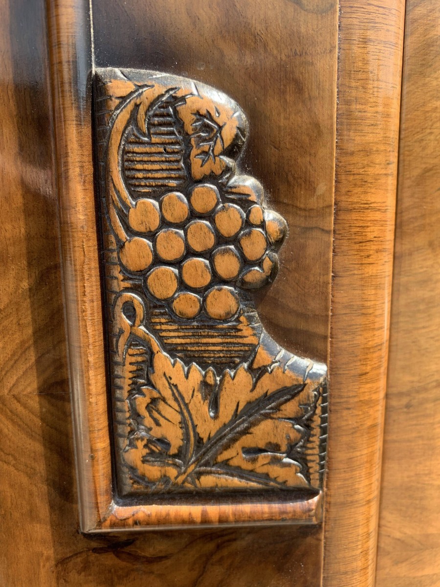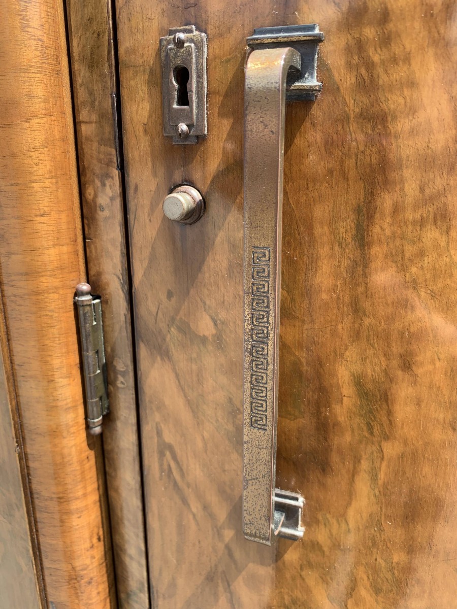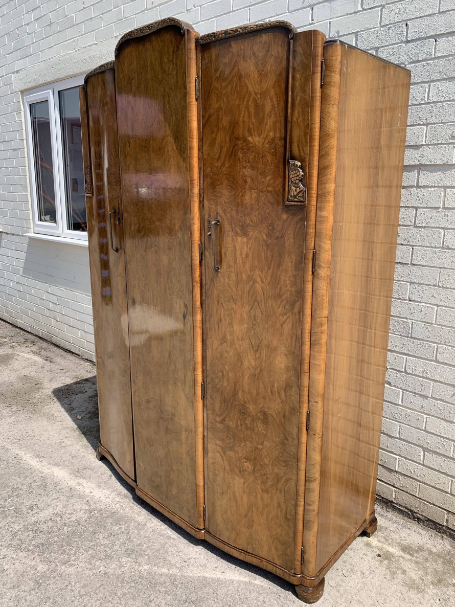 Fantastic stylish Art Deco wardrobe made in striking burr walnut. The shaped top has carved decoration, below are three doors the left and central door open to reveal retractable hanging rail and a shelf with a hanging rail below. The right-hand door opens to reveal two sliding drawers with glass front, two sliding drawers with wooden fronts and three good sized storage shelves. The wardrobe sits on a plinth base.