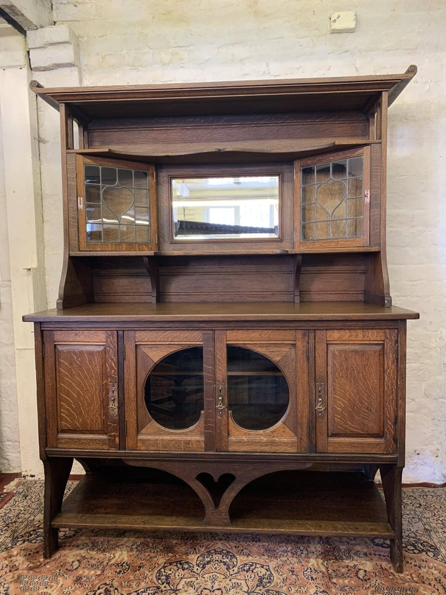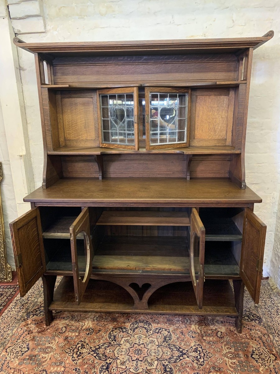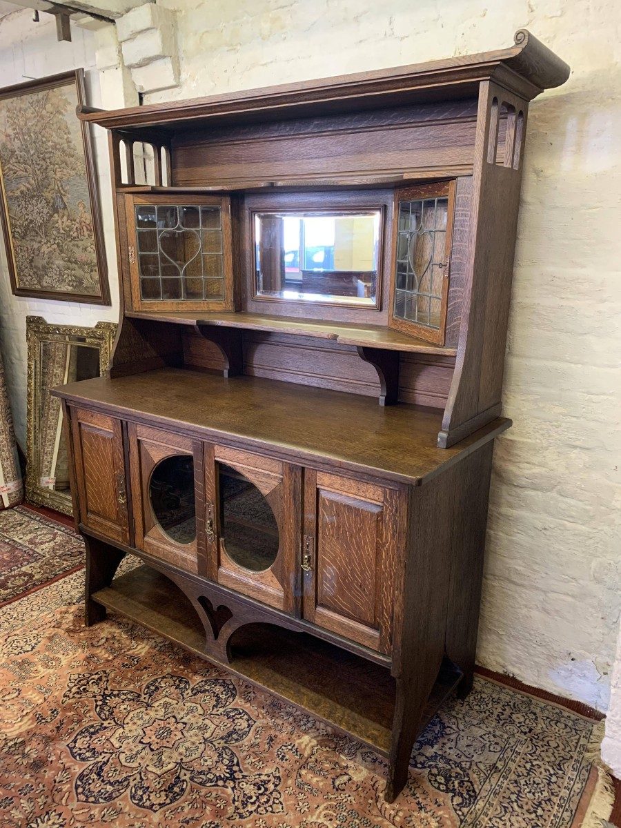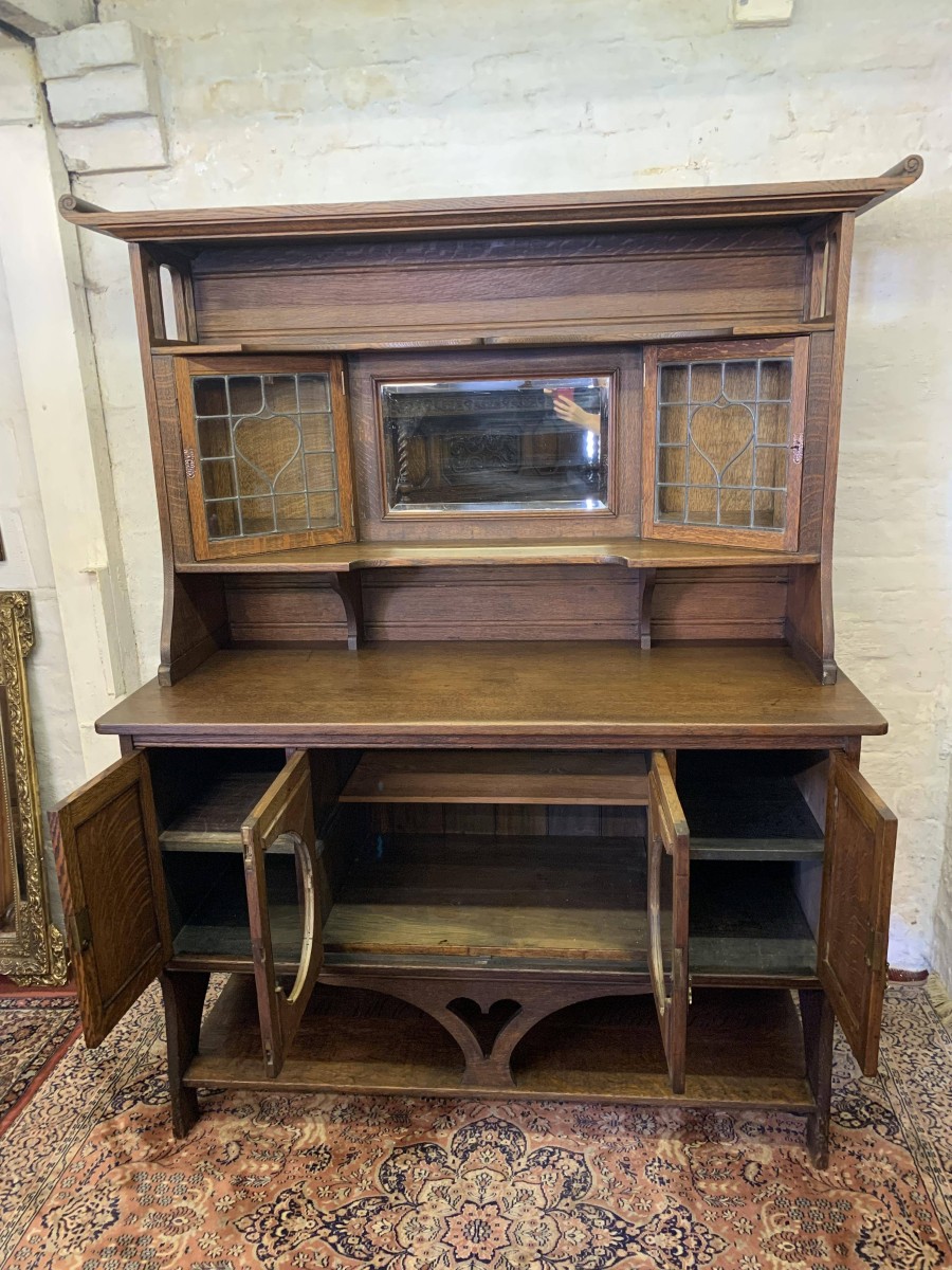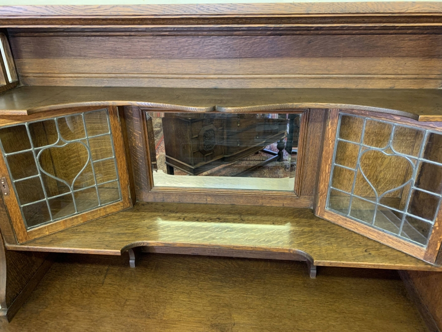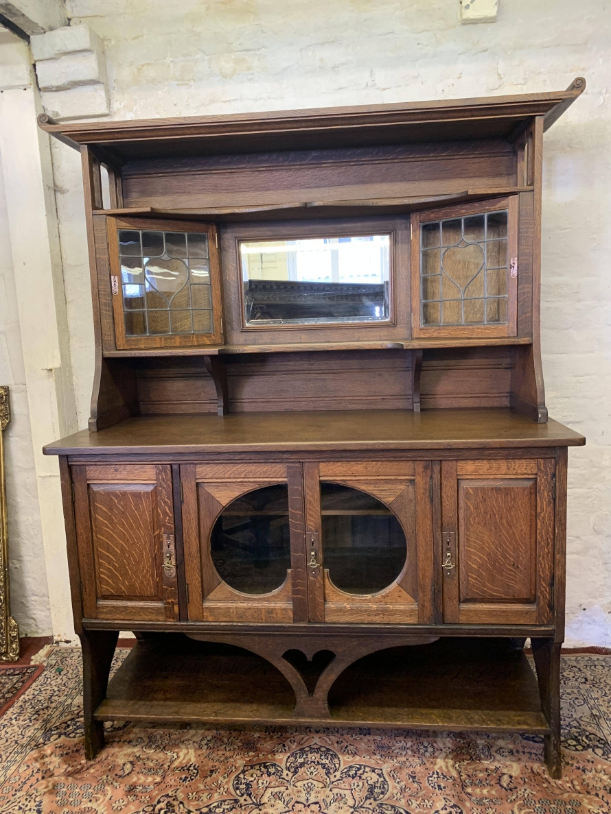 This fabulous dresser dates circa 1910. The top has scroll ends. A shaped shelf sits above a central bevel edged mirror which is flanked by a pair of leaded glass doors,the doors having copper escutcheons. Below are a central pair of shaped glazed doors, the doors open to reveal a removable shelf. The central glazed doors are flanked by a pair of recessed panelled cupboard doors, each door opens to reveal a removable shelf. The doors have copper escutcheons with brass ornate handles, a shelf below with central decoration to the front and standing on four traditional legs.