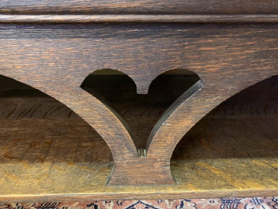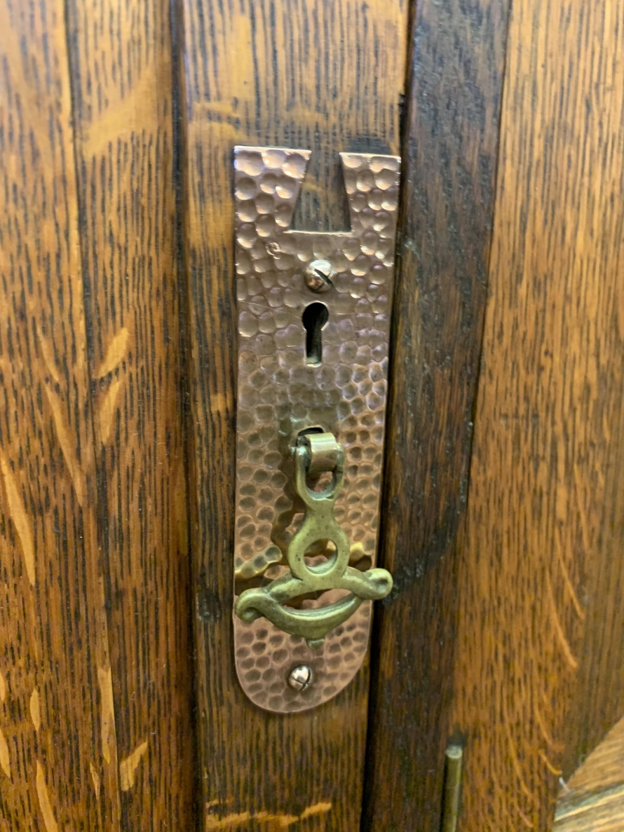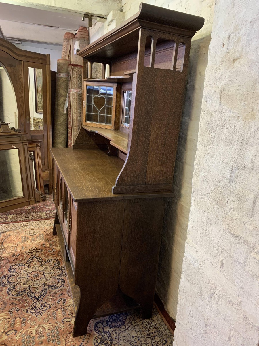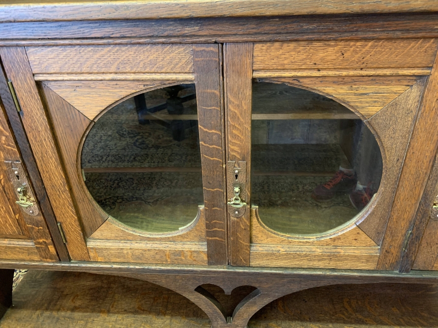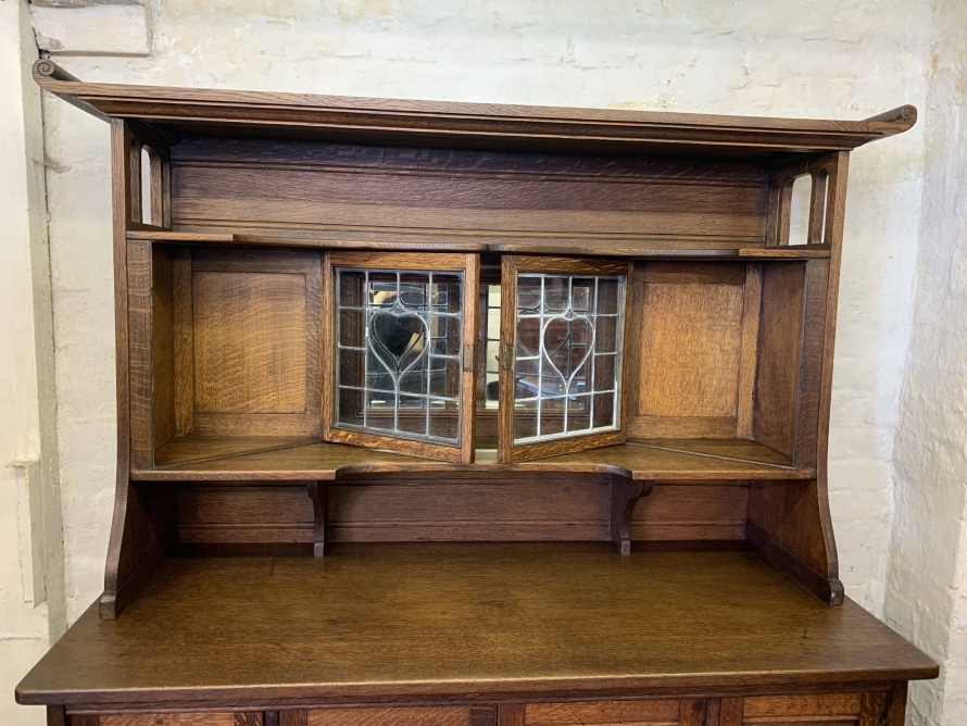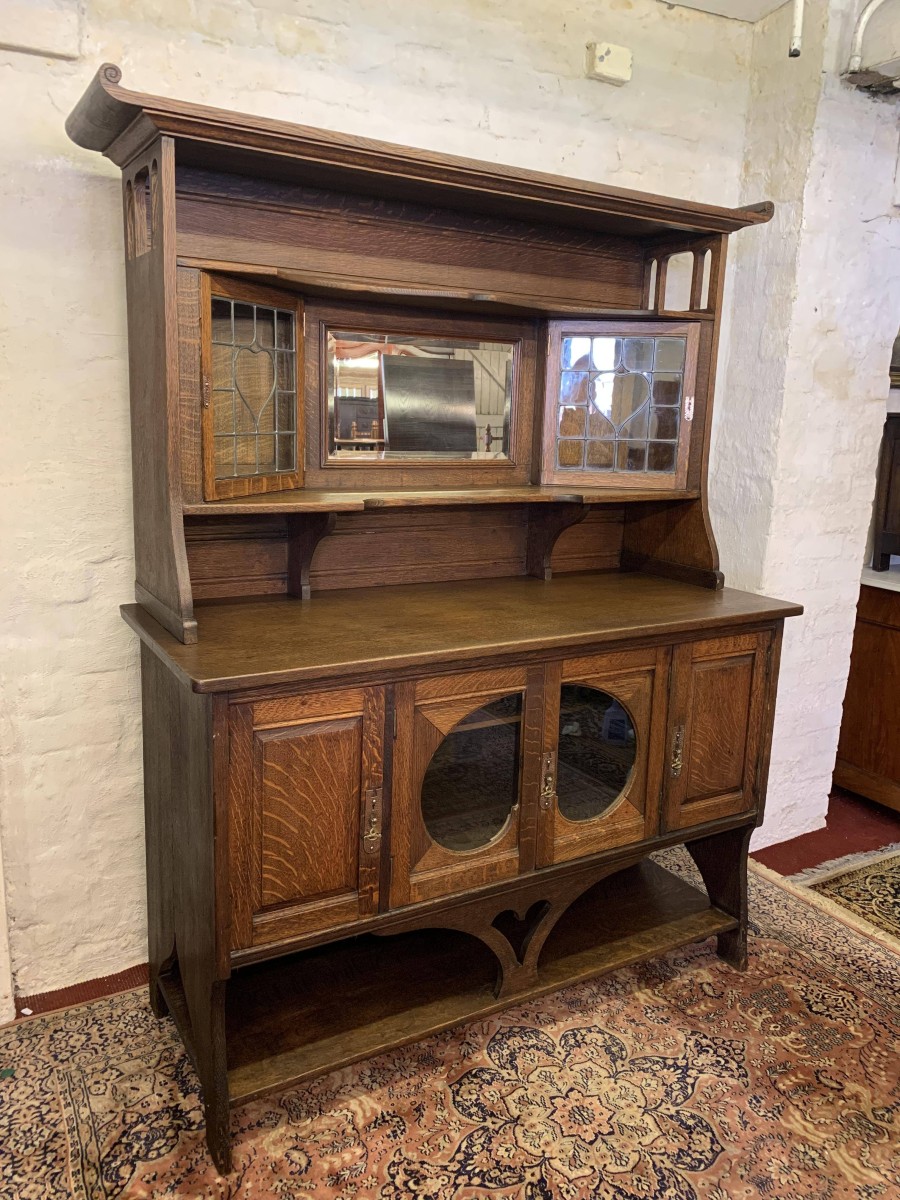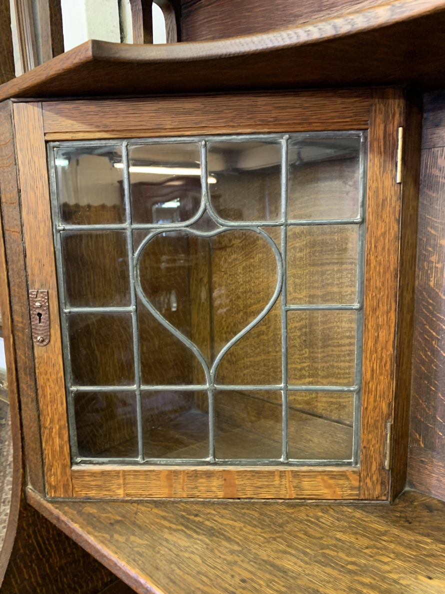 This fabulous dresser dates circa 1910. The top has scroll ends. A shaped shelf sits above a central bevel edged mirror which is flanked by a pair of leaded glass doors,the doors having copper escutcheons. Below are a central pair of shaped glazed doors, the doors open to reveal a removable shelf. The central glazed doors are flanked by a pair of recessed panelled cupboard doors, each door opens to reveal a removable shelf. The doors have copper escutcheons with brass ornate handles, a shelf below with central decoration to the front and standing on four traditional legs.