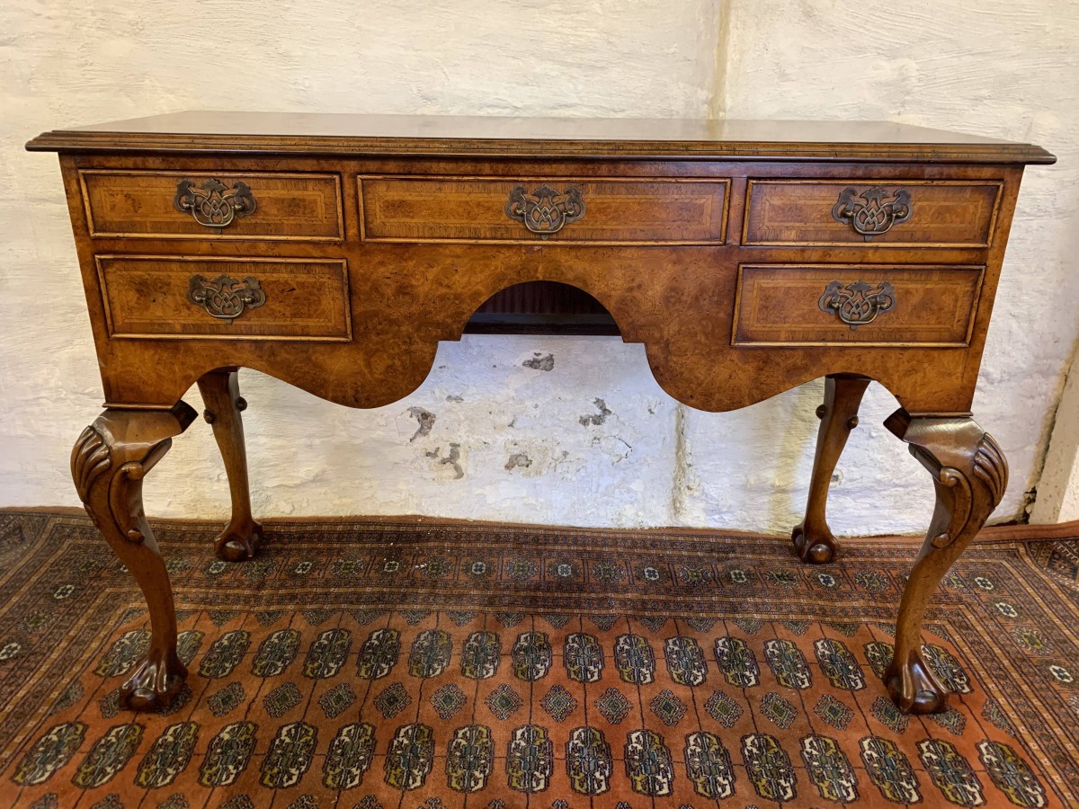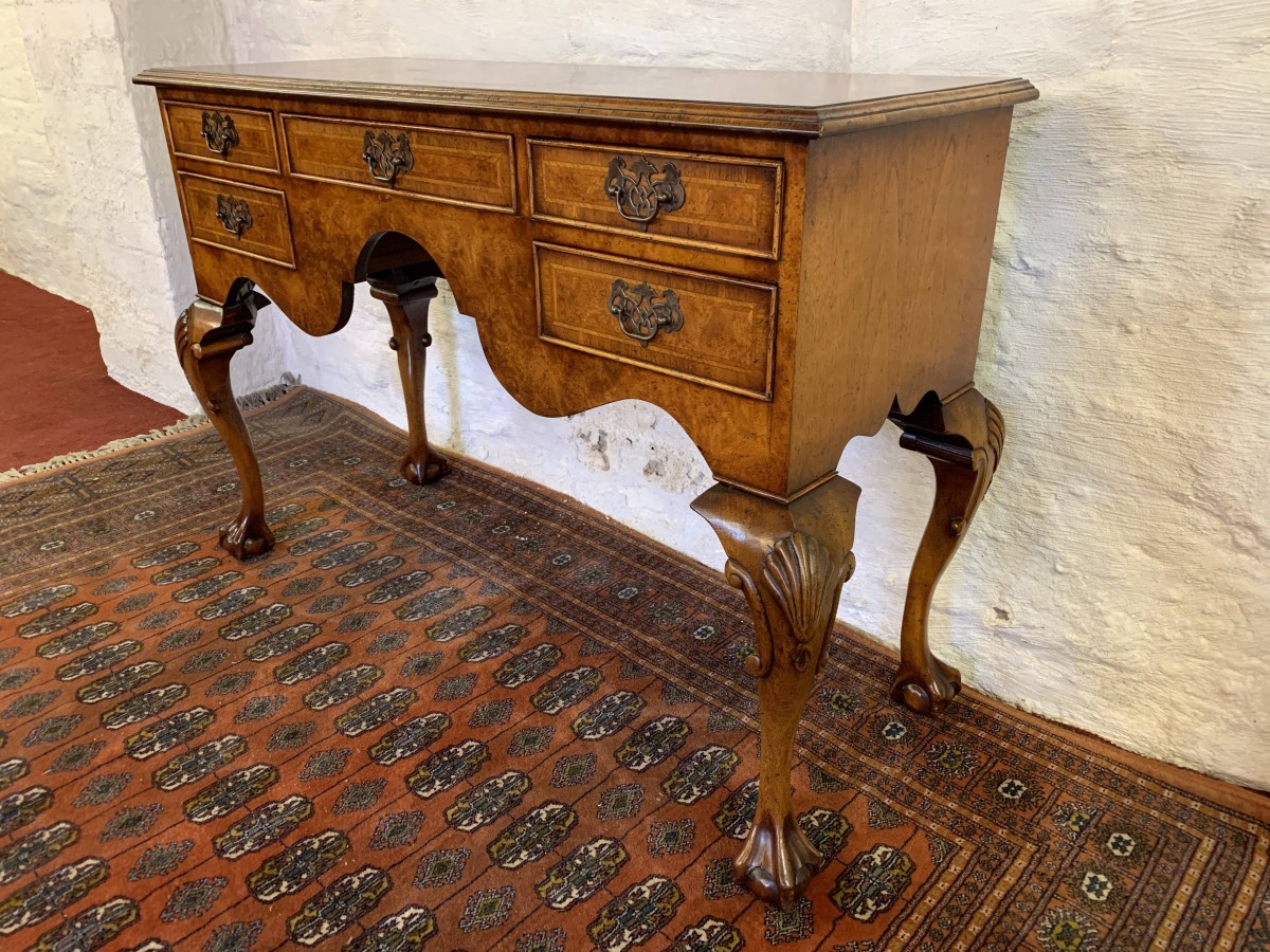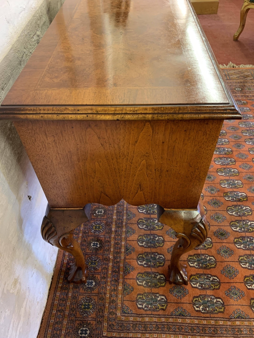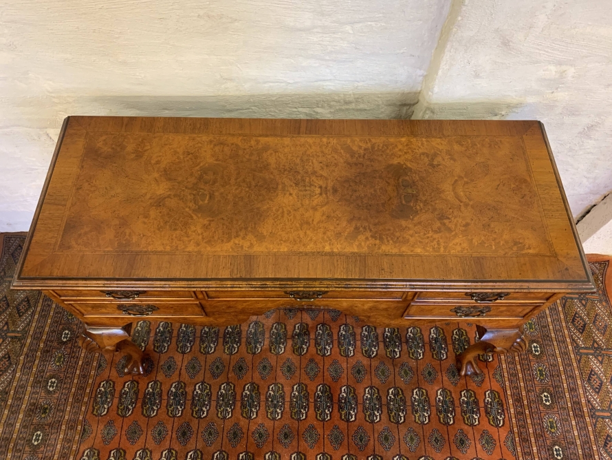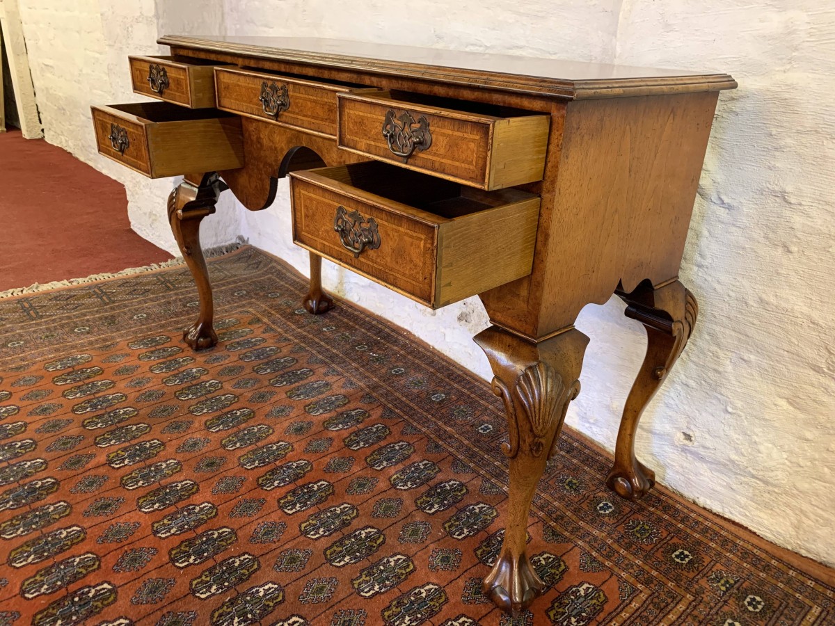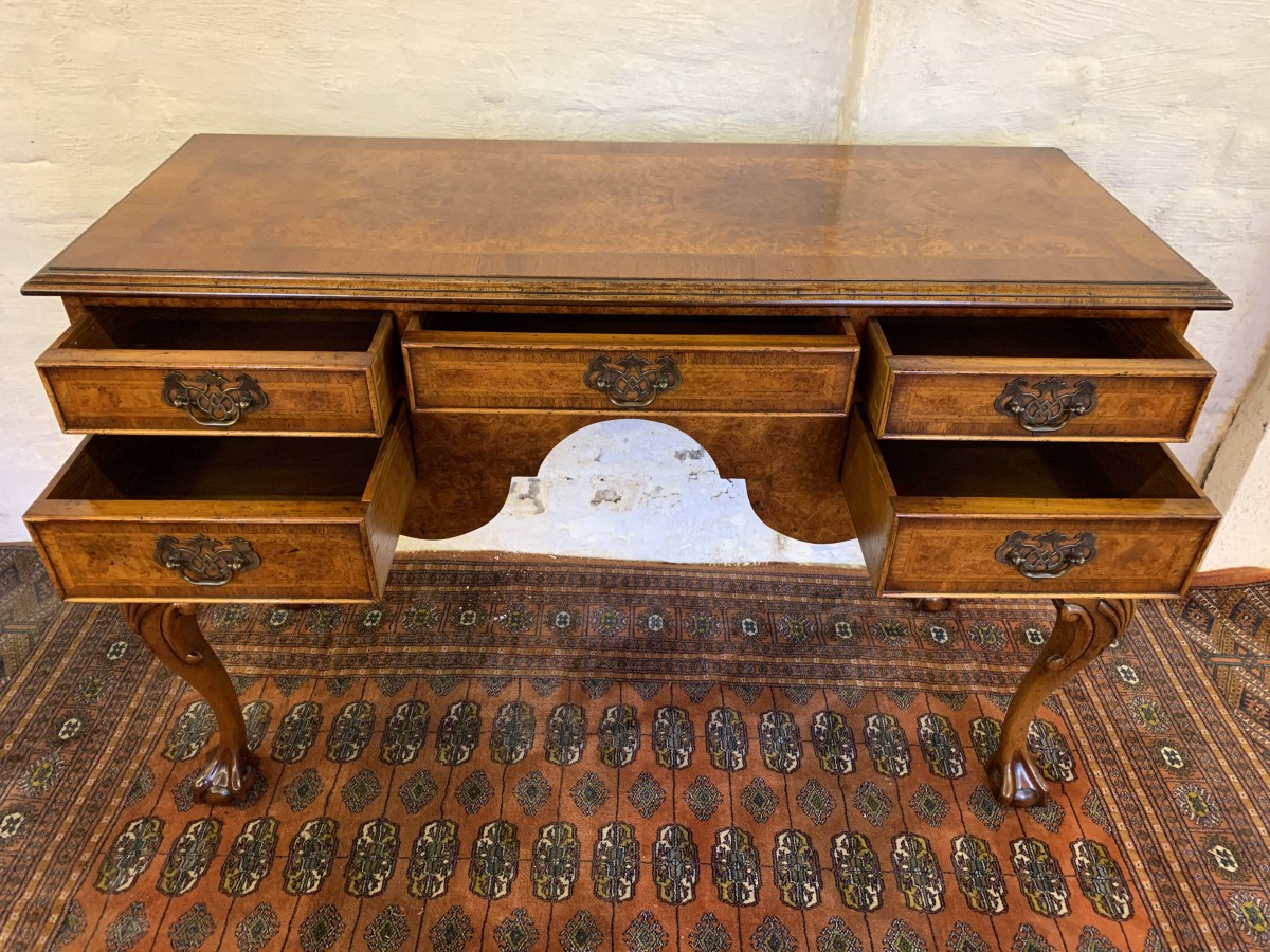 The cross banded oversailing top sits above a central knee hole drawer, the drawer flanked by a pair of small drawers, each drawer having brass handle and inlaid decoration. This super desk stands on four carved cabriole shaped legs with ball and claw feet. Please note this item is in excellent condition.