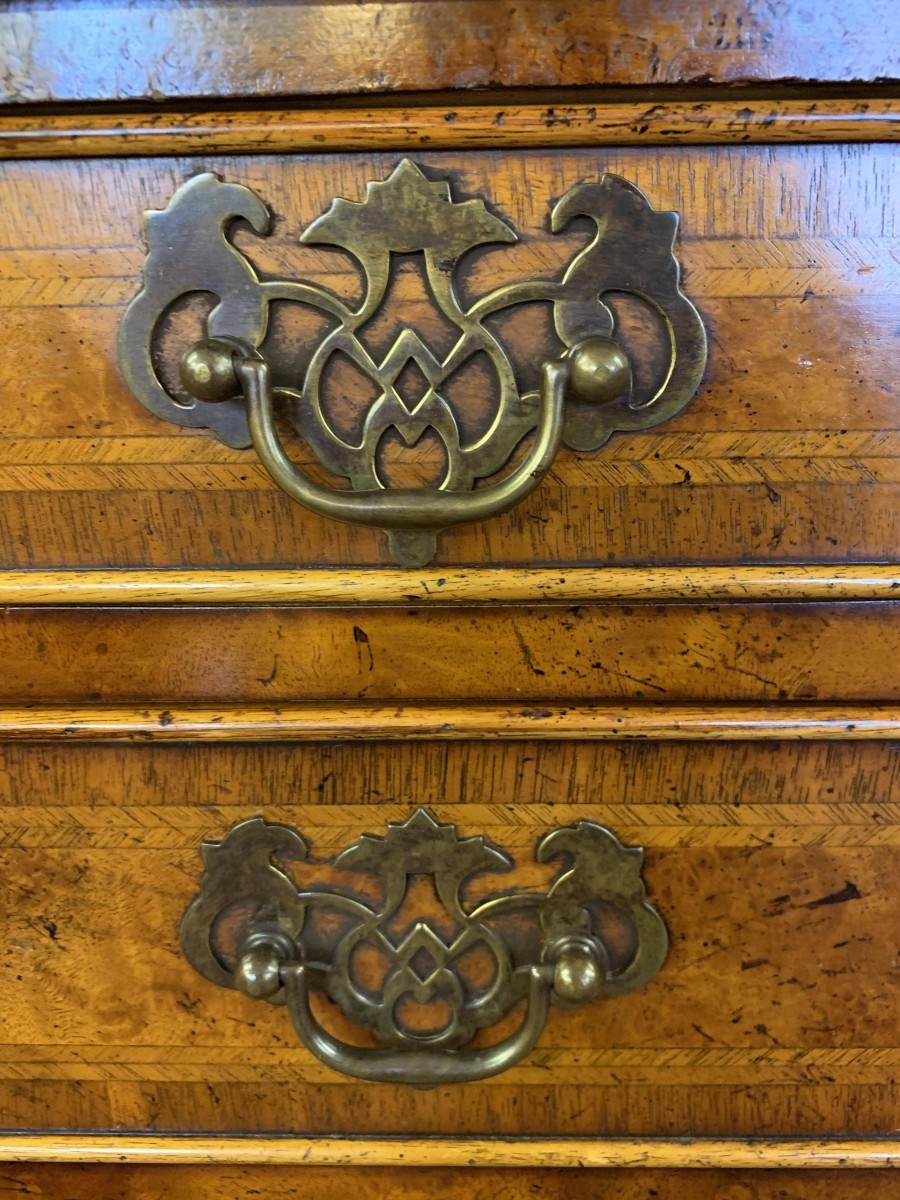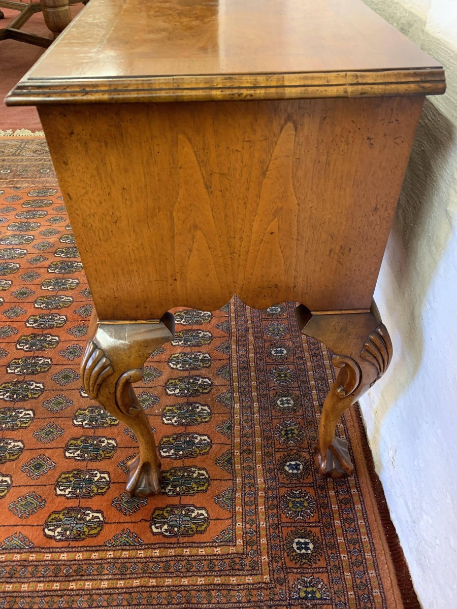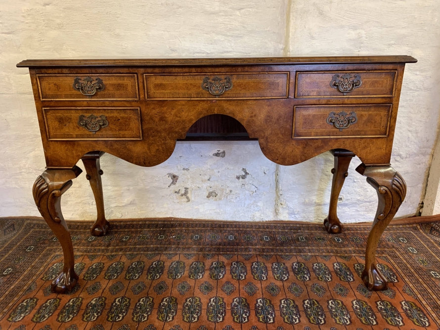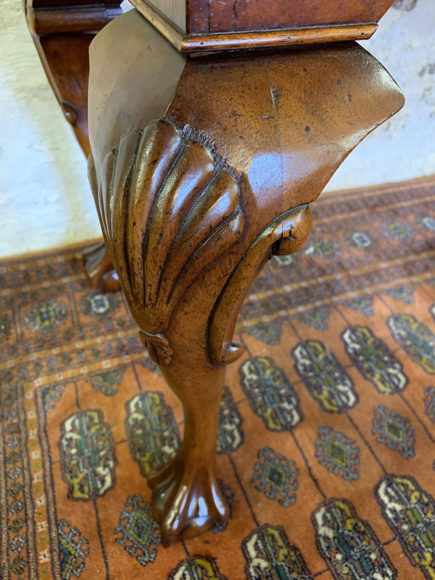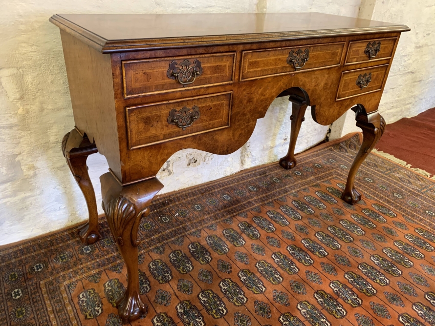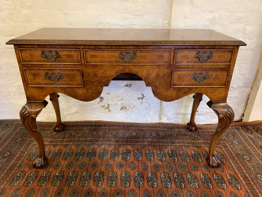 The cross banded oversailing top sits above a central knee hole drawer, the drawer flanked by a pair of small drawers, each drawer having brass handle and inlaid decoration. This super desk stands on four carved cabriole shaped legs with ball and claw feet. Please note this item is in excellent condition.