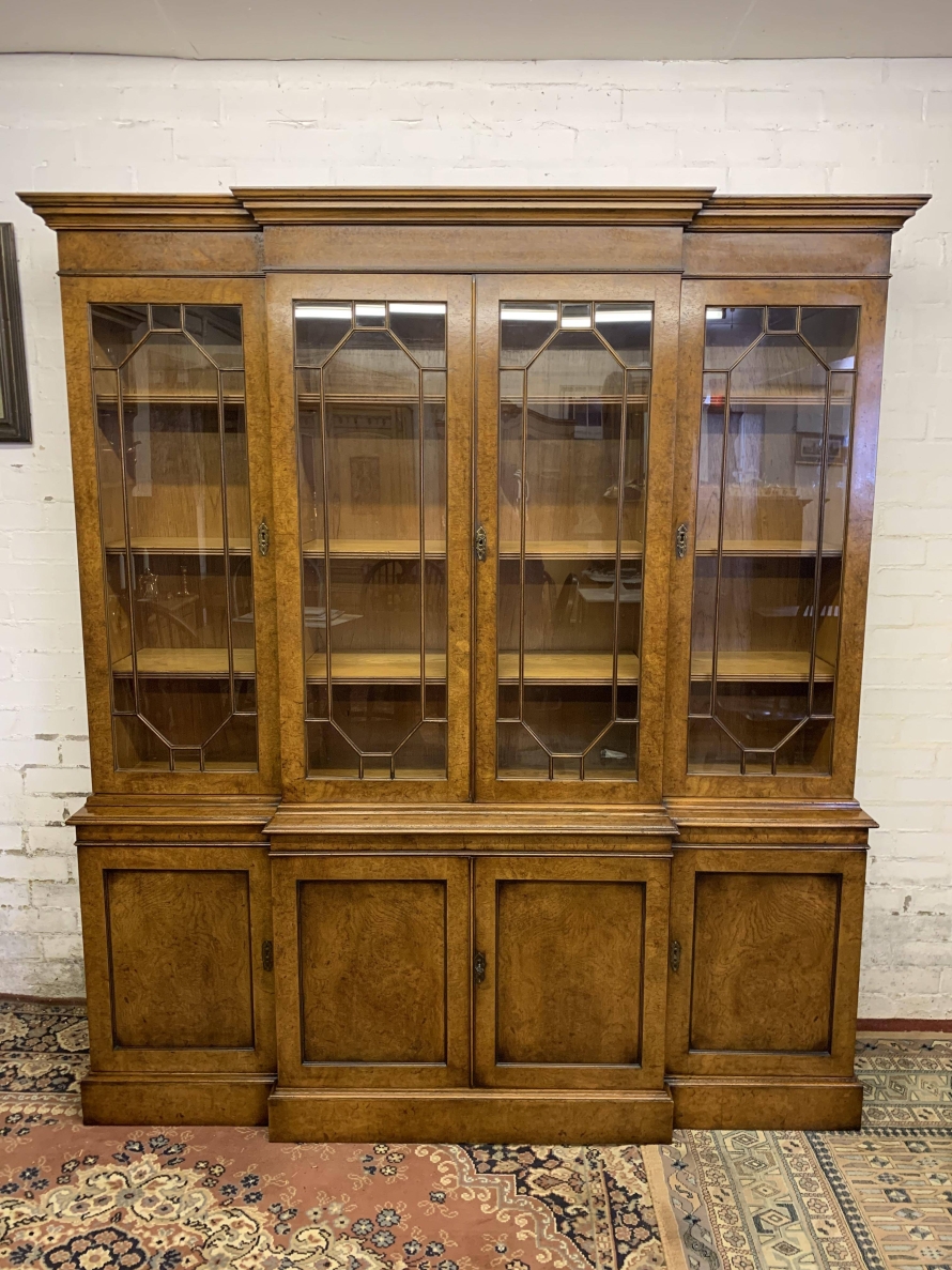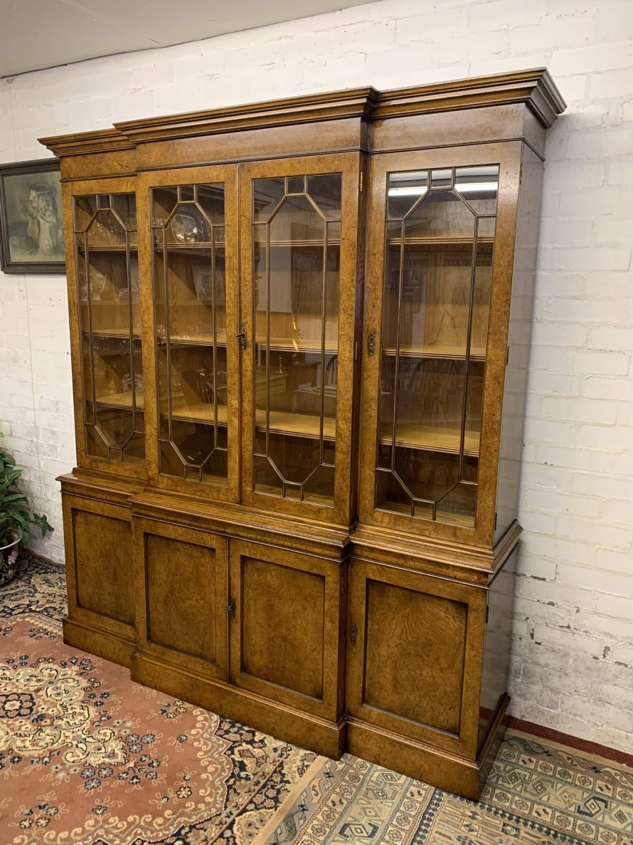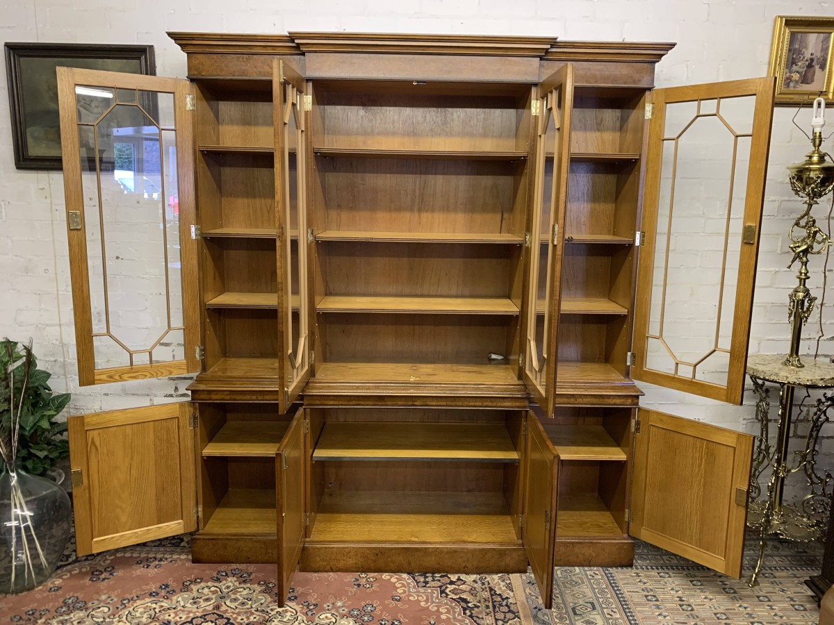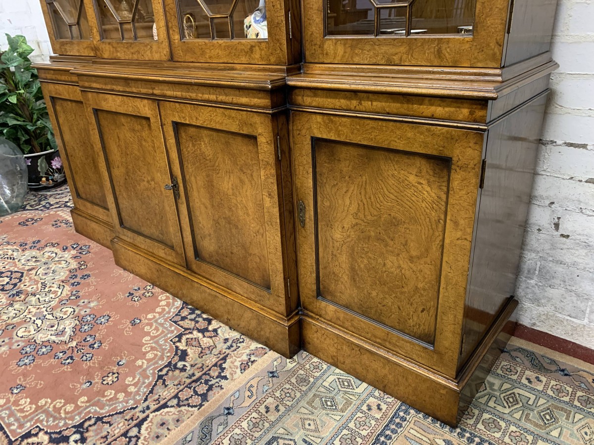 This quality library bookcase is made from striking walnut and is in excellent condition. The oversailing top sits above four lockable glazed doors. The two central doors are brakefront. The doors open to reveal three adjustable and removable shelves. Below are four recessed panelled lockable doors, the central pair of doors are brakefront. The doors open to reveal a removable shelf. This fabulous library bookcase stands on a plinth base. Please note the bookcase splits into two sections.