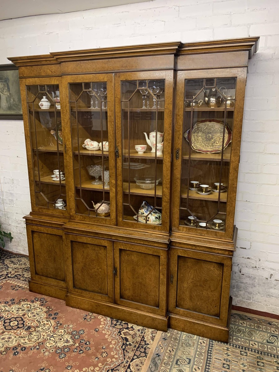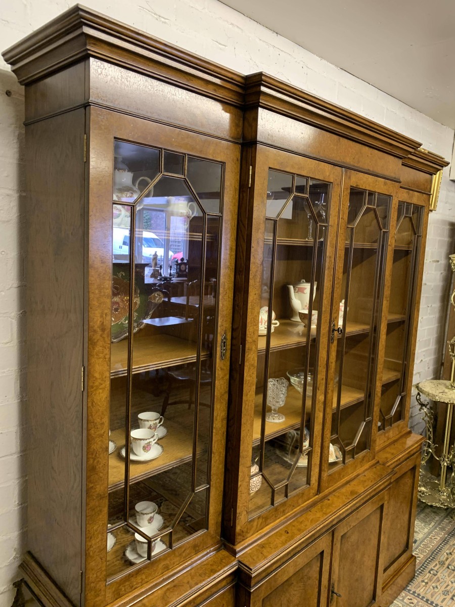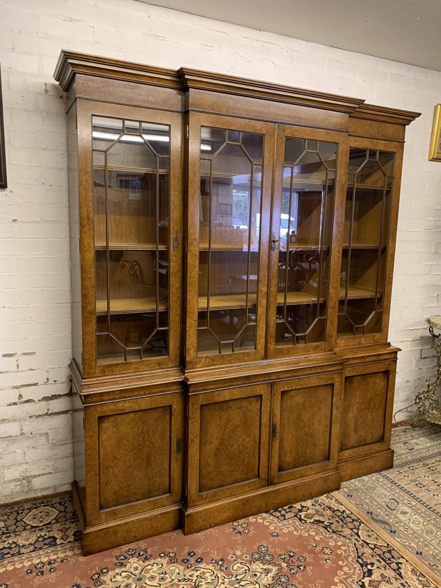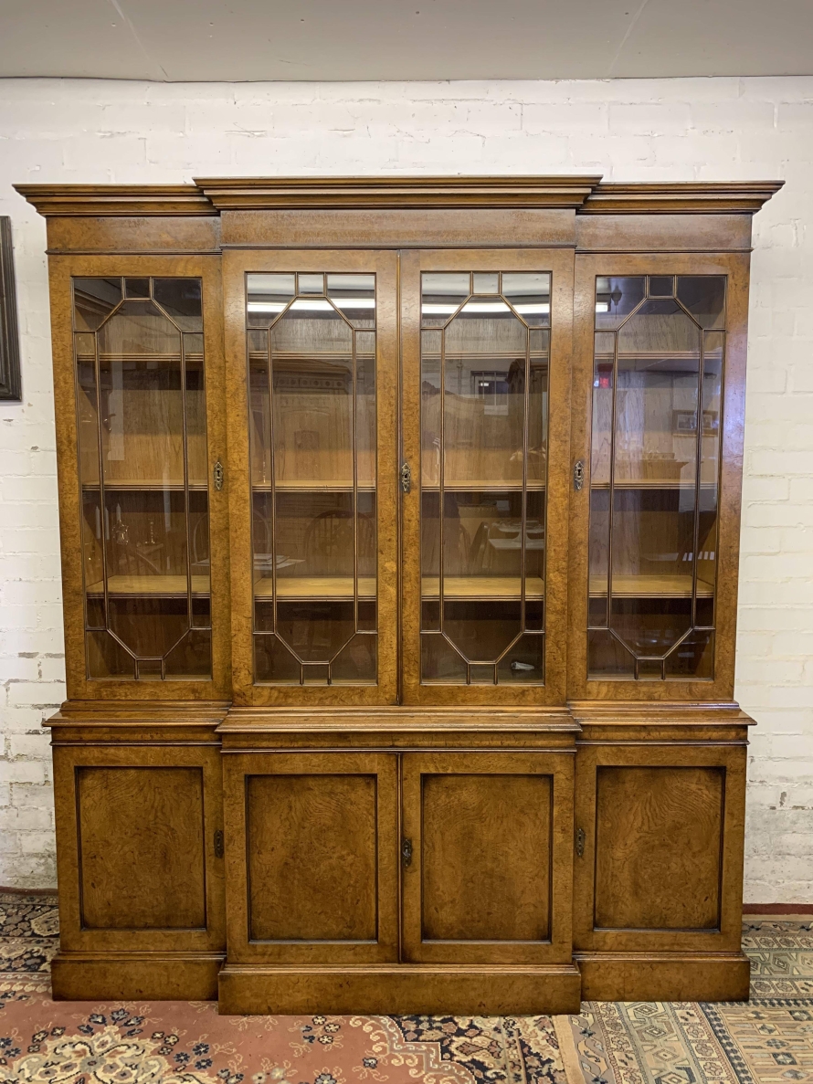 This quality library bookcase is made from striking walnut and is in excellent condition. The oversailing top sits above four lockable glazed doors. The two central doors are brakefront. The doors open to reveal three adjustable and removable shelves. Below are four recessed panelled lockable doors, the central pair of doors are brakefront. The doors open to reveal a removable shelf. This fabulous library bookcase stands on a plinth base. Please note the bookcase splits into two sections.