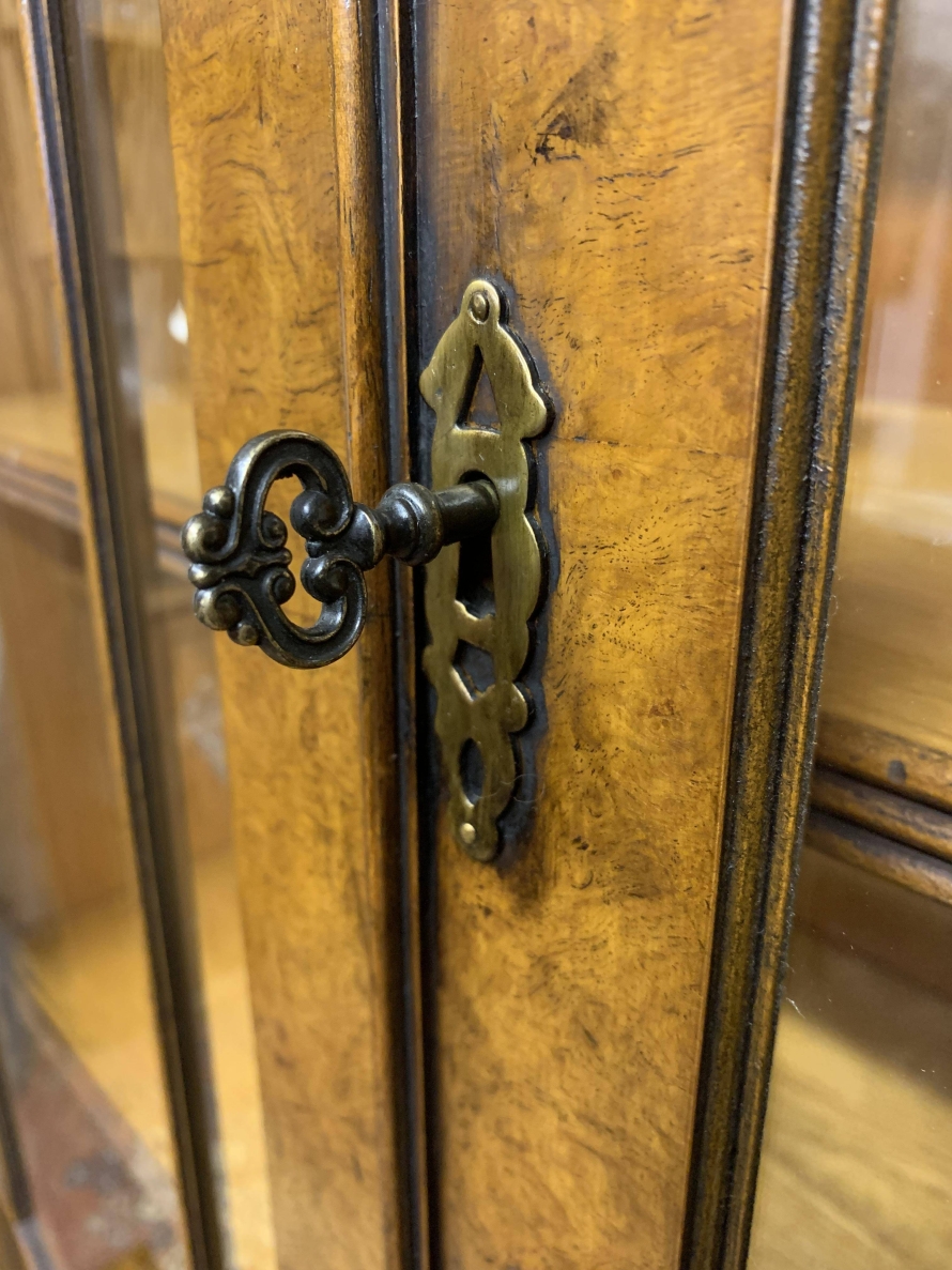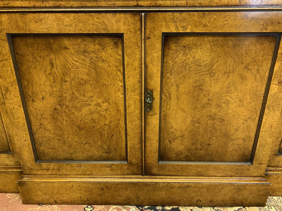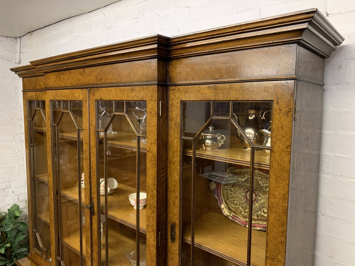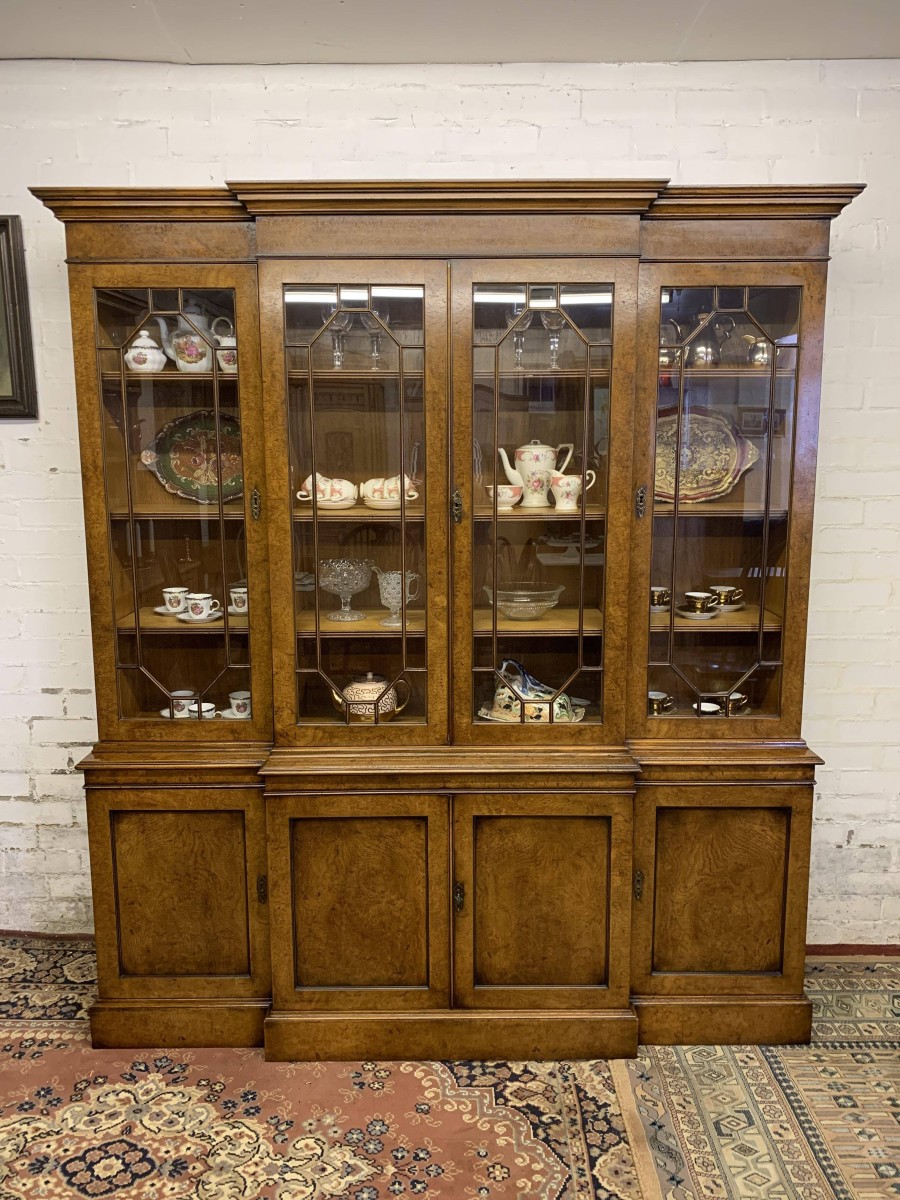 This quality library bookcase is made from striking walnut and is in excellent condition. The oversailing top sits above four lockable glazed doors. The two central doors are brakefront. The doors open to reveal three adjustable and removable shelves. Below are four recessed panelled lockable doors, the central pair of doors are brakefront. The doors open to reveal a removable shelf. This fabulous library bookcase stands on a plinth base. Please note the bookcase splits into two sections.